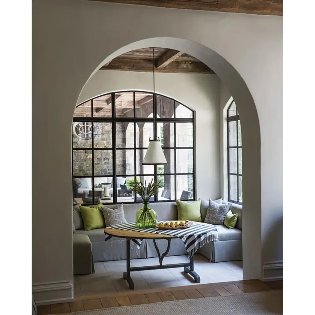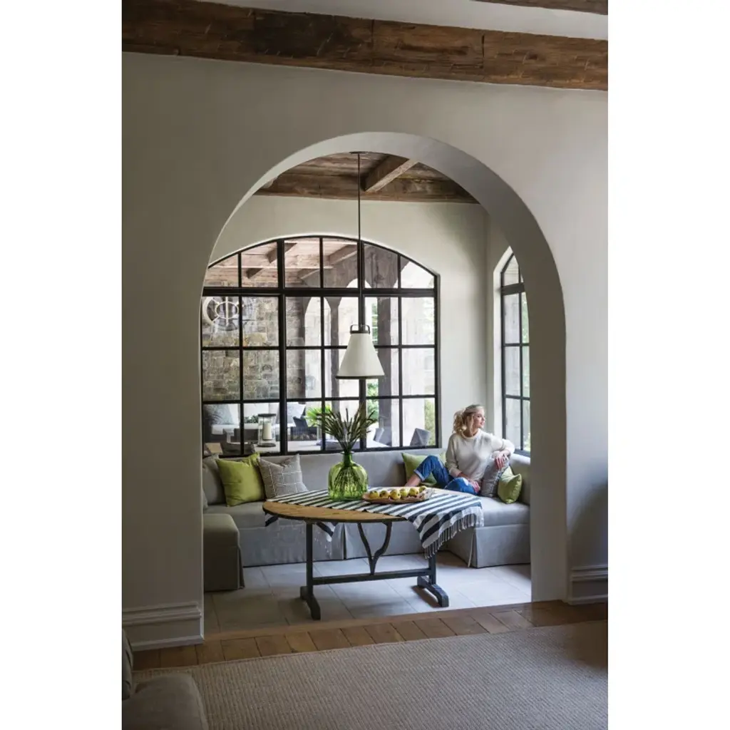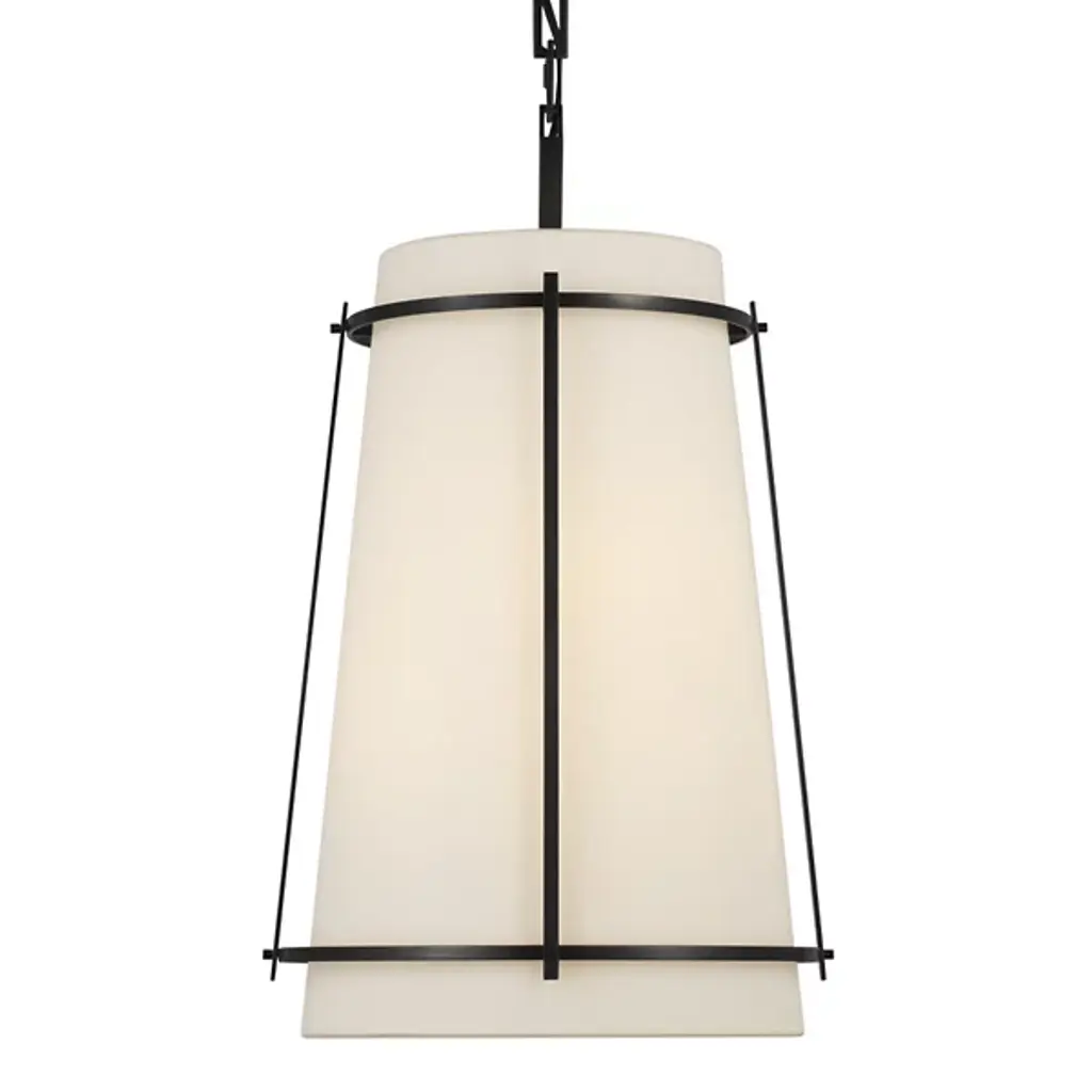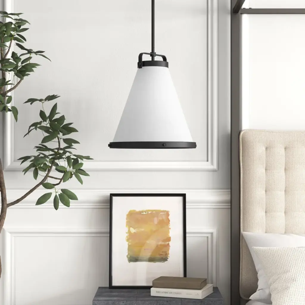 This single-light pendant instantly adds a modern vibe to your kitchen island or bedroom with its angular design. It's crafted with a gleaming metal frame around a cone-shaped, fabric shade for a tailored look, and it uses one 60W bulb (sold separately) to shine downward light over your space. This hard-wired fixture hangs from an adjustable downrod, so you can choose the right height for your space. Plus, it's compatible with a sloped-ceiling adapter.