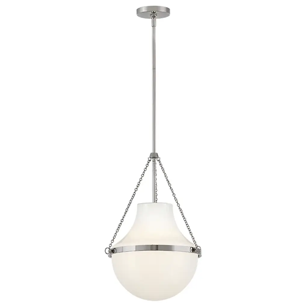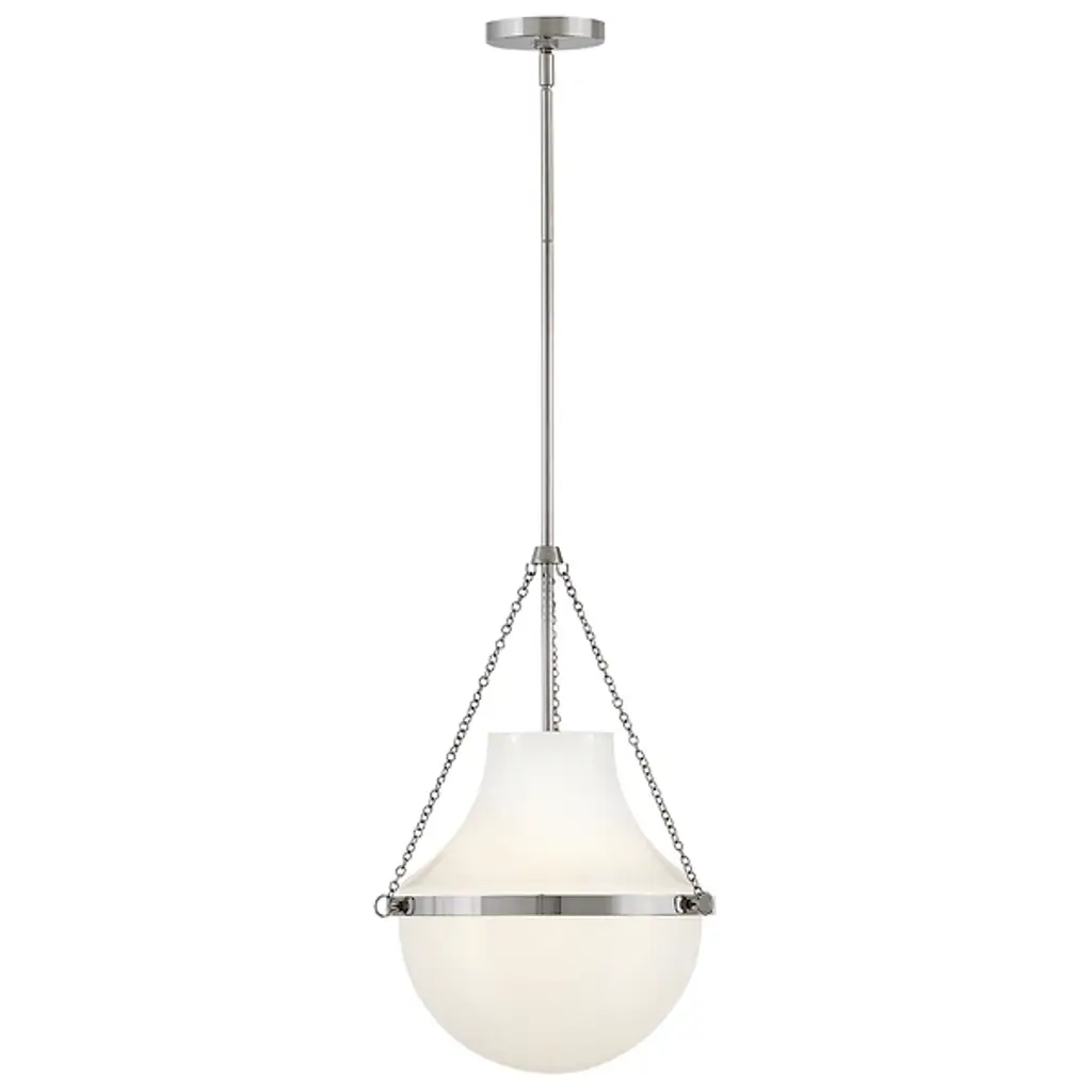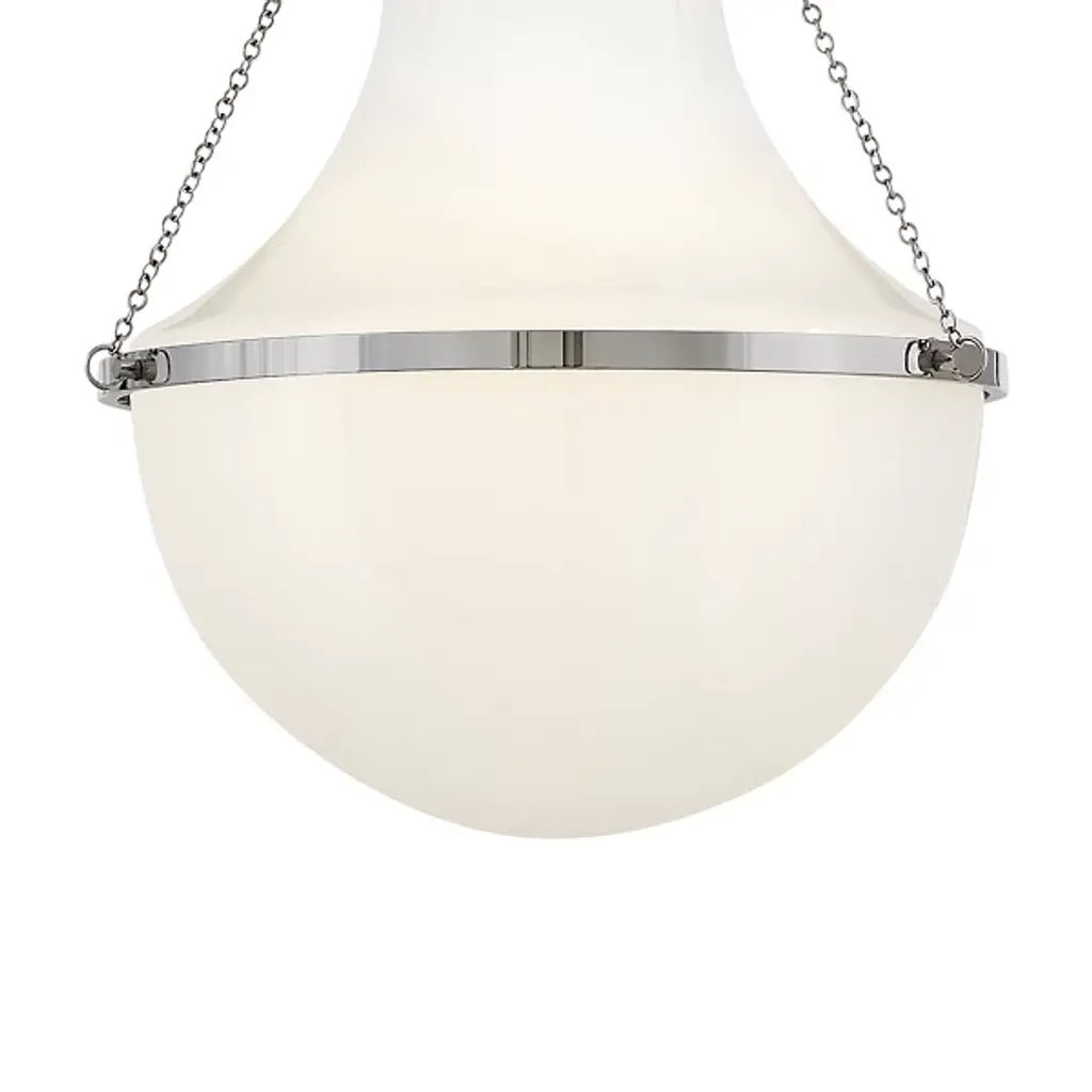 The Collins Pendant from Hinkley seamlessly blends a sculpted, modern form with classically inspired details. The luminaire showcases a transitional teardrop shade meticulously crafted from blown, cased opal glass. Accentuating its design is a central metal band and delicate chain uprights, creating an elegant fusion of contemporary aesthetics and timeless style. Illuminate your space with the versatile and sophisticated Collins, where the marriage of modern and classic elements results in a truly captivating lighting solution.
