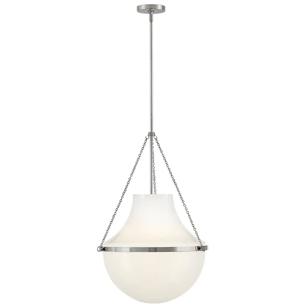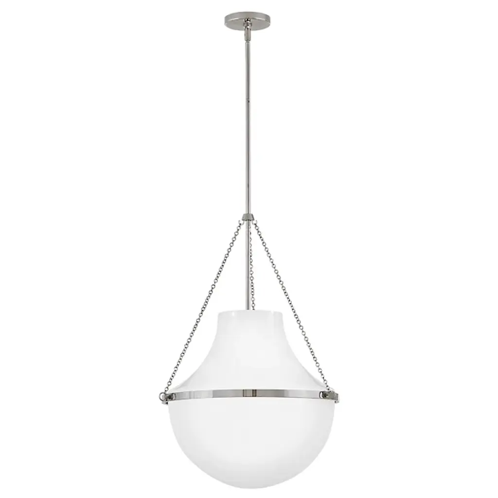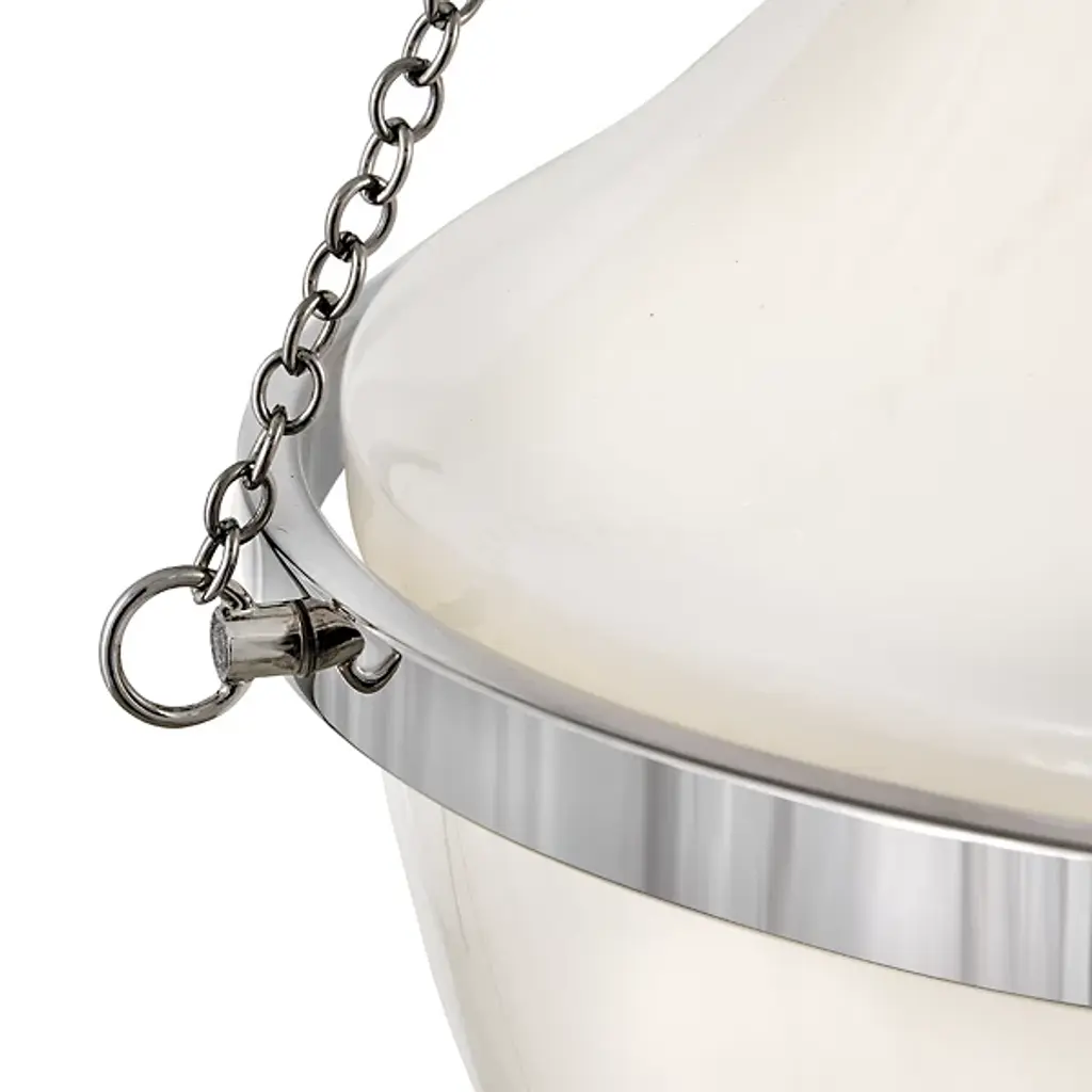 The Collins Pendant from Hinkley seamlessly blends a sculpted, modern form with classically inspired details. The luminaire showcases a transitional teardrop shade meticulously crafted from blown, cased opal glass. Accentuating its design is a central metal band and delicate chain uprights, creating an elegant fusion of contemporary aesthetics and timeless style. Illuminate your space with the versatile and sophisticated Collins, where the marriage of modern and classic elements results in a truly captivating lighting solution.