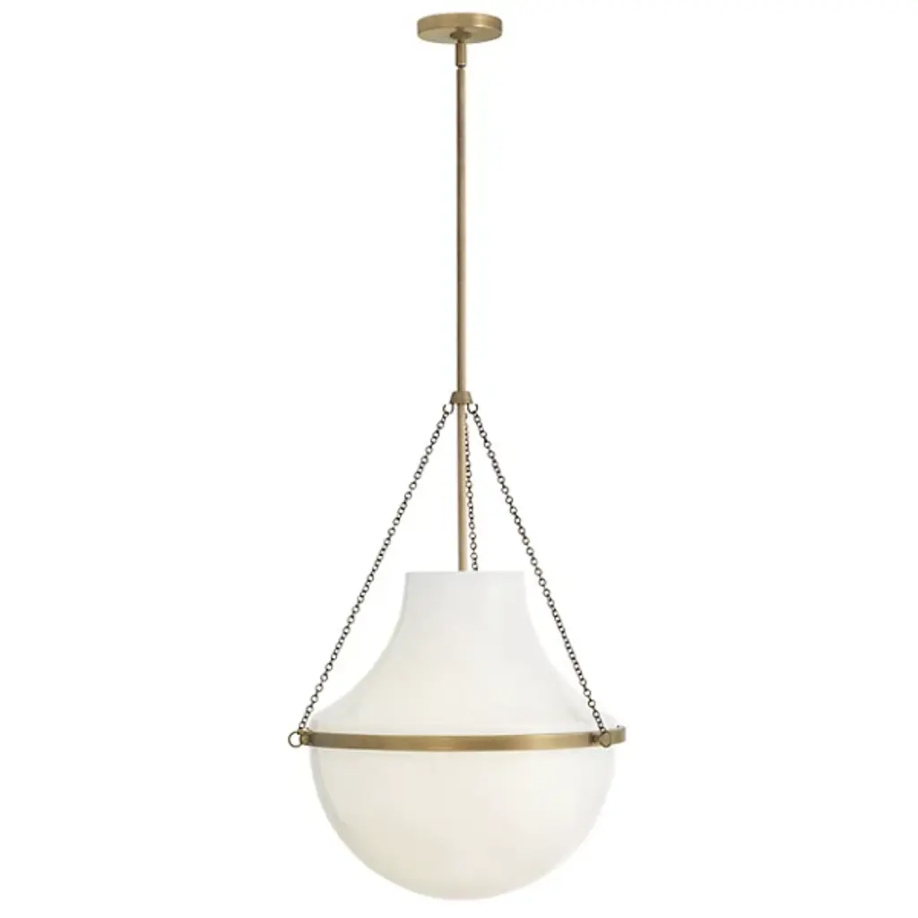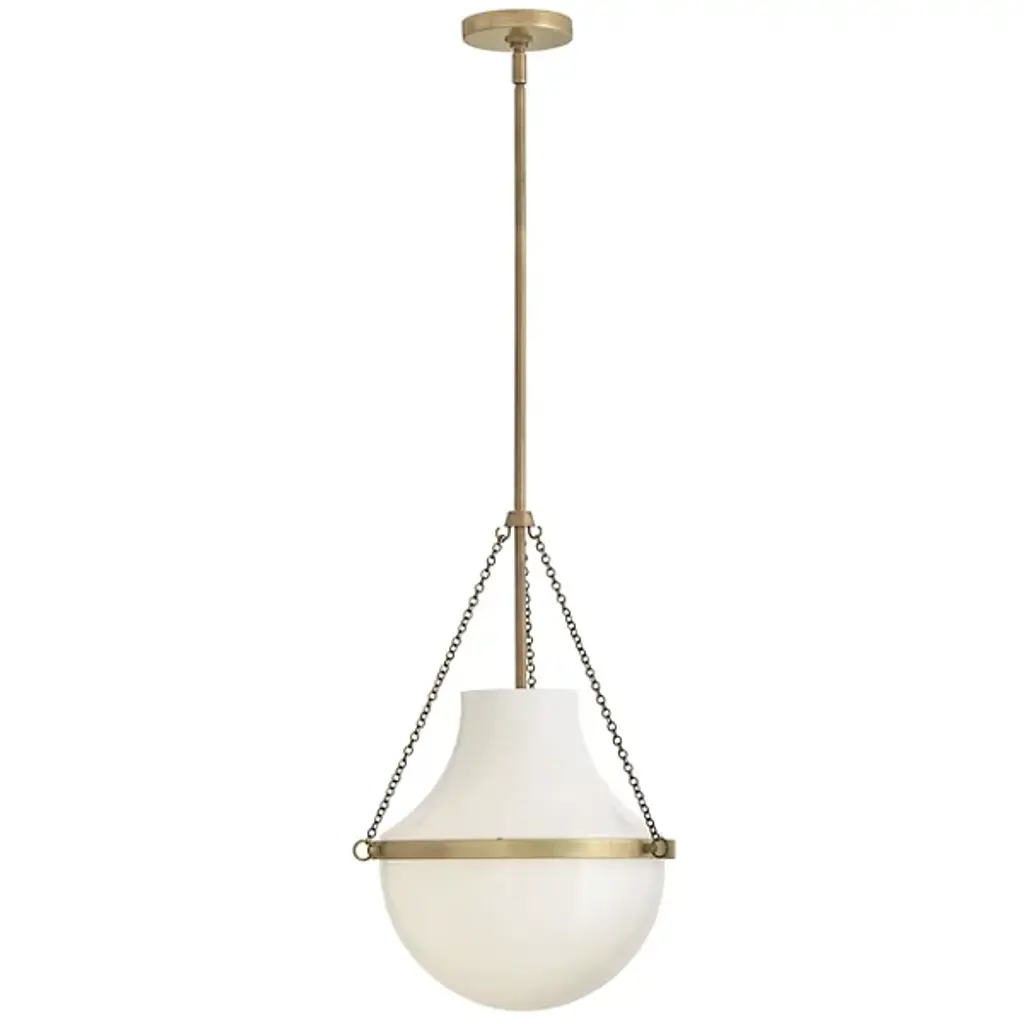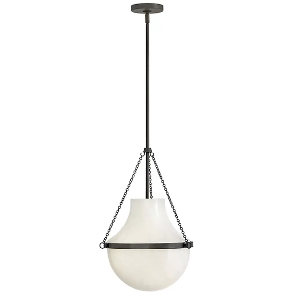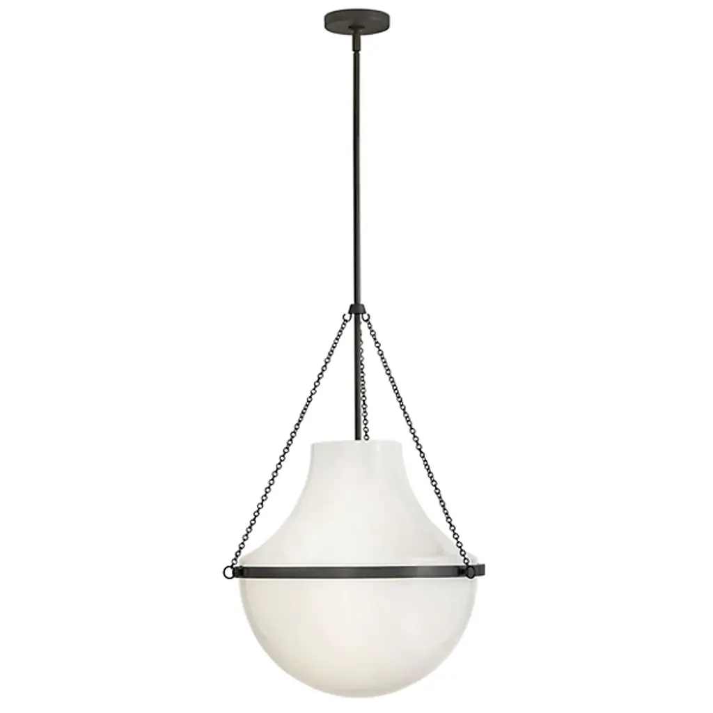 The Collins Pendant from Hinkley seamlessly blends a sculpted, modern form with classically inspired details. The luminaire showcases a transitional teardrop shade meticulously crafted from blown, cased opal glass. Accentuating its design is a central metal band and delicate chain uprights, creating an elegant fusion of contemporary aesthetics and timeless style. Illuminate your space with the versatile and sophisticated Collins, where the marriage of modern and classic elements results in a truly captivating lighting solution.