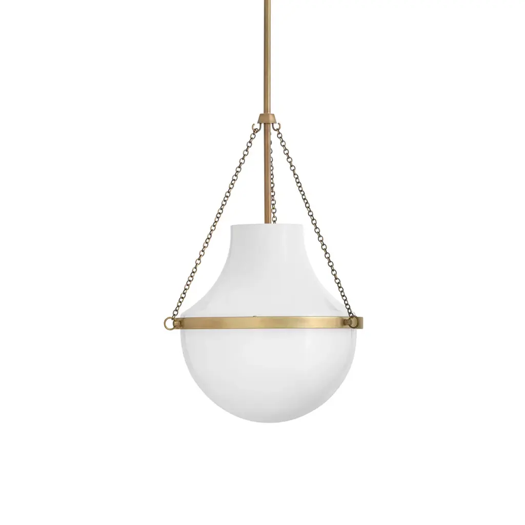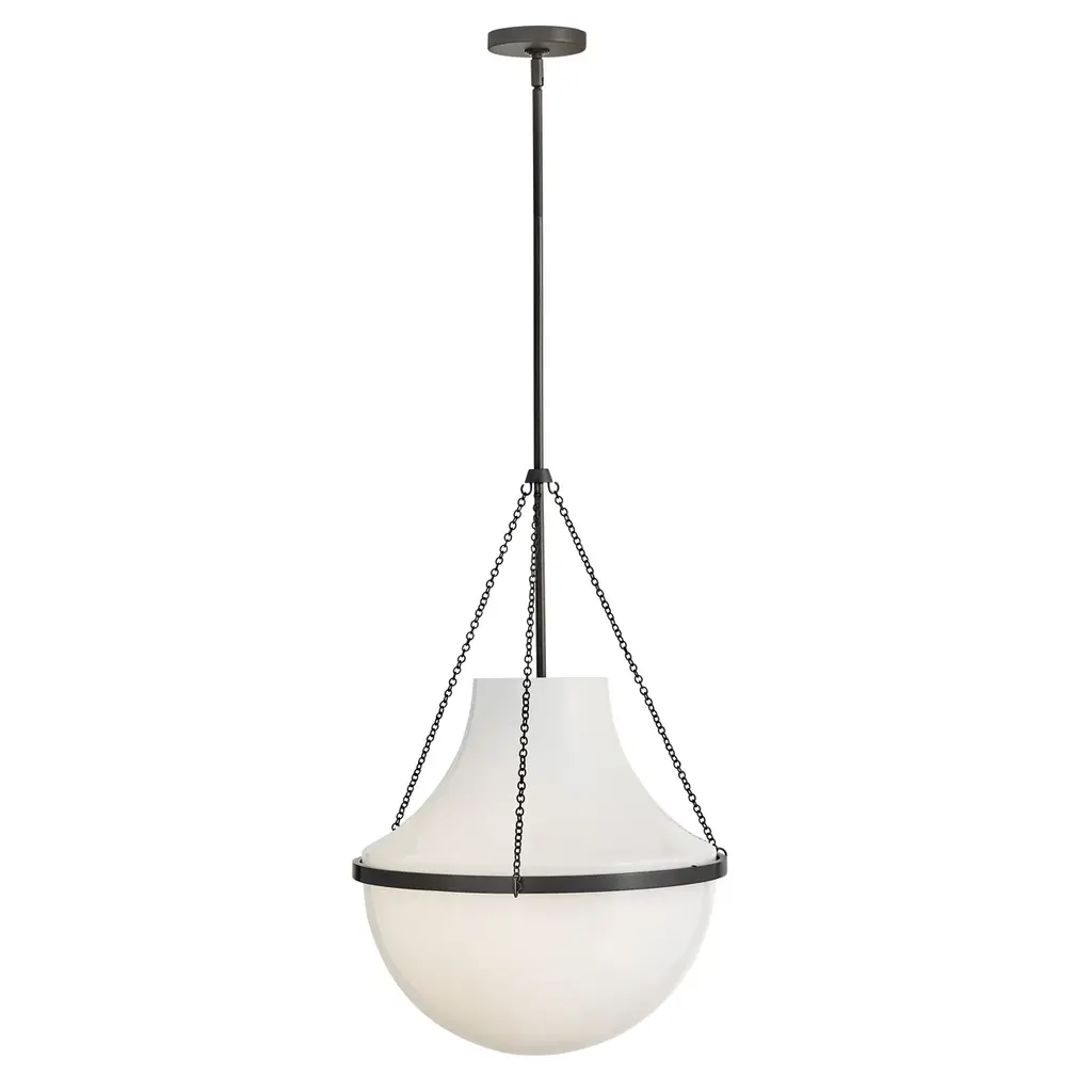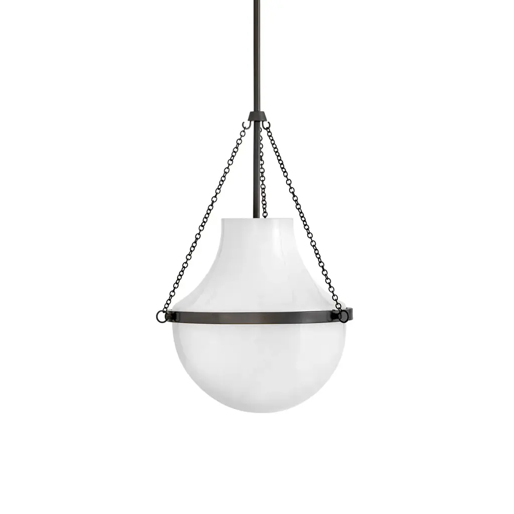 Fusing a sculpted, modern form with classically styled details, Collins features a transitional teardrop shade crafted from blown, cased opal glass. A central metal band and delicate chain uprights are available in Heritage Brass or Black Oxide finishes. Features