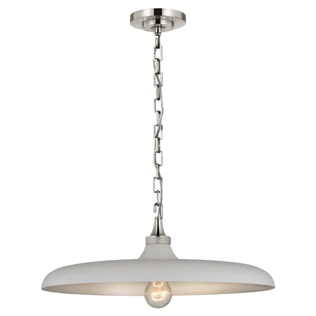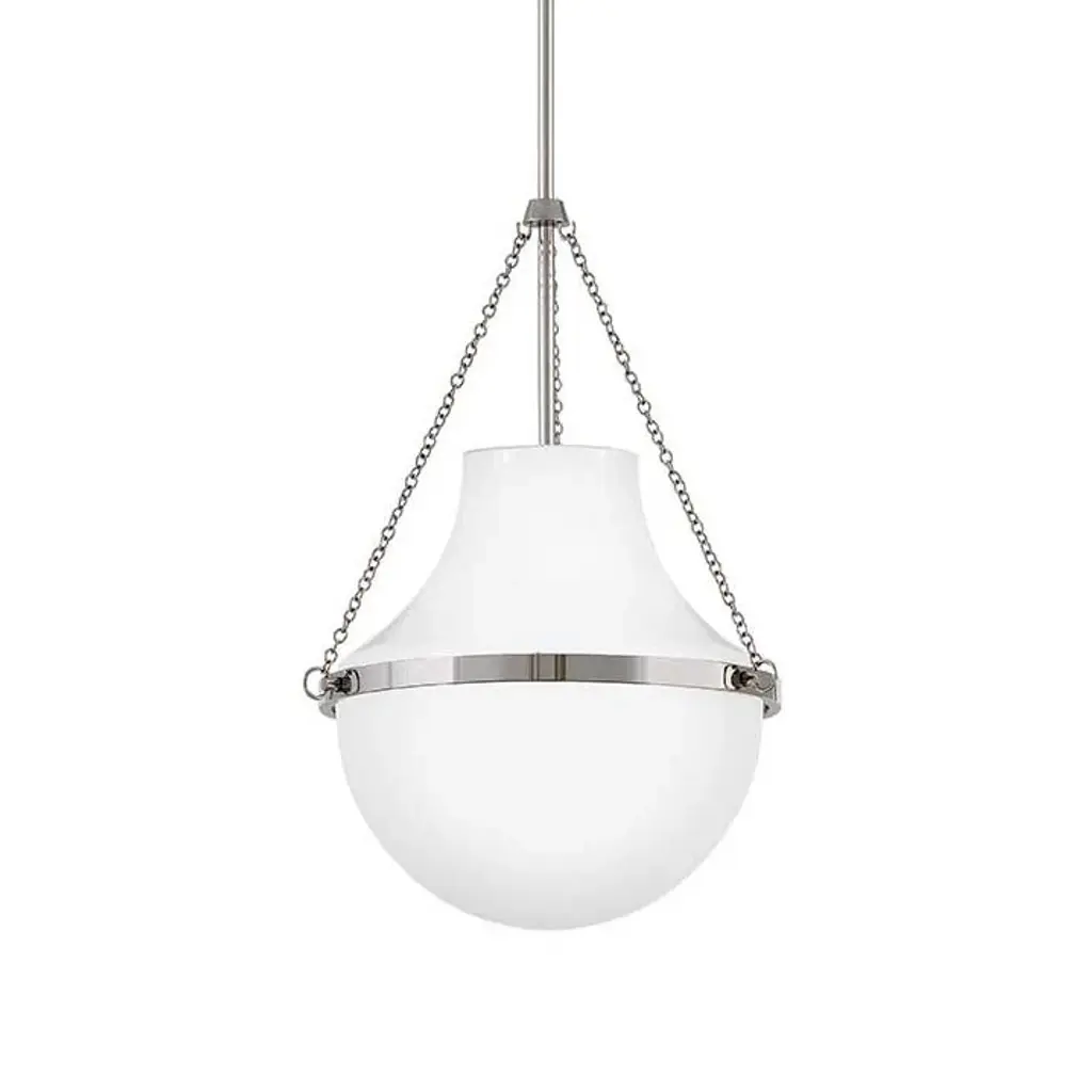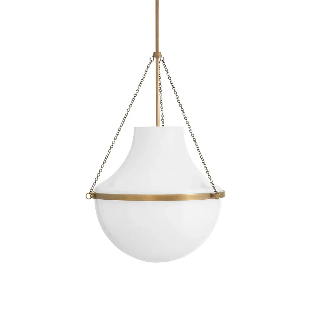 Fusing a sculpted, modern form with classically styled details, Collins features a transitional teardrop shade crafted from blown, cased opal glass. A central metal band and delicate chain uprights are available in Heritage Brass or Black Oxide finishes. Features