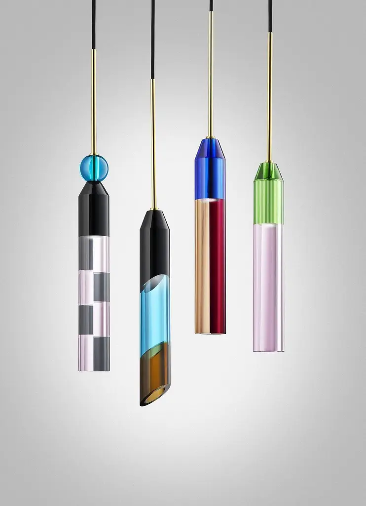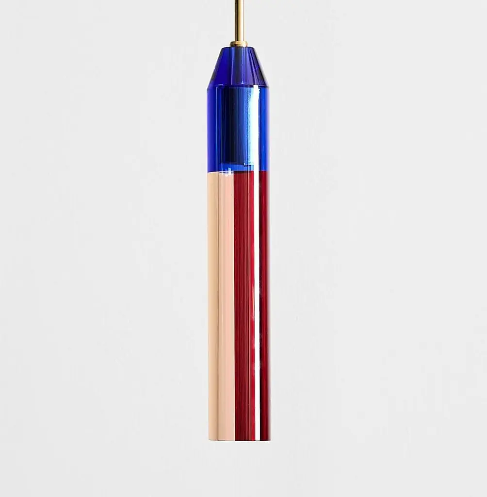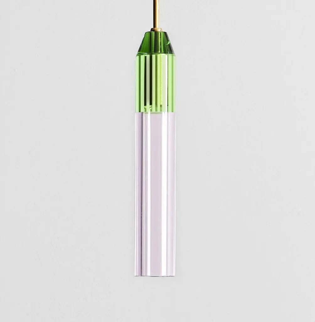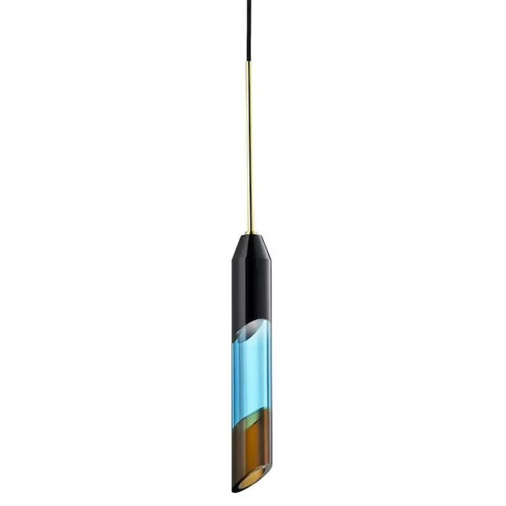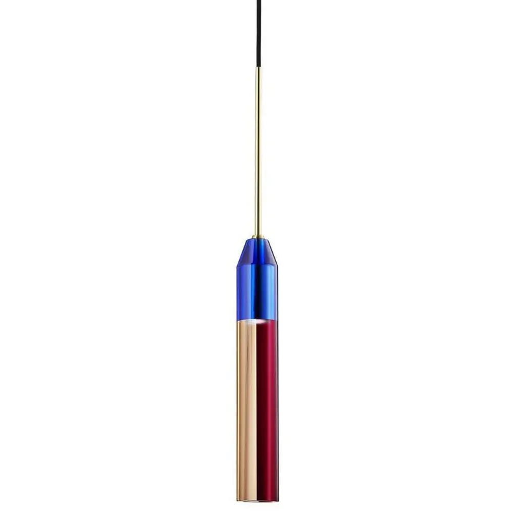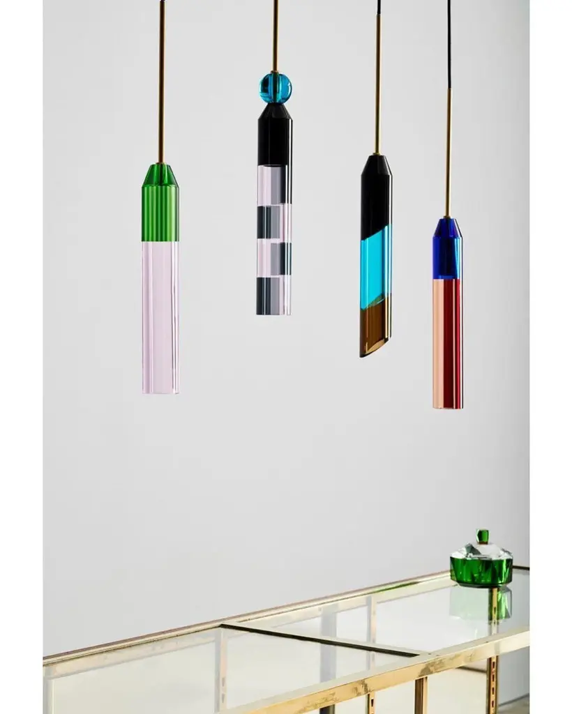Colorful crystal pendant lamp, hand-sculpted contemporary crystalHand-sculpted in crystalMeasures: Height 35 cmWidth 5.8 cmWeight 1.3 kgMaterial: fine handcut crystal and brass coated ironWith blasting colour combinations, a brave pattern mix, and sharp cut crystal these pendants moves in a field of excitement between decadence and theater. A series of lamps which push the norms and seduces its audience with the crystals magical reflections.