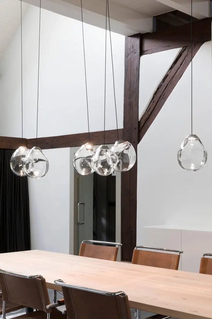 Double momentum blown glass pendants by Alex de WitteDimensions: 30- 40 cmMaterials: Mouth blown glassDimensions may vary.With the Momentum Alex de Witte has found the prefect artistic defining moment while playing with the boundaries of glass blowing in yet another dimension. He's frozen a significant moment in time in which he invites the beholder to ask himself a multitude of questions. Here Alex plays with the suggestion of perpetual motion. This 'moment of meaningful suspense' is like the key to free the imagination of the viewer. You can't help it but curious; you can't help it but fill in the gaps (...). All our lamps can be wired according to each country. If sold to the USA it will be wired for the USA for instance.Alex de Witte is fascinated by the universal value of beauty and how to influence that. “It is fascinating to me how people have an overall communal perception of beauty. Like scientific studies have proven over the years, symmetry, repetition, balance and harmony with nature affect people’s IDEA of perfectness. As a designer it is my quest to try to influence the phenomenon of beauty being found in the beholder’s eye. I aim to play with general perception of beauty and to open up peoples minds in that process.” Alex de Witte constantly forces his own perspective and consequently that of the beholder’s, by twisting the perception of shape and form. Alex is pushing the boundaries of catching the perfect moment in the process of a new work. Is it the so called pregnant moment or the moment right after or even before, which shapes the perfect form? Exactly that playful balance in the process of each work, is what he translates into the ‘initial moment of things’. Every time, Alex first determines strict boundaries within a new design process. After this realm is set considering these limitations, he is searching for the right symmetry and balance that will determine the final form of the new design.All our lamps can be wired according to each country. If sold to the USA it will be wired for the USA for instance.