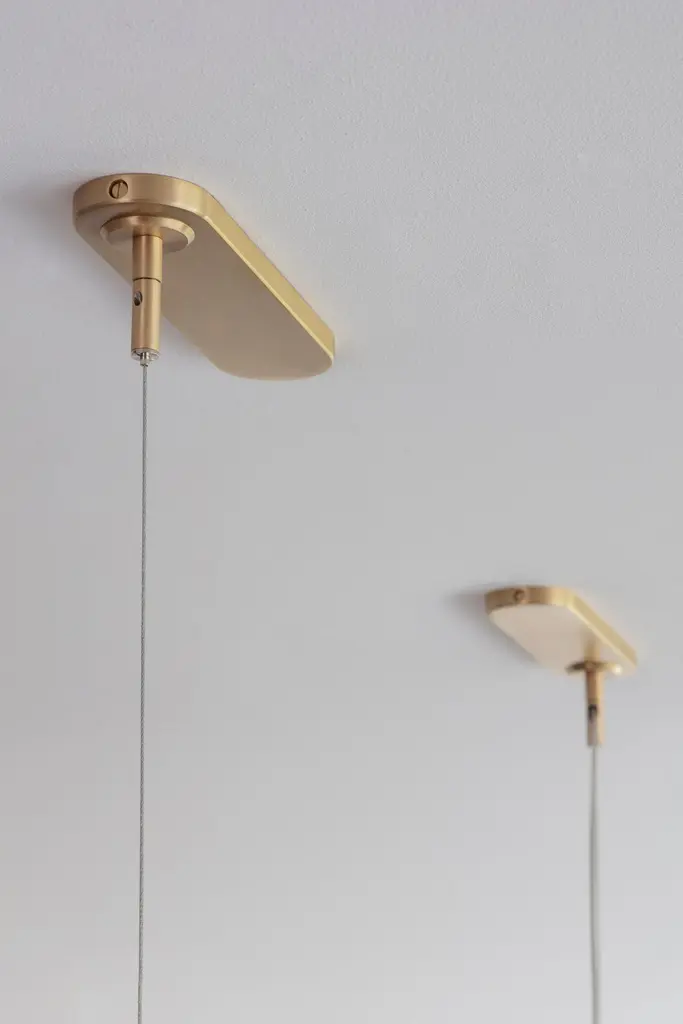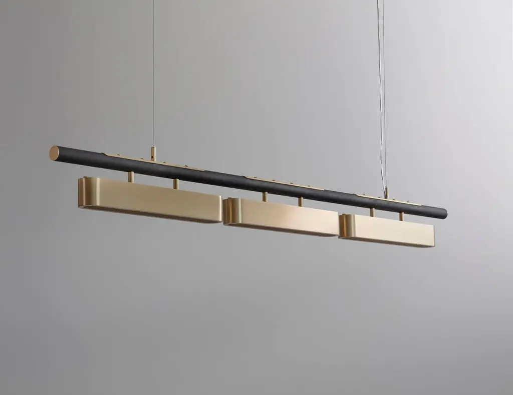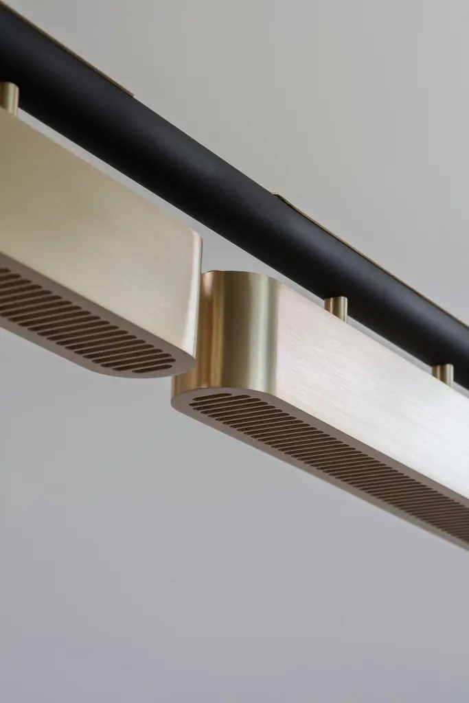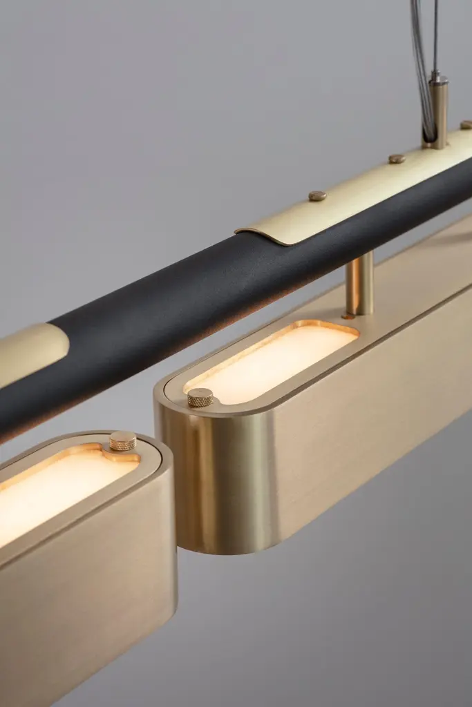 Colt pendant light triple by Bert FrankDimensions: 20 x 140 x 12 cmMaterials: Brass, bronze Brushed brass lacquered as standard, custom finishes availableAll our lamps can be wired according to each country. If sold to the USA it will be wired for the USA for instance.Machined almost entirely from solid brass or copper, this geometric light offers contrasts in materials and textures to create a bold statement. The Aegis wall light is available in both right and left hand versions so it can be styled as opposing pairs.When Adam Yeats and Robbie Llewellyn founded Bert Frank in 2013 it was a meeting of minds and the start of a collaborative creative partnership with engineering at the core.Both men share a love of design and deep respect for the heritage of British engineering. Both wanted to create high-end products that would Stand the test of time and fly in the face of throwaway consumerism. The partnership has resulted in award-winning lighting and accessories that fuse the integrity of the small-scale workshop with timeless aesthetics reimagined for today.The two men work closely together from concept to end product. Robbie’s imagination and occasional flights of fancy are informed by Adam’s understanding of engineering principles and fabrication techniques. Equally, Adam's designs are often the starting point for a collection. In that sense Bert Frank is a true creative collaboration. As a result, every designed is honed to perfection, every detail carefully considered.