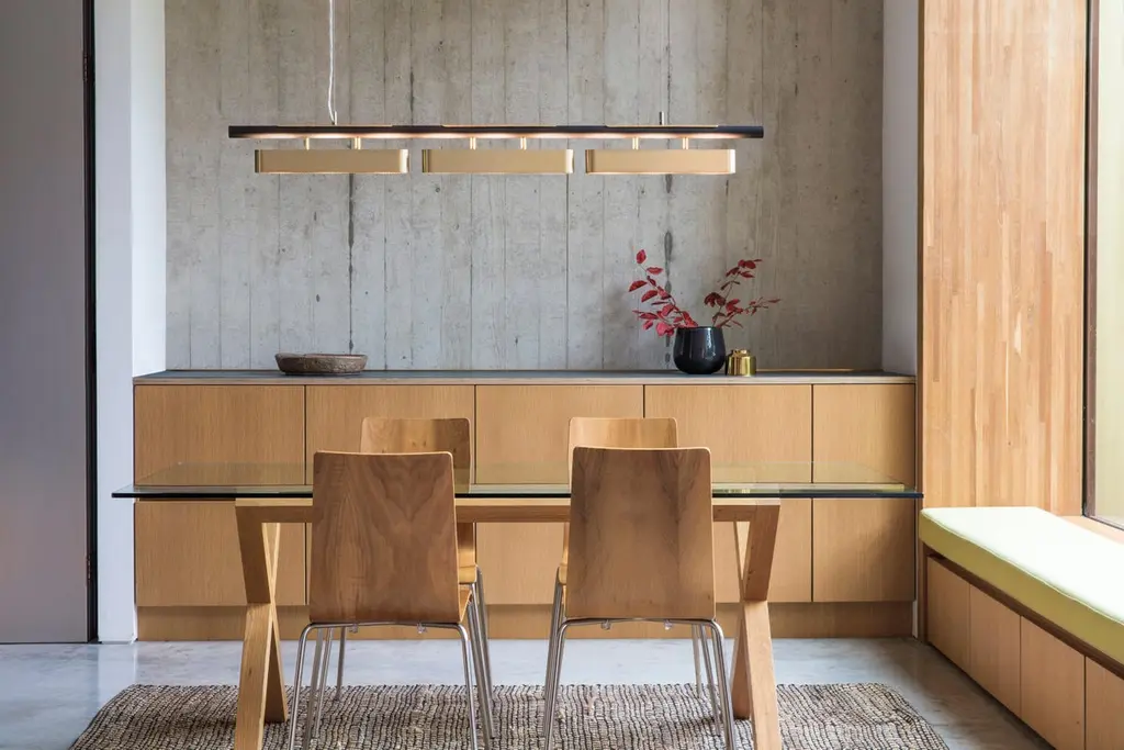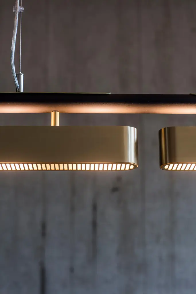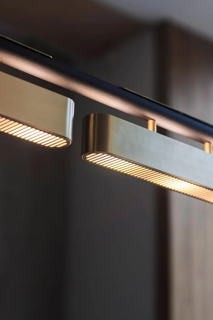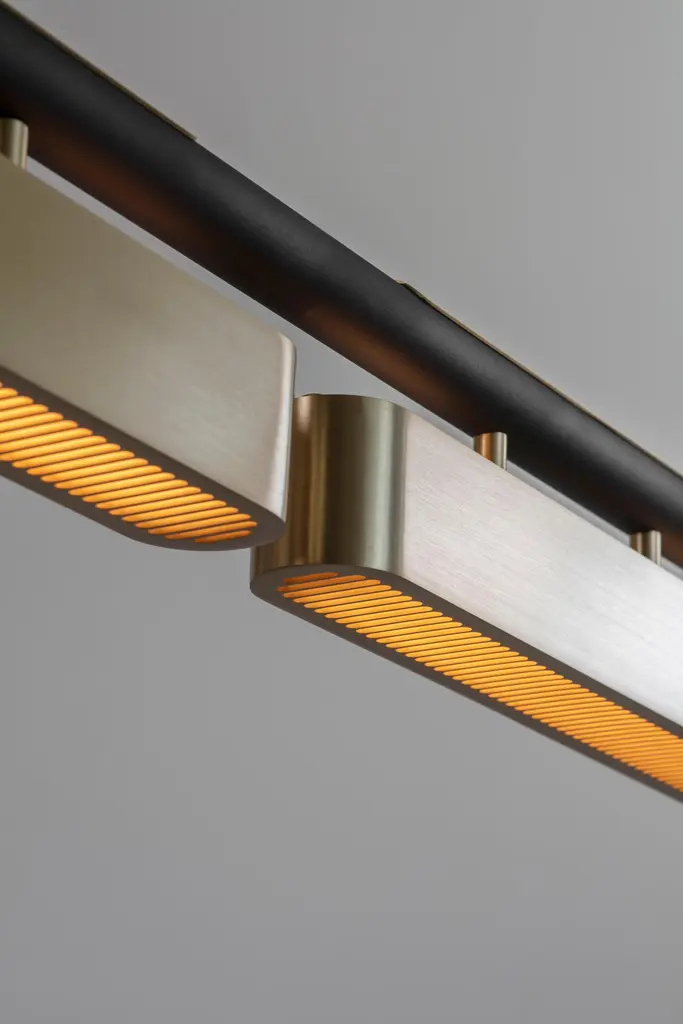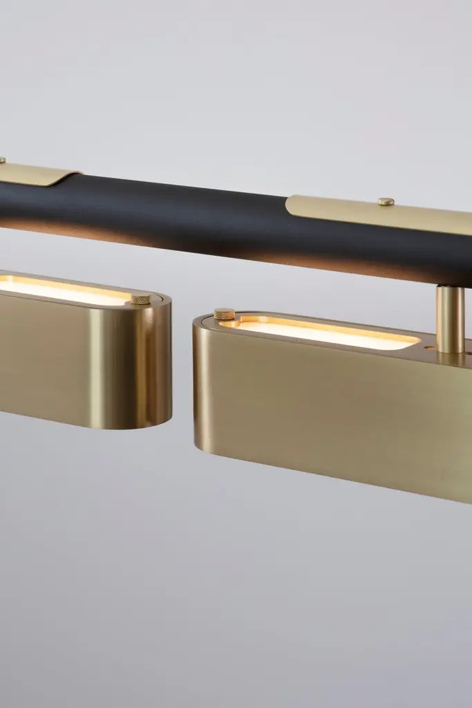 Colt pendant light triple by Bert FrankDimensions: 20 x 140 x 12 cmMaterials: Brass, bronze Brushed brass lacquered as standard, custom finishes availableAll our lamps can be wired according to each country. If sold to the USA it will be wired for the USA for instance.Machined almost entirely from solid brass or copper, this geometric light offers contrasts in materials and textures to create a bold statement. The Aegis wall light is available in both right and left hand versions so it can be styled as opposing pairs.When Adam Yeats and Robbie Llewellyn founded Bert Frank in 2013 it was a meeting of minds and the start of a collaborative creative partnership with engineering at the core.Both men share a love of design and deep respect for the heritage of British engineering. Both wanted to create high-end products that would Stand the test of time and fly in the face of throwaway consumerism. The partnership has resulted in award-winning lighting and accessories that fuse the integrity of the small-scale workshop with timeless aesthetics reimagined for today.The two men work closely together from concept to end product. Robbie’s imagination and occasional flights of fancy are informed by Adam’s understanding of engineering principles and fabrication techniques. Equally, Adam's designs are often the starting point for a collection. In that sense Bert Frank is a true creative collaboration. As a result, every designed is honed to perfection, every detail carefully considered.
