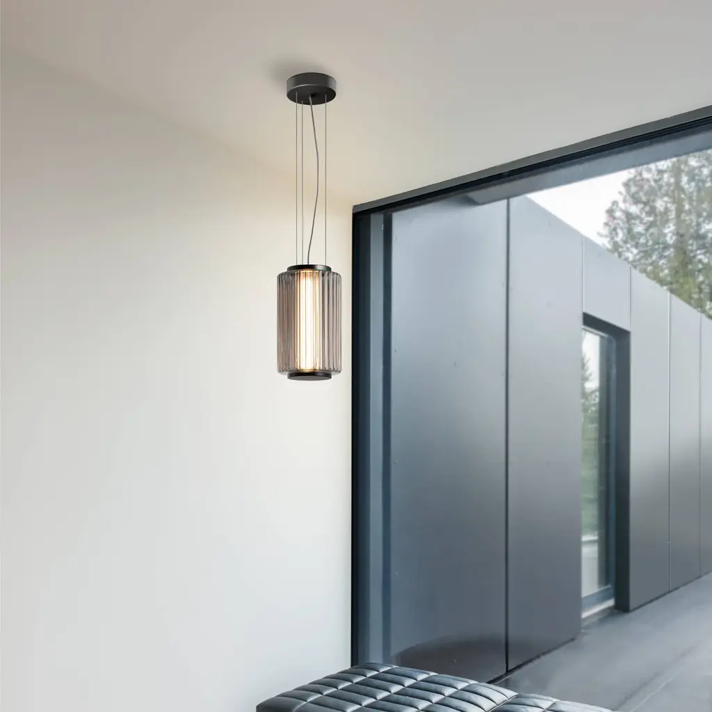 With a faceted surface that alludes to fluting on Grecian temples, Column’s single-module pendant, like its sibling stacked fixtures, makes an impressive lighting statement. A-N-D founder-designer Lukas Peet strings individual machine mold-blown glass segments together with a symmetry that lengthens a space vertically. Offered in either a clear carbon color or a stone-like powdered ivory with aluminum fittings, the luminous cylinder softly diffuses LED illumination in a choice of color temperature valuations.