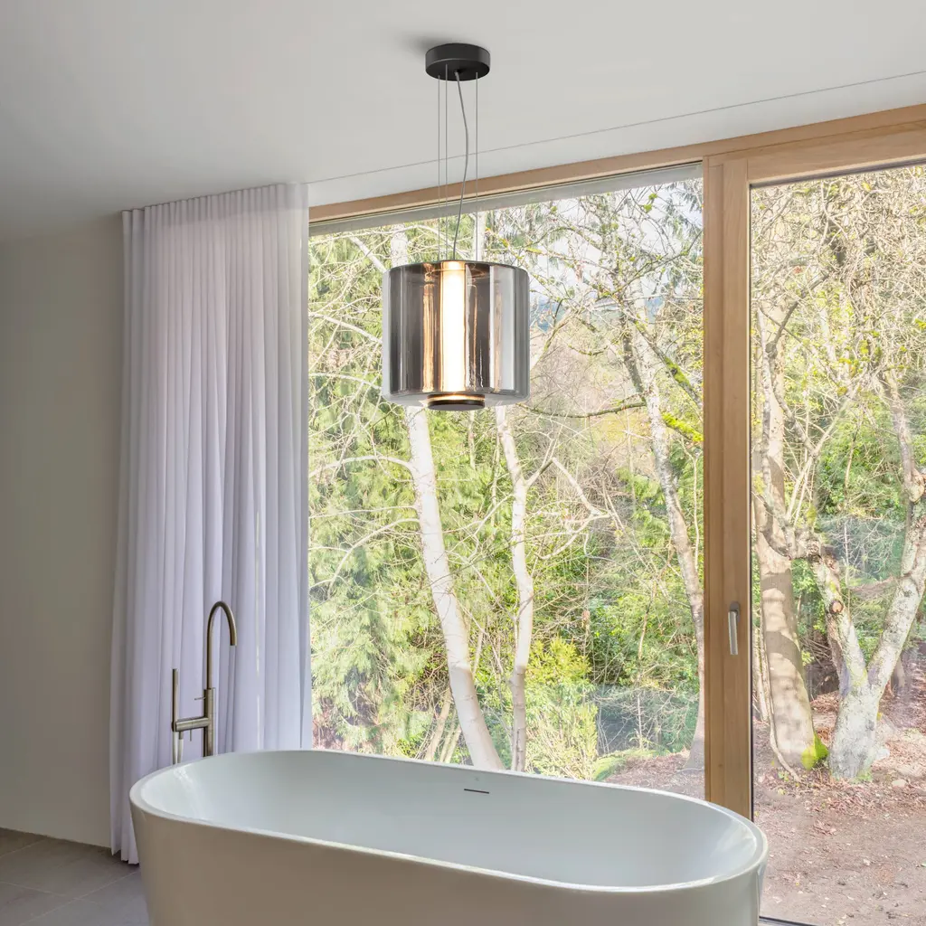 The larger 300 version of Column’s single-module pendant, like its sibling stacked fixtures, brings allure with its fluted surface inspired by ancient Greek temples. A-N-D founder-designer Lukas Peet stacks individual machine mold-blown glass units into a column for statement-making symmetry. Available in either a clear carbon color or a stone-like powdered ivory with aluminum fittings, the luminous cylinder gently diffuses LED illumination in a choice of color temperature.