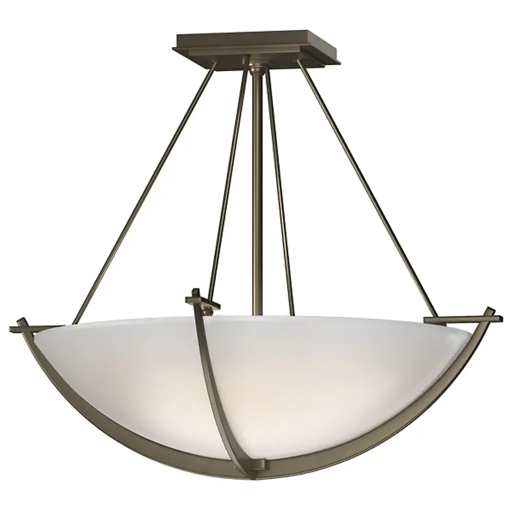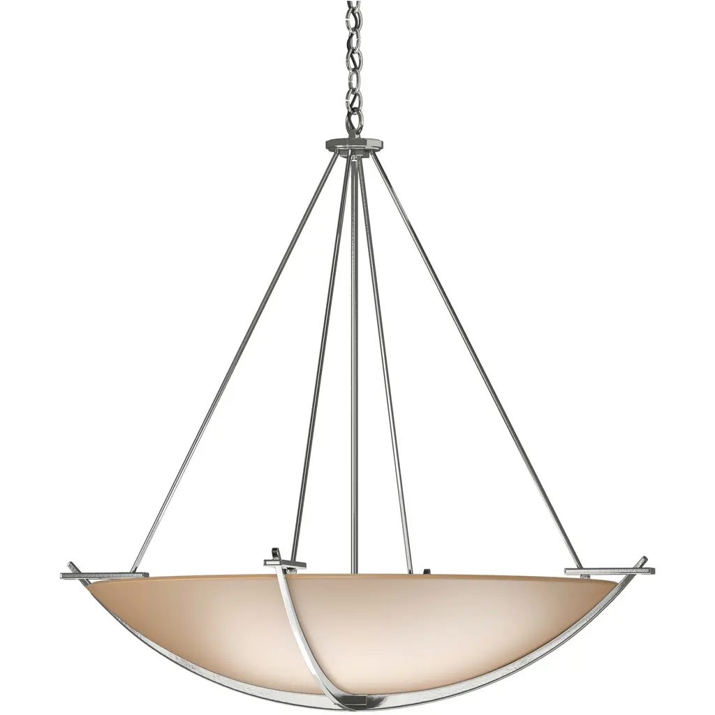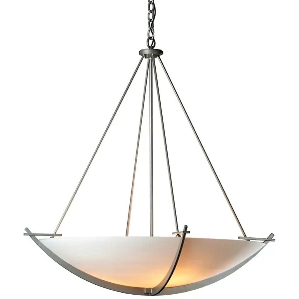 The Compass 194531 Large Scale Pendant by Hubbardton Forge is a handsome, handcrafted addition to spaces. Based on the simple needle compass, one of Hubbardton Forge’s designers was inspired while building a boat and contemplating navigation to create this large-scale piece. Suspended by a linked chain, a spacious glass bowl is cradled within a graceful frame that crisscrosses beneath its form, softly filtering a layer of light through its curved silhouette.
