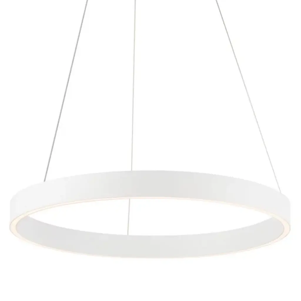 The Conc LED Pendant from George Kovacs floats like a luminous ring in space, with frosted acrylic diffusing light in a perfect circle. Its thin profile belies its powerful LED illumination, which spreads evenly across the entire surface. Above breakfast nooks or clustered in groups, this pendant adds a delicate geometric presence. The dimmable design lets you set just the right brightness for any time of day. Its straightforward form makes it particularly effective in spaces where you want lighting that complements rather than competes with other design elements.