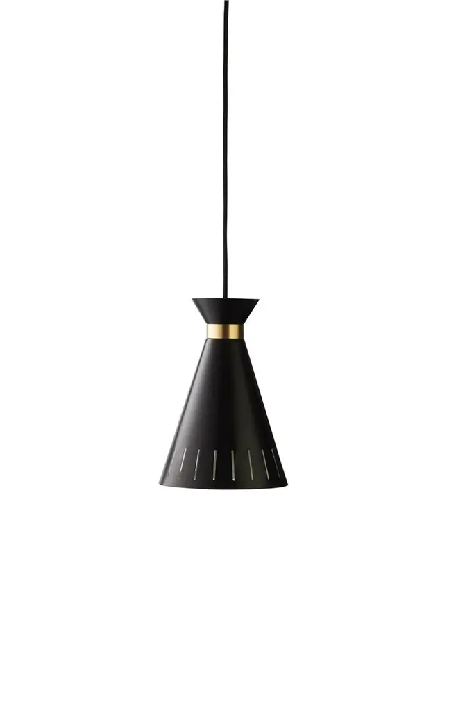 Cone Black Noir Pendant by Warm NordicDimensions: D16x W16 x H23 cmMaterial: Lacquered steel, Solid brassWeight: 1 kgAlso available in different colours. Please contact us.A classic pendant with charm, finesse and an elegant, solid brass ring, designed in the 1950s by the internationally renowned lighting designer, Svend Aage Holm-Sørensen. The rigorous expression means that the Cone pendant can hang beautifully alone or as part of a group, above the dining table or kitchen worktop, or in a dark corner of the living room. In addition to direct lighting, Cone's iconic light grooves along the edge of the metal shade provide an indirect graphic lighting effect, which lends character to the design.Warm Nordic is an ambitious design brand anchored in Nordic design history and with a timeless, aesthetic style that inspires you to appreciate the little things in life. The company is the result of several years’ intense work on developing a new design brand with design history, quality and personality at its core. Warm Nordic boasts a colourful and charming universe of furniture, lamps and accessories full of personality. Our designs encapsulate the Nordic spirit, which in its essence is timeless, inclusive and warm.