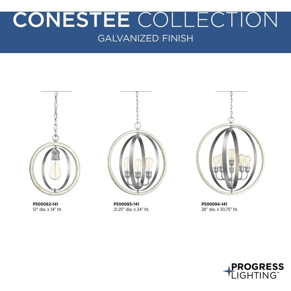 The Conestee mini-pendant collection features a stunning armillary-style frame. Dual tone finish combination of Galvanized with antique white accents While Conestee is ideal for Rustic Farmhouse or Urban Industrial home environments, it can also be paired with a number of Coastal-inspired fixtures to complement natural wood materials.