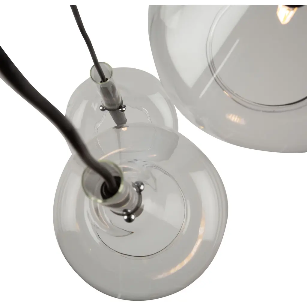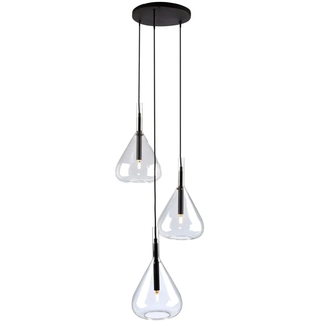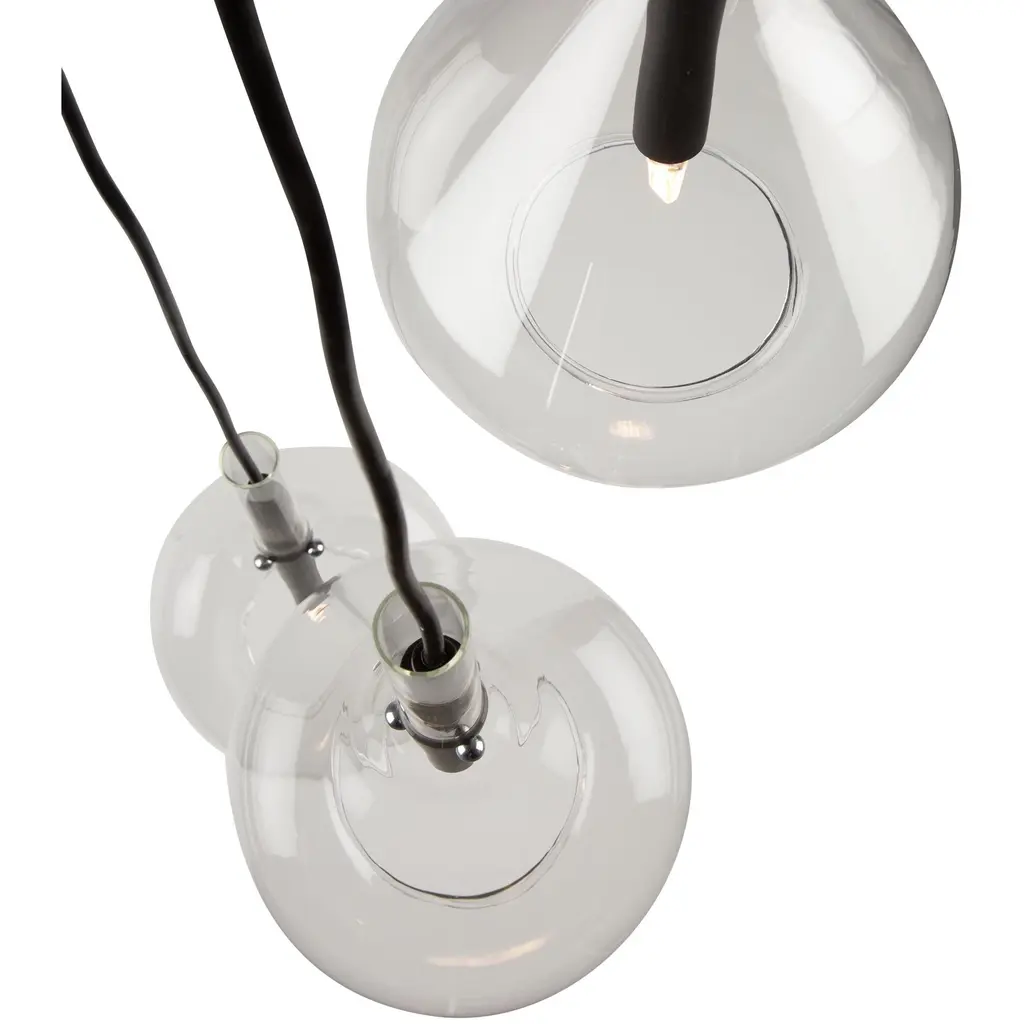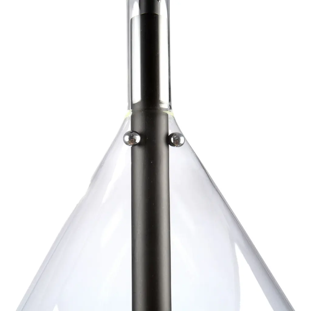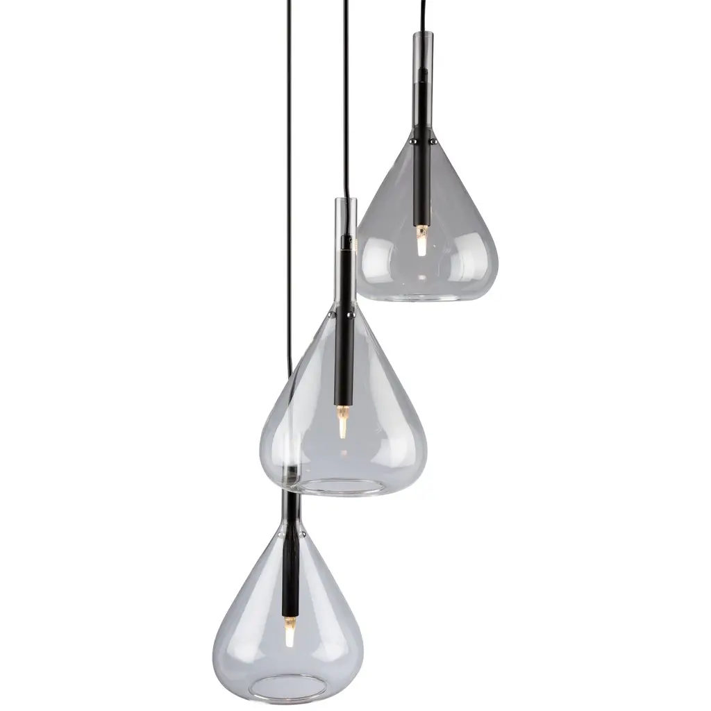 The Conic collection features a uniquely shaped glass design suspended on black frames. The glass is suspended by 3 nickel bullets to give it a floating effect. The bottom of the glass is open for each access to the bulbs. To finish off the design, the wiring has black textile covering.