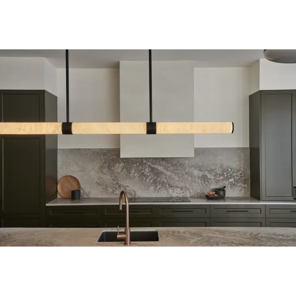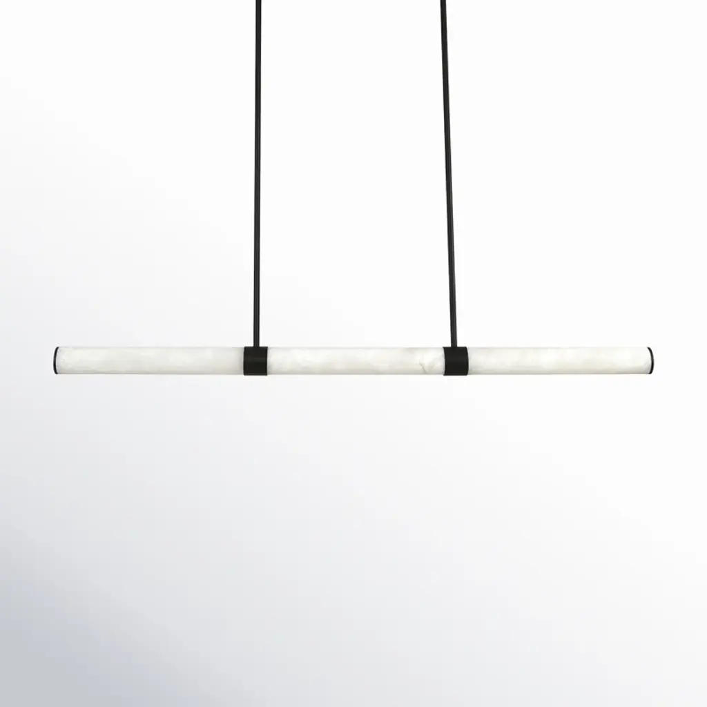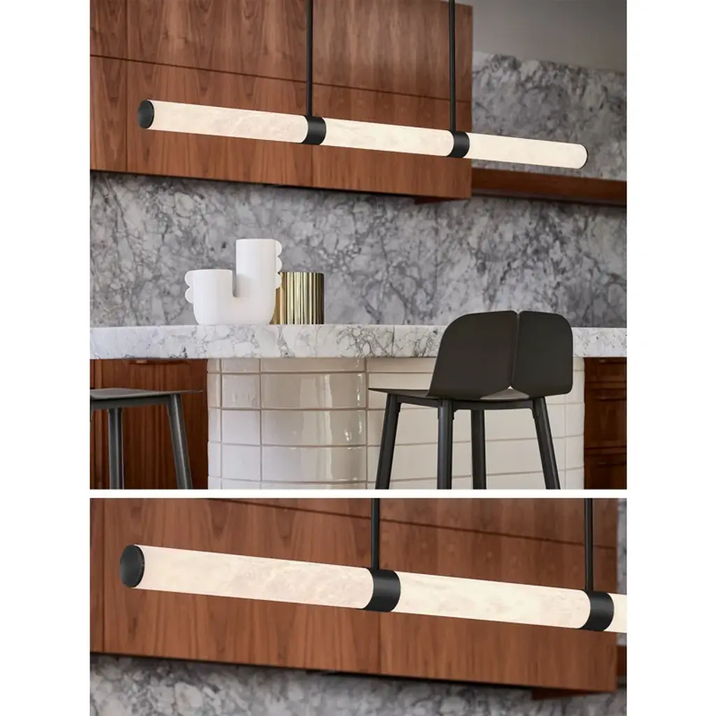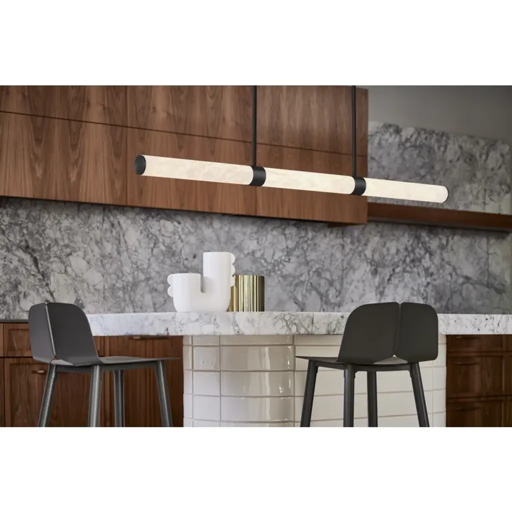 Infused with cool sophistication, this modern linear pendant light sets the tone over a kitchen island or dining table. Its crisp silhouette pairs minimalist design with a finish that's deep and rich for elegant contrast. Its diffuser is a cylinder of beautiful, natural alabaster sourced from Spain for its impeccable quality and organic character. A slim rectangular canopy supports the pendant, adding to the simple sophistication of its silhouette. An LED light source is modern and energy efficient, delivering adaptable, adjustable brightness and light color, perfect for a variety of ambiances suited to every space.