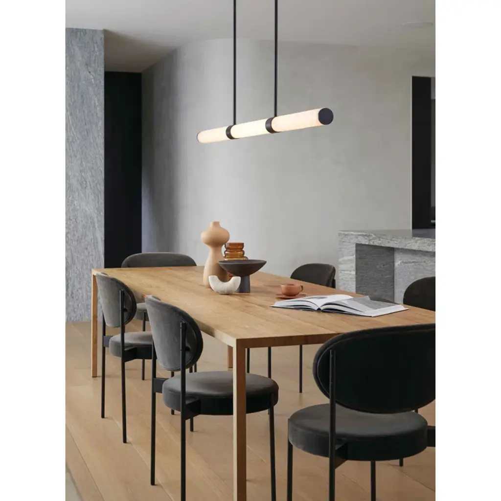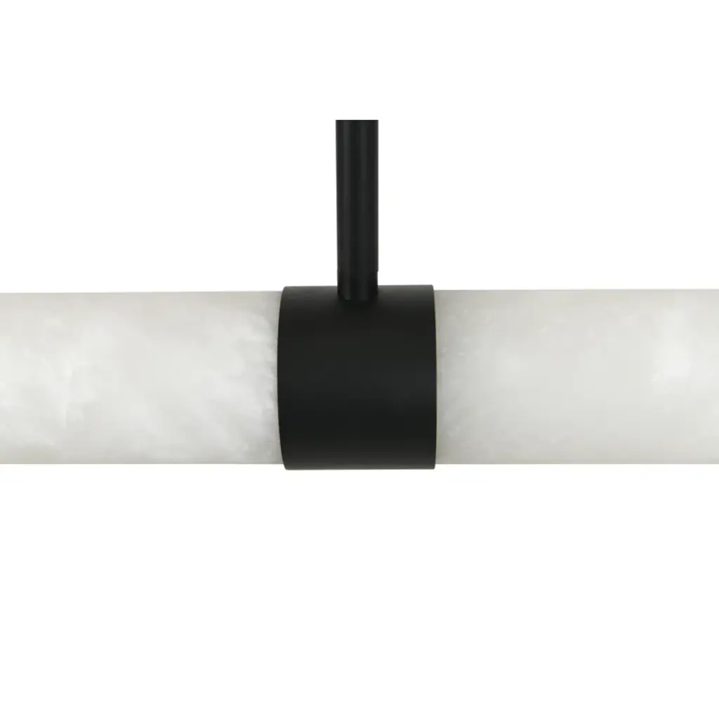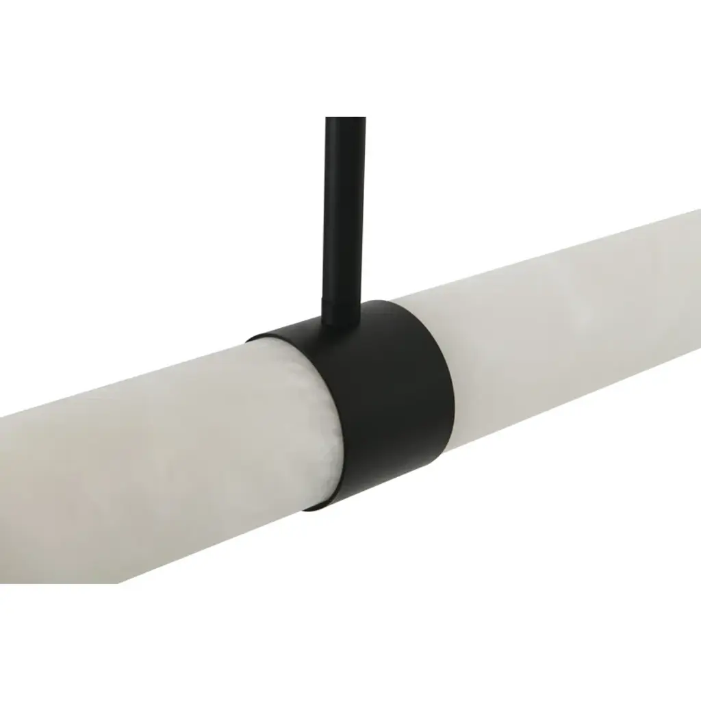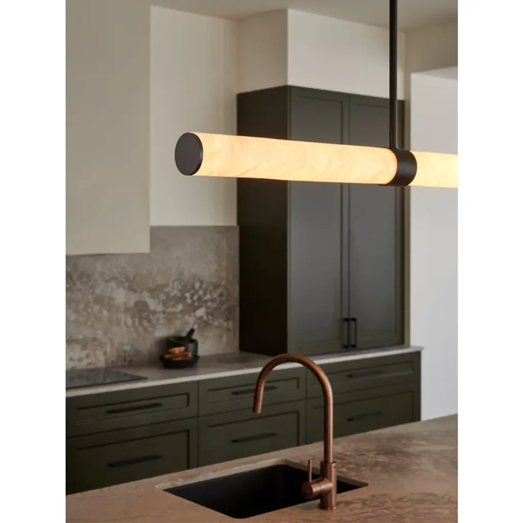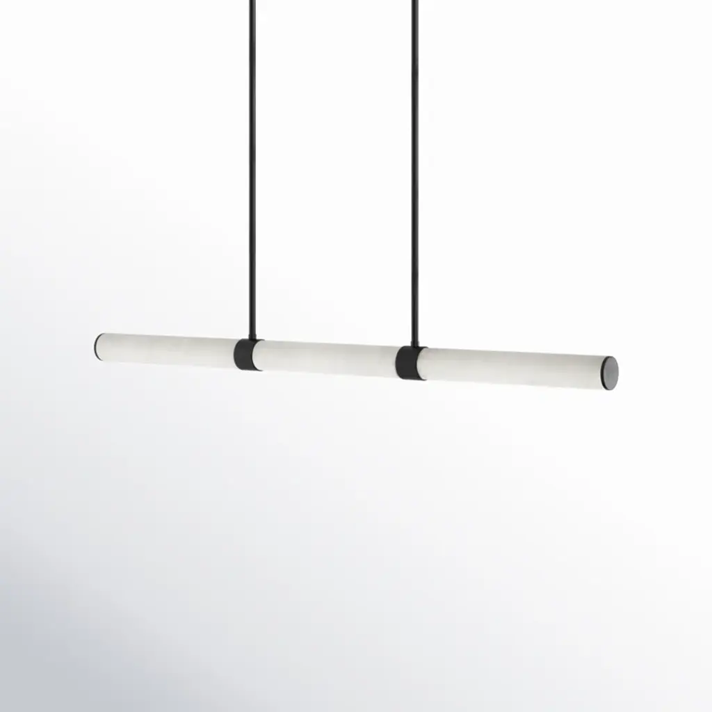 Infused with cool sophistication, this modern linear pendant light sets the tone over a kitchen island or dining table. Its crisp silhouette pairs minimalist design with a finish that's deep and rich for elegant contrast. Its diffuser is a cylinder of beautiful, natural alabaster sourced from Spain for its impeccable quality and organic character. A slim rectangular canopy supports the pendant, adding to the simple sophistication of its silhouette. An LED light source is modern and energy efficient, delivering adaptable, adjustable brightness and light color, perfect for a variety of ambiances suited to every space.