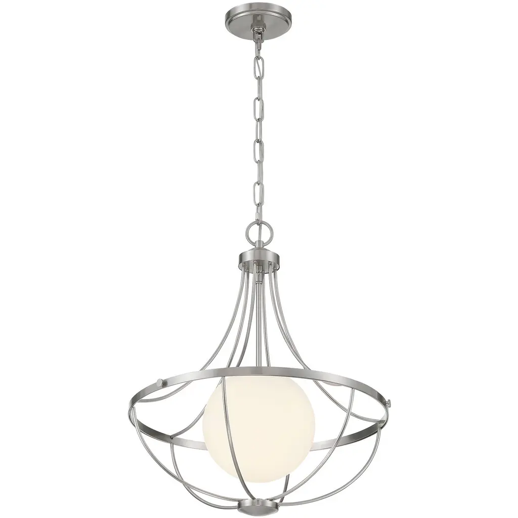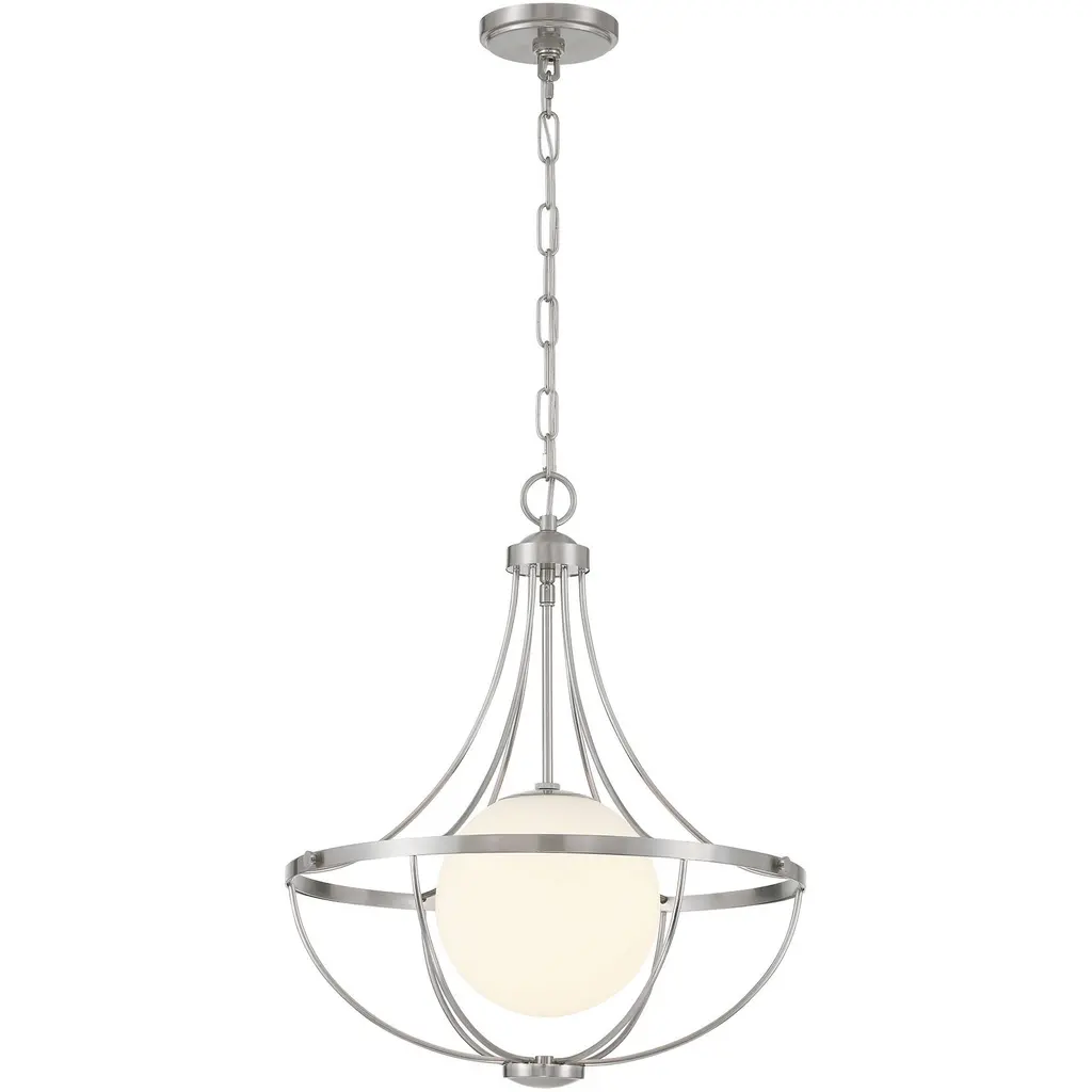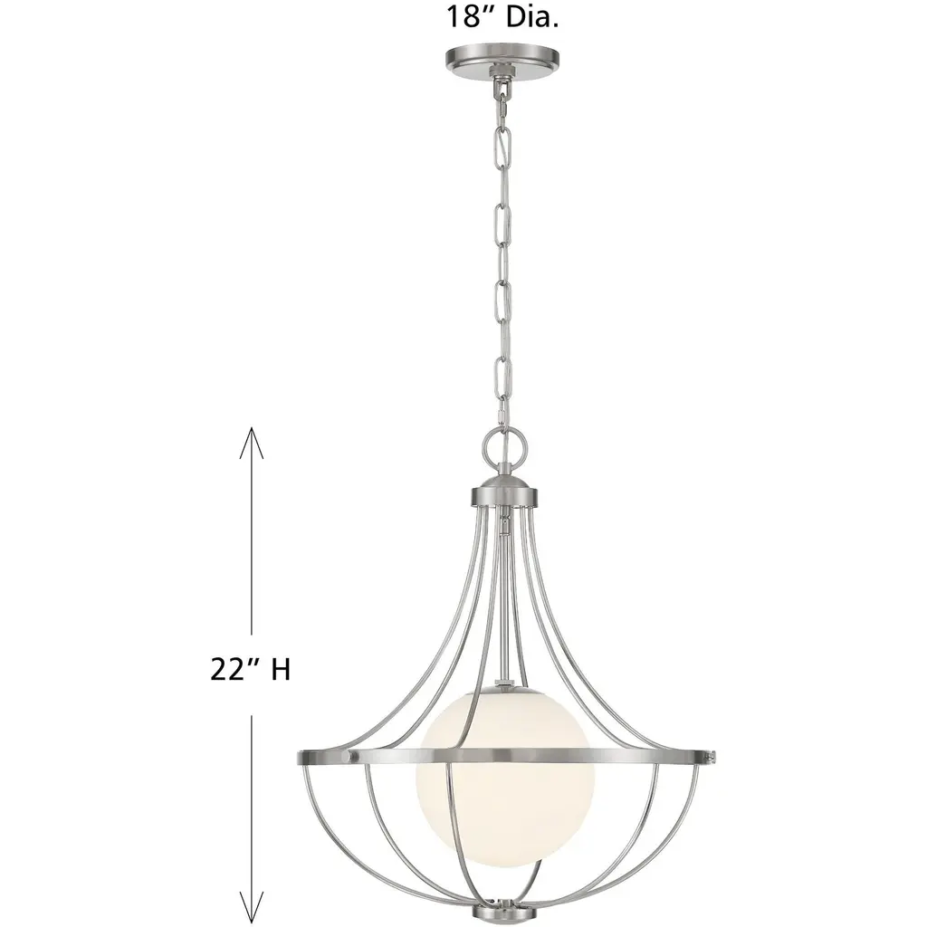 This unique and eye-catching 1-light pendant takes style cues from traditional chandelier silhouettes, then freshens them up with a contemporary twist. A curved frame finished in Brushed Nickel supports an orb of white opal glass that shines from within. 22" height and 18" width. Comes with 120" of hanging chain. Uses 1 standard size bulb of up to 60 watts. Bulb not included.