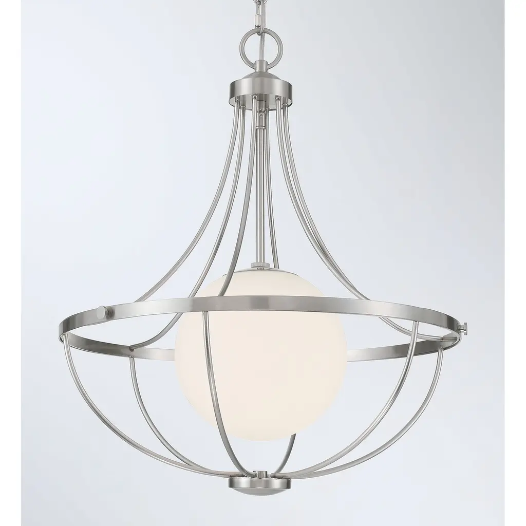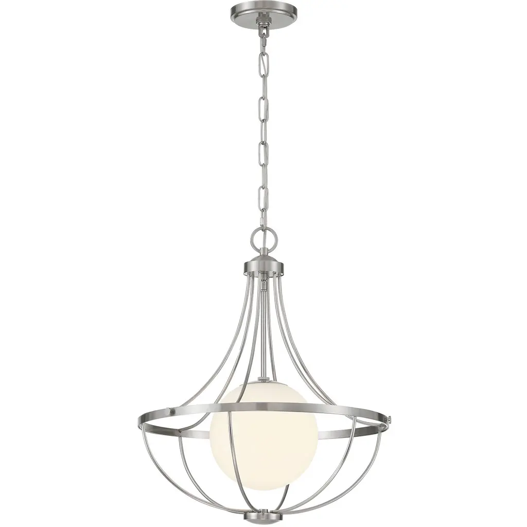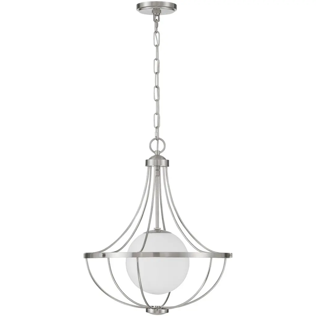 This unique and eye-catching 1-light pendant takes style cues from traditional chandelier silhouettes, then freshens them up with a contemporary twist. A curved frame finished in Brushed Nickel supports an orb of white opal glass that shines from within. 22" height and 18" width. Comes with 120" of hanging chain. Uses 1 standard size bulb of up to 60 watts. Bulb not included.