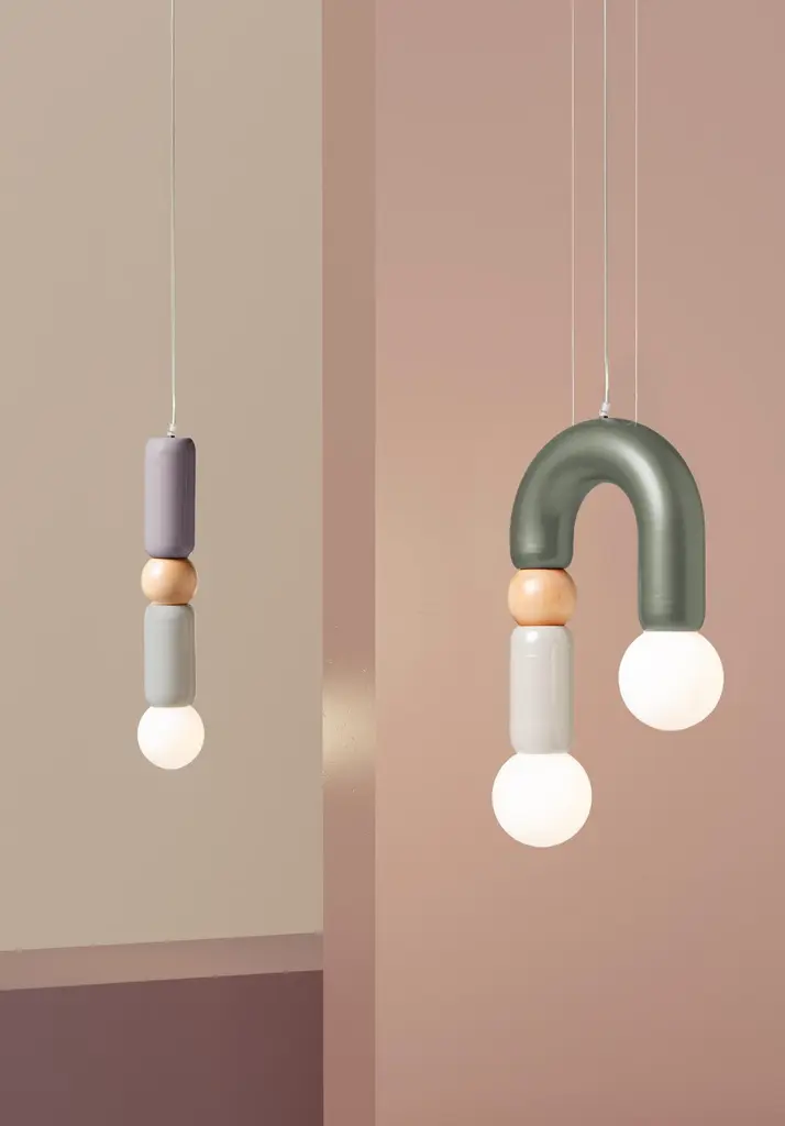 Contemporary Art Deco Pendant Lamp Play Ii In Sage, Taupe And Natural Oak By Utu