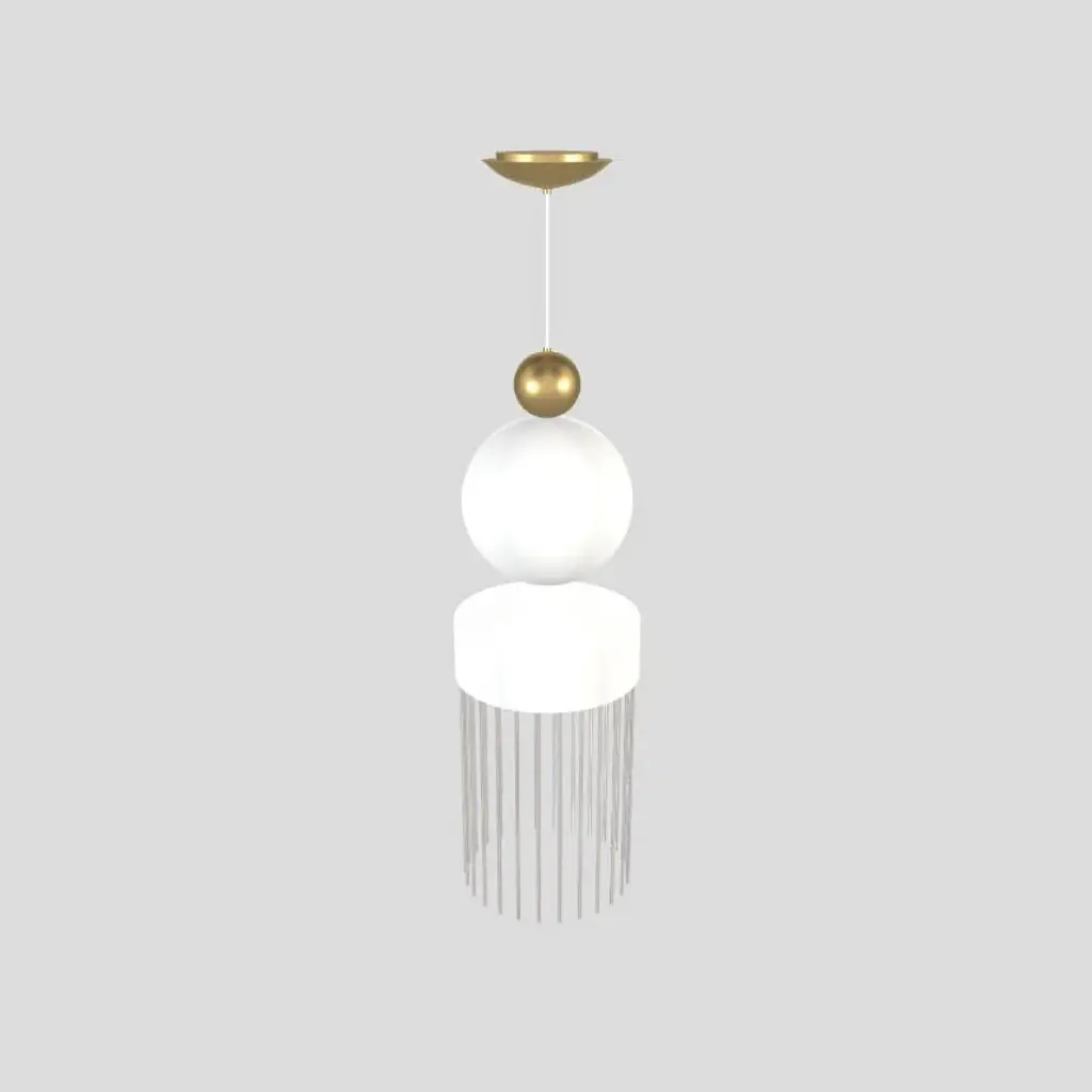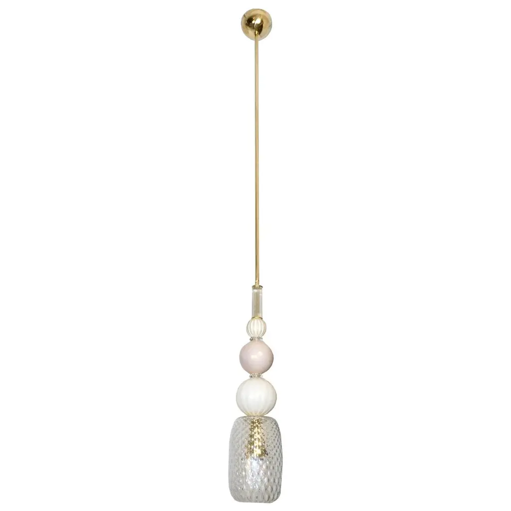 Fun and elegant Italian lantern chandelier, entirely handcrafted, of organic modern design consisting of a succession of elements: reeded crystal Murano glass cylinder, opaline rose pink blush and ivory white glass spheres overlaid in clear crystal worked with 24-karat pure gold speckles, an interesting translucent honeycomb textured crystal glass shade surrounding a sophisticated handmade brass cone containing the light, on a brass pole with adjustable height.Ideal over a kitchen island or as spotlights over nightstands.Custom made pendant with similar Murano glass elements can be created also in different finishes.