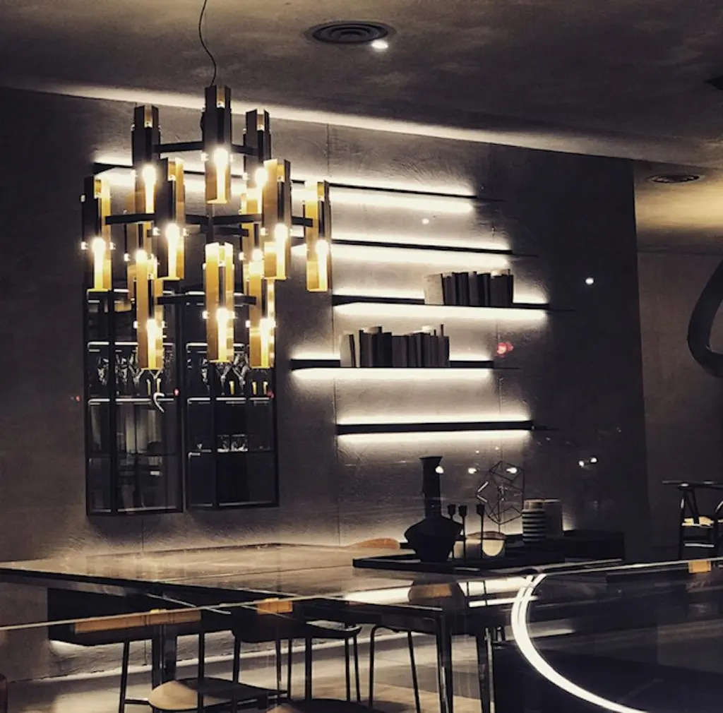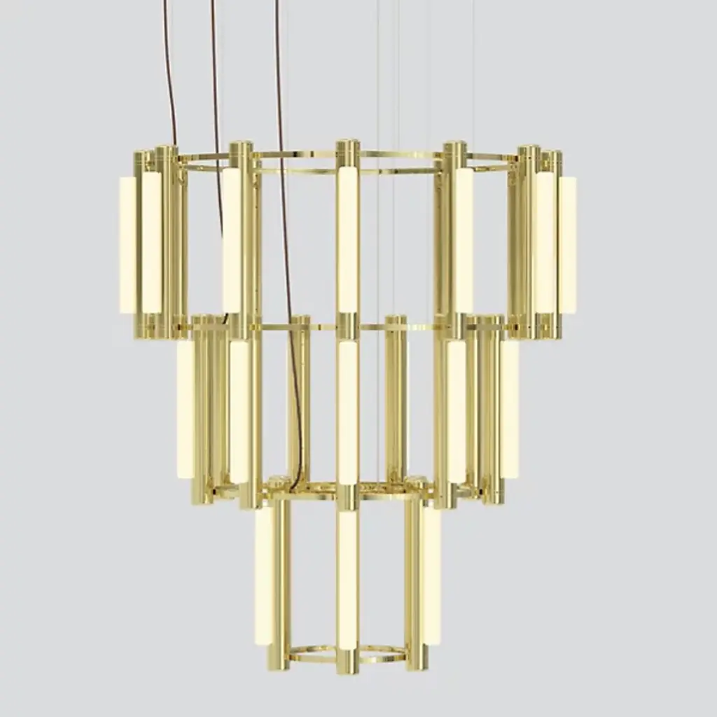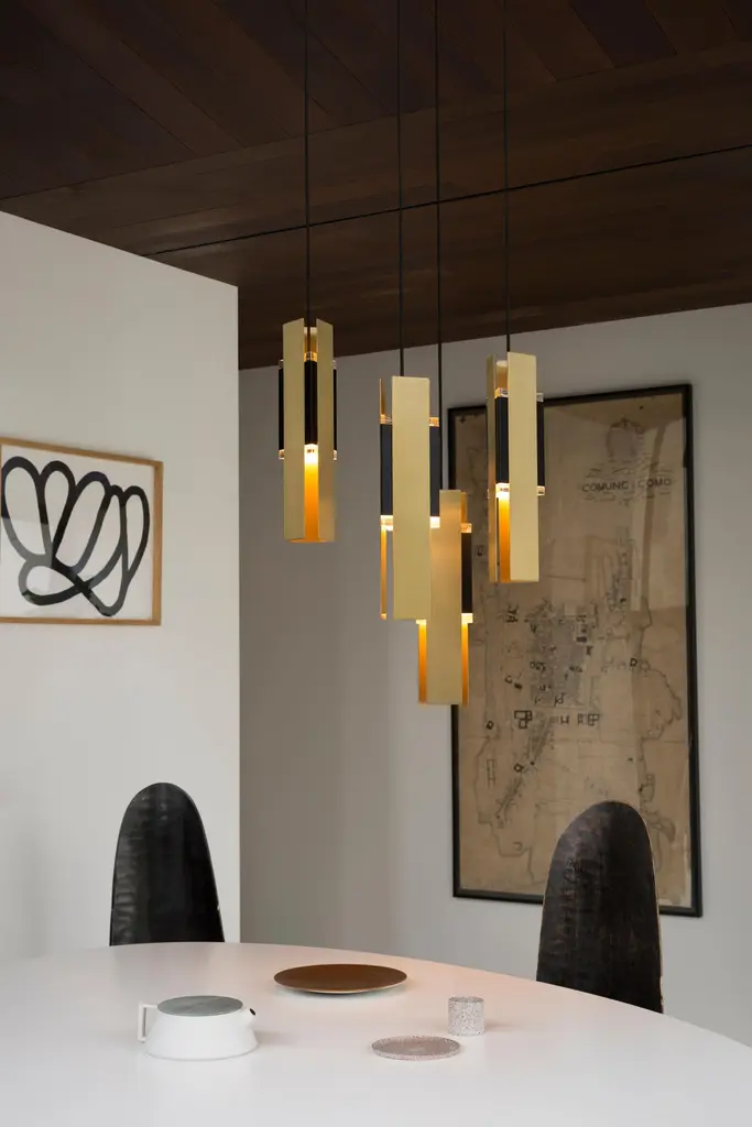 Chandelier Excalibur by Tooy.12 Pendants version. (Compliant with US electric system)Dimensions: Height 107 cm x diameter 107 cm. Finish: Brushed brass.Canopy: Ø 13 cm included with bracket.Lighting source : 12 x LED.Pendant: 125 cm steel cable & electric cable length 150 cm.A slightly Deco inspired lamp. The main body is in black coating and the light is spread through 2 plexiglass prisms and it’s wrapped into 3 rectangular brushed brass foils. It is available in different compositions: single or bunch suspension, chandeliers in two different dimension, single or double wall lamp.A light to give warmth, a light to give atten-tion, a light to get lost in one’s thoughts. Each reflection, a state of mind.Fascinated by the infinite facets of light, the TOOY brand offers lighting that gives value to the experience of living in spaces through a wide and versatile range of products capable of telling a story.