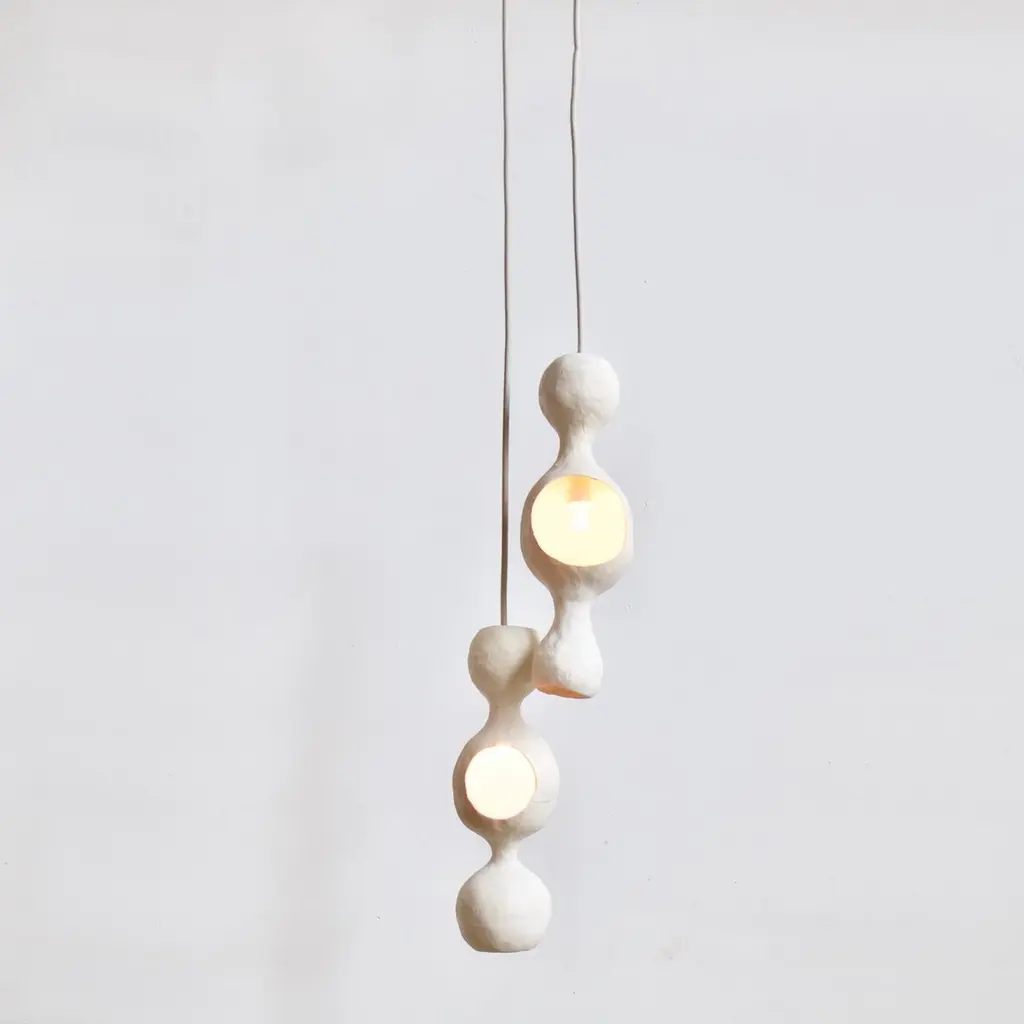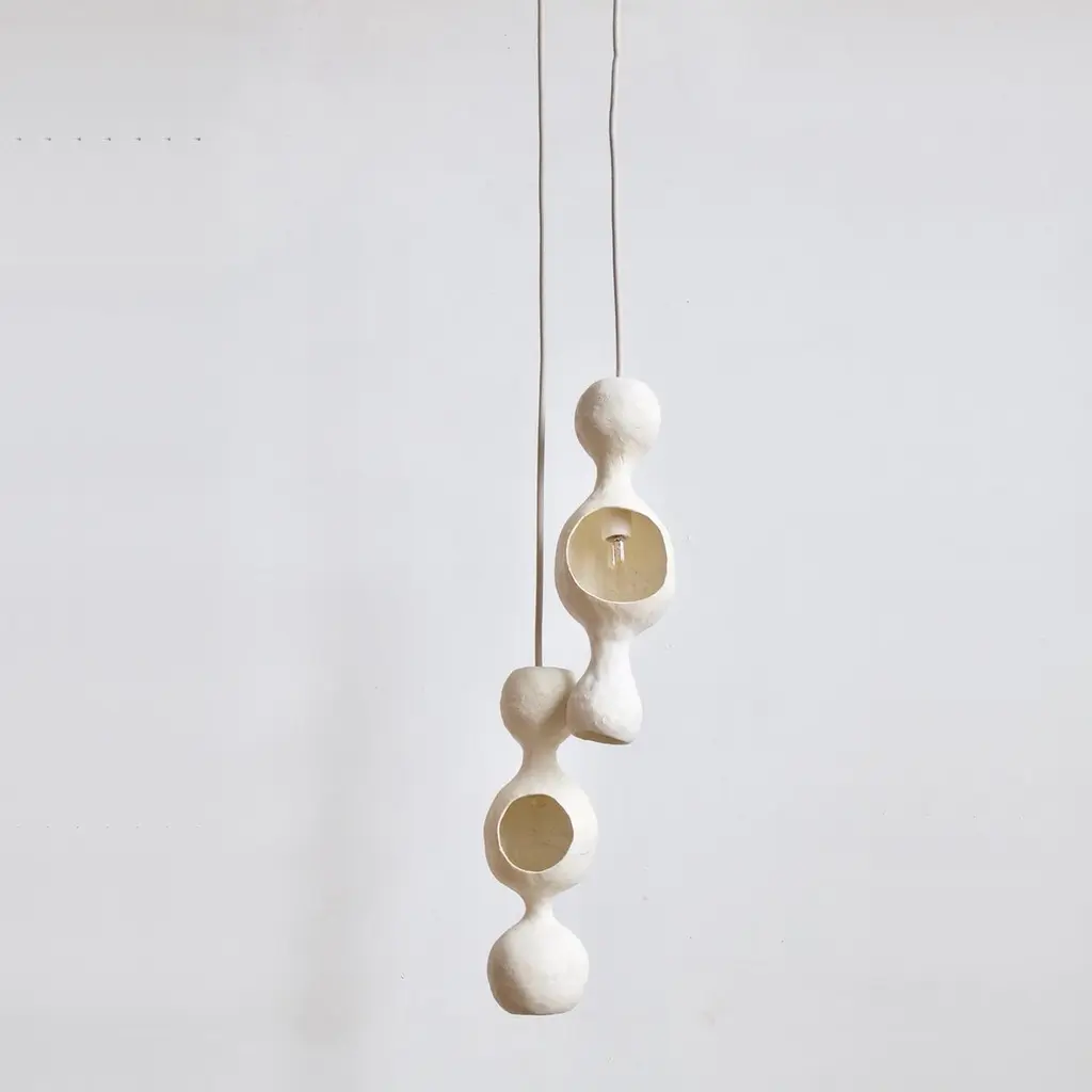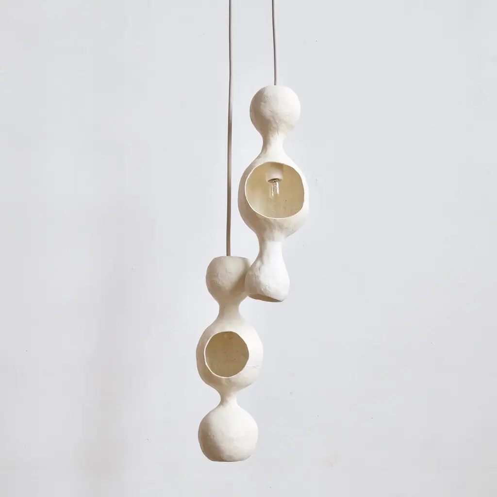 White Bowerbird couple is a contemporary double-shell hand-built ceramic pendant lamp finished in a matte white glaze with a warm glow reflecting off of a round joyful form. Each shell is individually hand formed and unique, creating a pleasant rhythm when installed as a pair. The hand-built ceramic canopy, finials and socket cover add an enjoyable character.Component dimensions:Shell 4-6 diameter x 12-14 height in. / 10-13 diameter x 30-36 height cm; 2 lbs / 1 kg eachCustom drop length, please specify5 in. / 12.5 cm diameter ceramic canopyMaterials:Shells, canopies, socket covers and finials in hand-built ceramic in a warm-white matte glaze, off-white nylon-covered SVT lamp wire, brushed brass hardware, and electrical componentsLight source:1 x E-12 candelabra base per shell25W incandescent lamp includedCompatible with LED replacement lampsAdditional info:Each lamp is individually hand-built without using a mould to create an enjoyable uniqueness and spatial balance within each form. Variations in dimensions, forms, and finishes are expected.The story:White Bowerbird collection is from Courtship behaviour, a project inspired by the curious behaviour of the Satin Bowerbird, the eastern Australian birds known for decorating their nests with objects they collect to attract a mate.