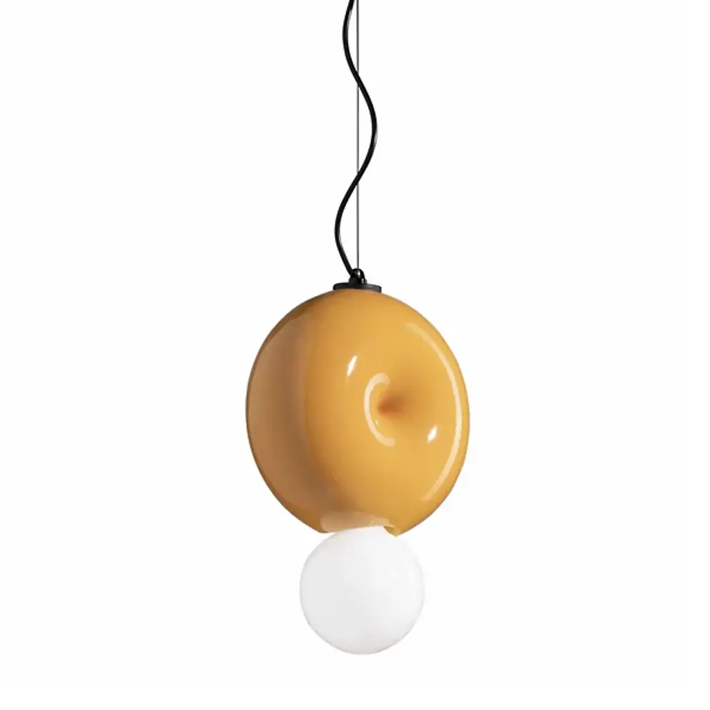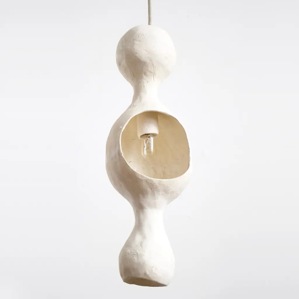 White Bowerbird single is a contemporary single-shell hand-built ceramic pendant lamp finished in a matte white glaze with a warm glow reflecting off of a round joyful form. The humorous friendly form makes a playful interior accent when installed with a single shell. The individually hand-built ceramic canopy, finials and socket cover add an enjoyable uniqueness.Component dimensionsShell: 4-6 diameter x 12-14 height in. / 10-13 diameter x 30-36 height cm2 lbs / 1 kg eachCustom drop length, please specify5 in. / 12.5 cm diameter ceramic canopyMaterials: Shells, canopies, socket covers and finials in hand-built ceramic in a warm-white matte glaze, off-white nylon-covered SVT lamp wire, brushed brass hardware, and electrical componentsLight source:1 x E-12 candelabra base per shellCompatible with LED replacement lampsAdditional info:Each lamp is individually hand-built without using a mould to create an enjoyable uniqueness and spatial balance within each form. Variations in dimensions, forms, and finishes are expected.The story:White Bowerbird Collection is from Courtship Behavior, a project inspired by the curious behavior of the Satin Bowerbird, the eastern Australian birds known for decorating their nests with objects they collect to attract a mate.