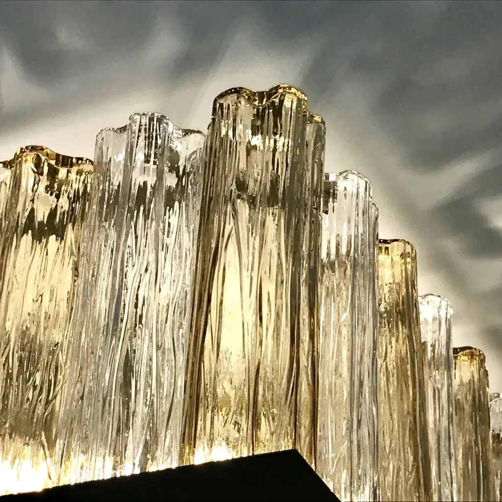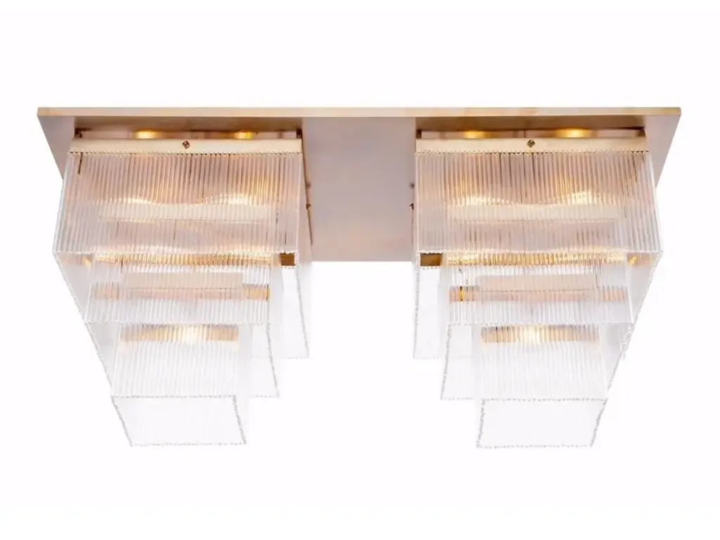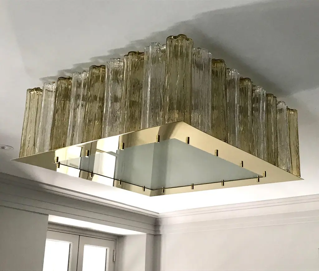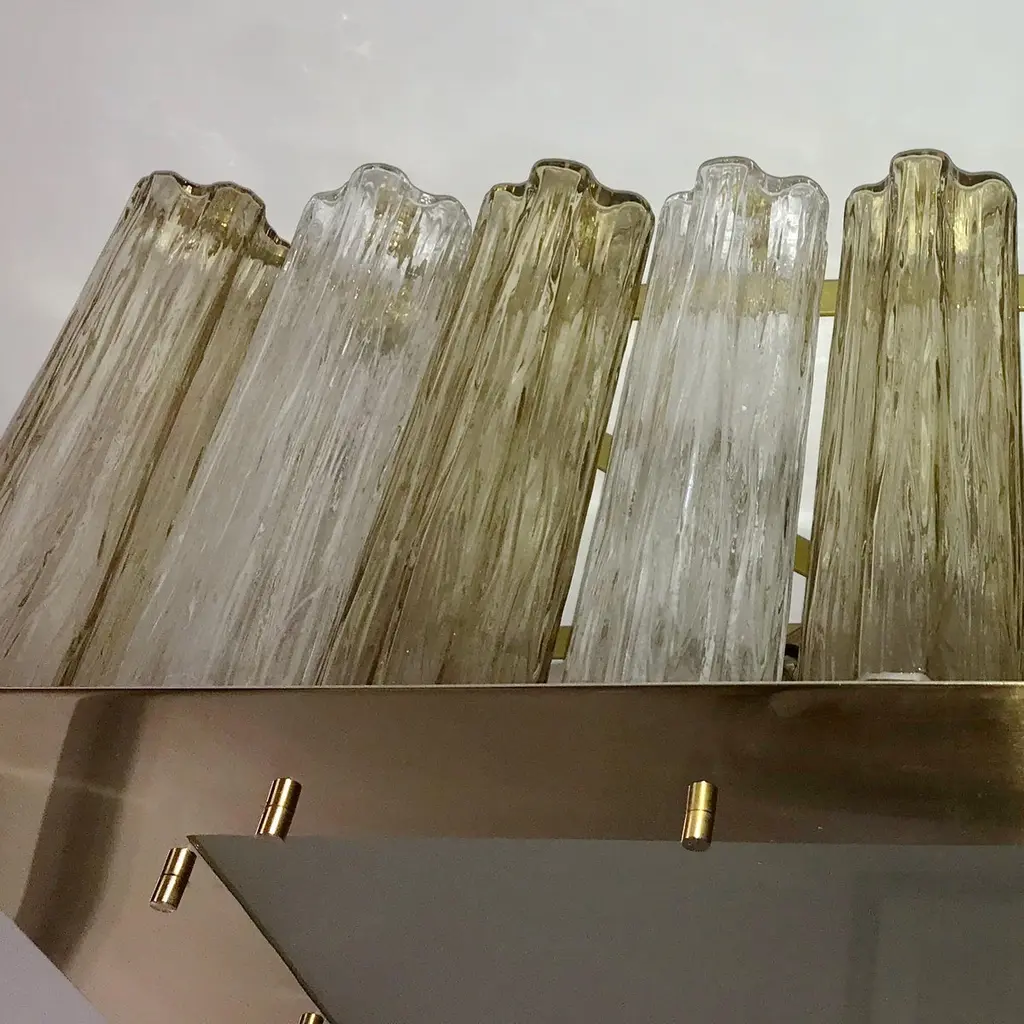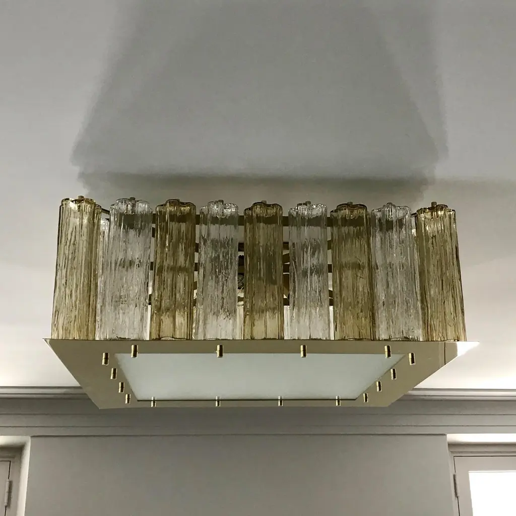 A contemporary Italian bespoke Art Deco design, entirely handcrafted in Italy, chandelier customizable as flush mounts or pendants, here with a gold brass structure in a geometric square shape, highlighted and made precious by a brass staging platform that supports a frosted glass bottom to diffuse the interior light enclosed by rows of organic Tronchi: rounded star shape tubes in blown Murano glass.Their elegance is accented by the two tones of Murano glass, crystal clear and amber gold, also by their texture and sensual curvilinear shapes.Approximate weight 78 lbs.Is wired for US standards with 6 Edison base bulbs.