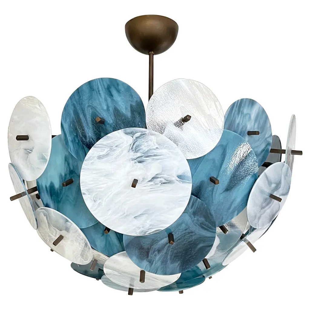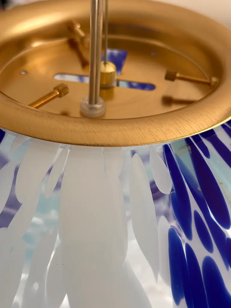 Impressive contemporary Multicolors sports Sphere in Murano Glass Blue, azzure and white spots on transparent blowing Murano glass. Design in very particular and effective movement, a luxury piece of italian art. Very High Italian craftsmanship. Venetian scenographic suspension lamp. These jewels melted together are skillfully blown by skilled Murano masters, Ambient and shenographic interior light. Brushed Gold 24k metal frame for 1 bulb. Led Bulb required. Dimensions (cm/in): Diameter 40cm/15.7″ 50cm/19.7" of steel cables more canopy. all made in Italy, ship from ITALY in a wooden Box.
