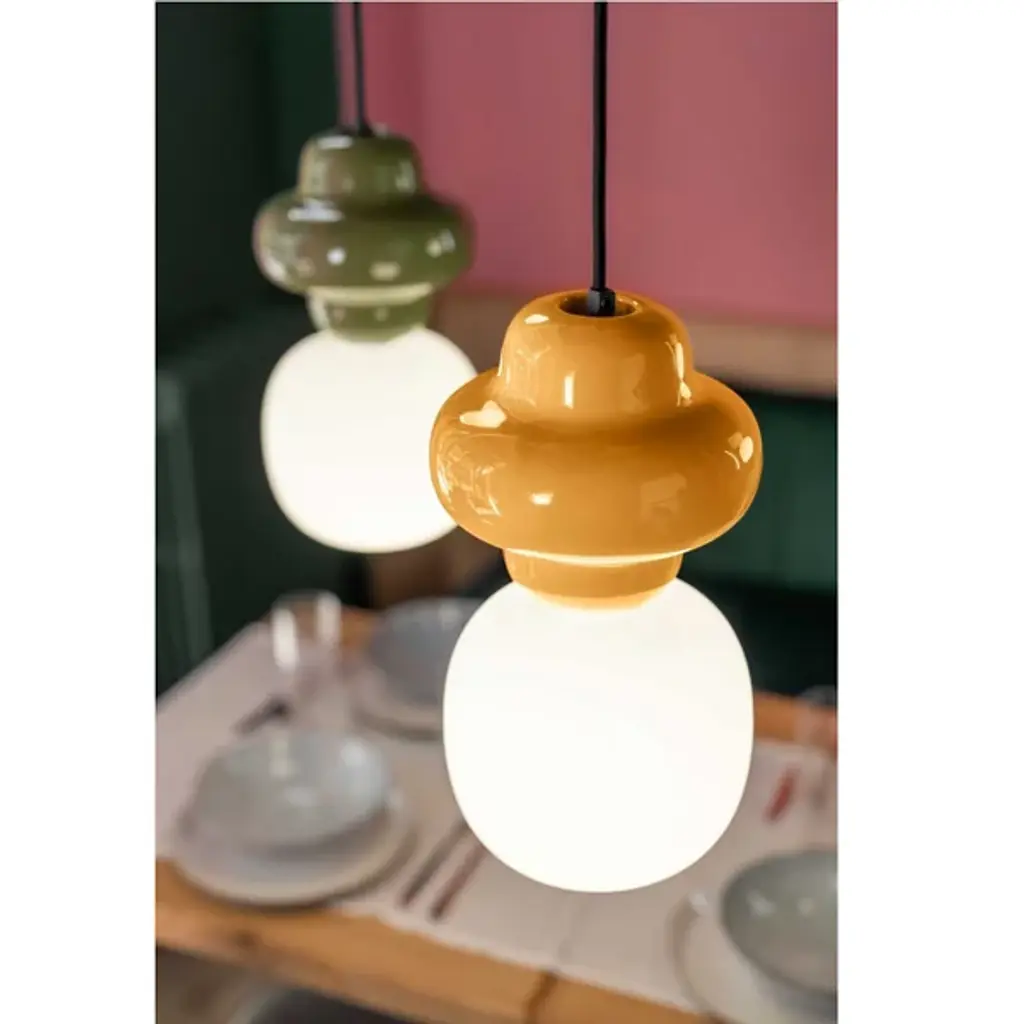 Illuminate your ceiling spaces with the elegant touch of the Copacabana Mini Pendant from Ferroluce. This captivating modernist design descends from a dome canopy via a slender cord, featuring a contoured body that gracefully supports potent lamping. The rounded shade crafted from satin glass diffuses the light, creating a warm and inviting glow that transforms bright glare into a subtle radiance. The translucent material allows the light to gently extend around the fixture, reflecting off the smooth ceramic lamp body and infusing the space with an expressive radiance.