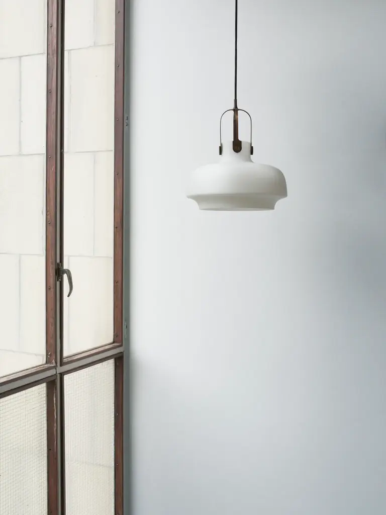 The Copenhagen pendant lamp providing a diffused warm glow with blown glass shade or a slightly more directional up and down light output with a metal shade. To be hard wired with canopy into the ceiling. The shade is mouth-blown opal glass or a single piece of metal spun into shape then matte lacquered. The suspension is made from milled and laser cut bronzed brass or steel which undergoes a special plating process to produce the desired matte finish to complement the shade.