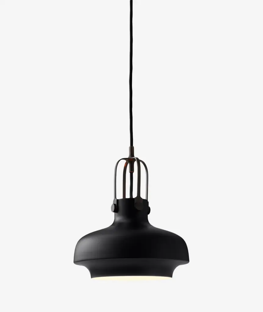 The Copenhagen pendant lamp providing a diffused warm glow with blown glass shade or a slightly more directional up and down light output with a metal shade. To be hard wired with canopy into the ceiling. The shade is mouth-blown opal glass or a single piece of metal spun into shape then matte lacquered. The suspension is made from milled and laser cut bronzed brass or steel which undergoes a special plating process to produce the desired matte finish to complement the shade.