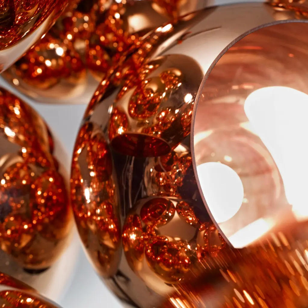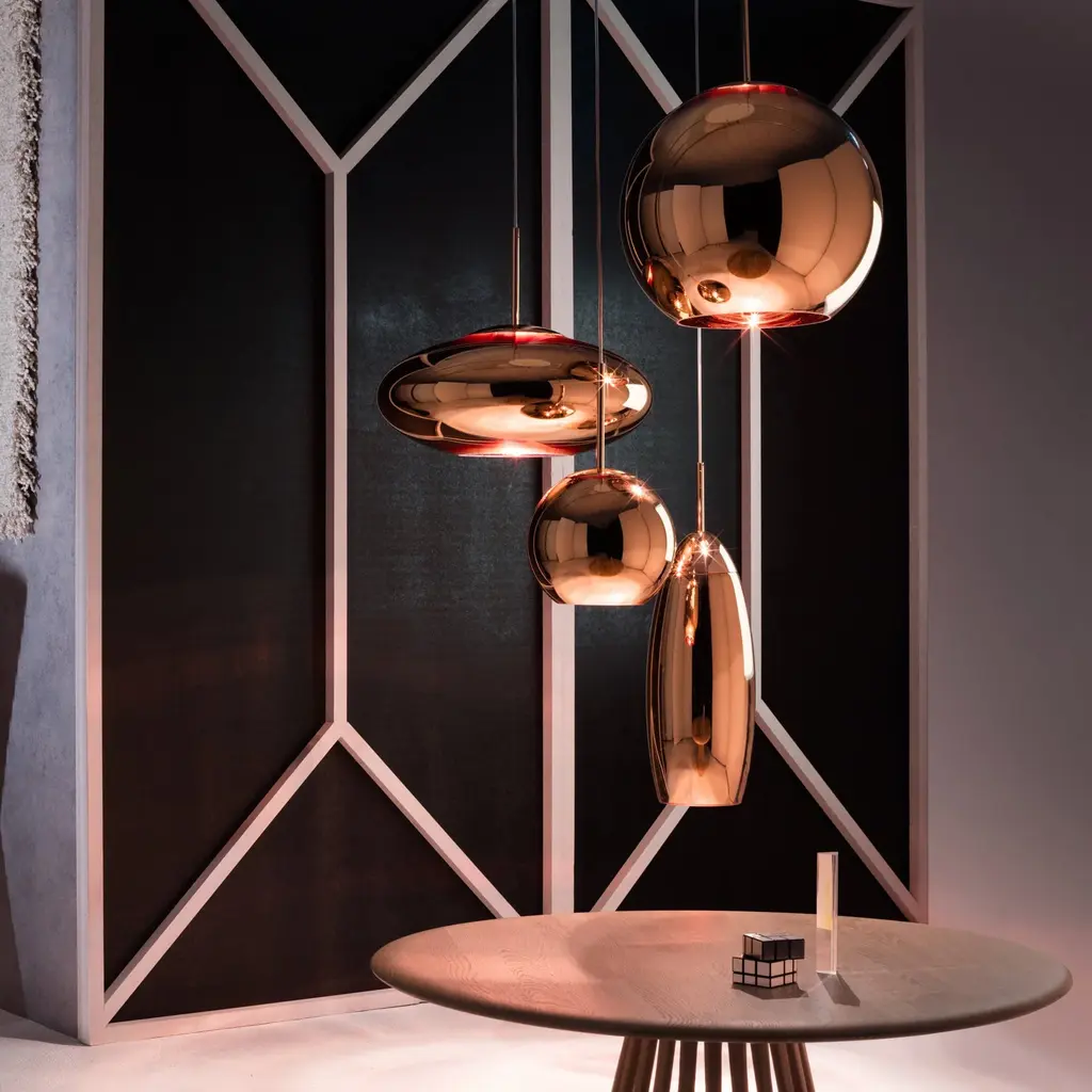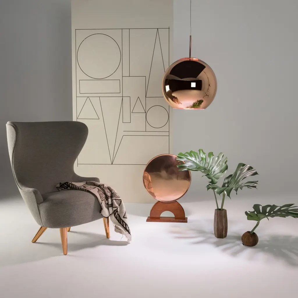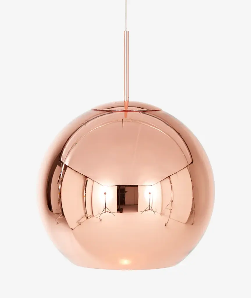 A shining star of British design, Tom Dixon uses an inventive process to create his mirrored Copper lighting collection. By exploding a thin layer of pure metal onto the internal surface of a polycarbonate globe, the light's rounded form emerges—with its highly reflective surface casting a warm metallic glow. Based on the familiar sphere shape, the series includes 2 Round versions as well as the compressed Wide and elongated Tall to accommodate lower ceiling heights or narrow hallways. Striking singly as a focal point or in clusters to multiply the drama.