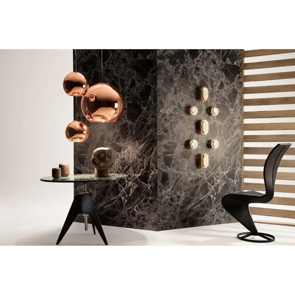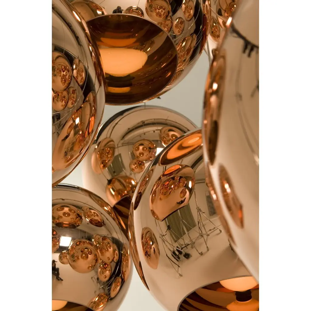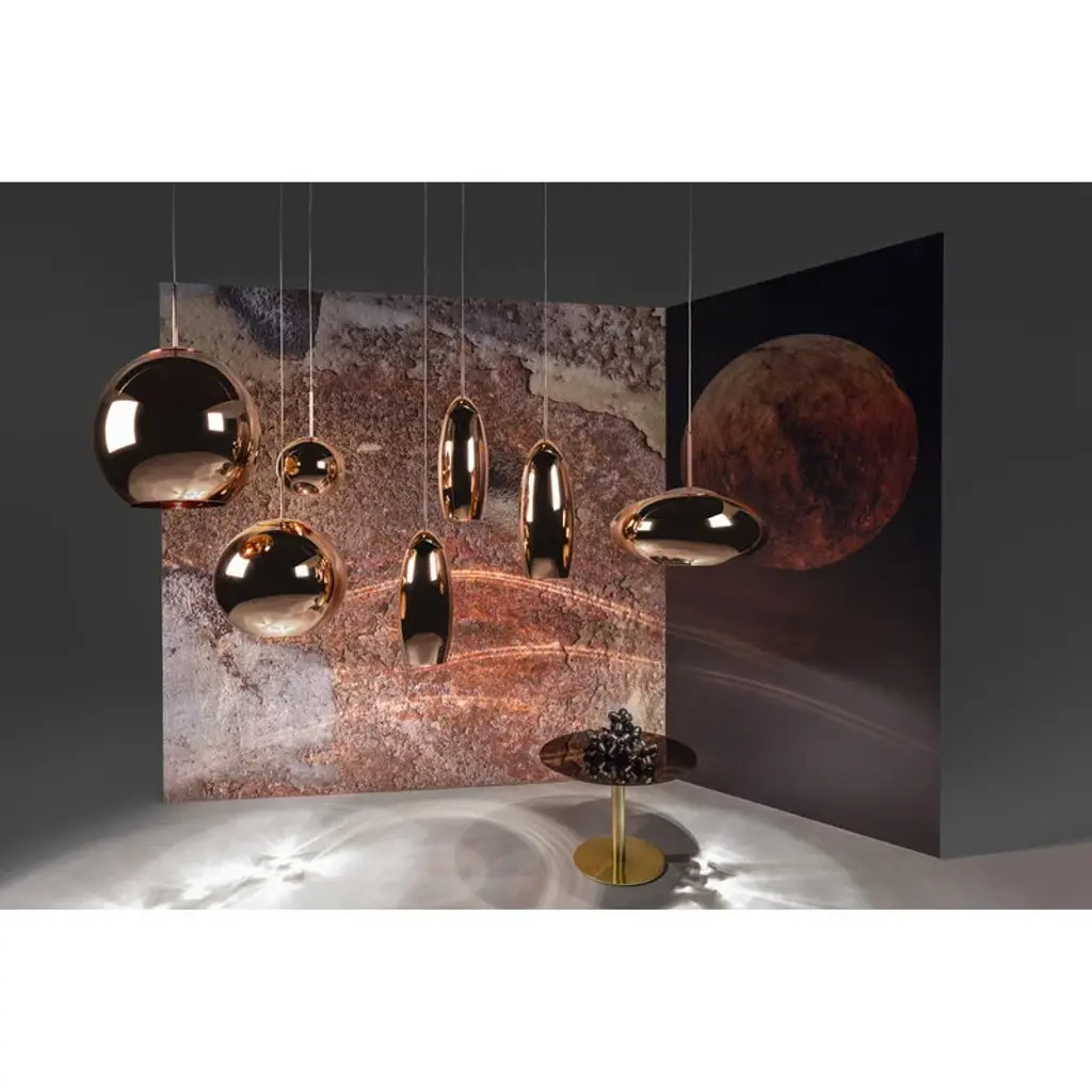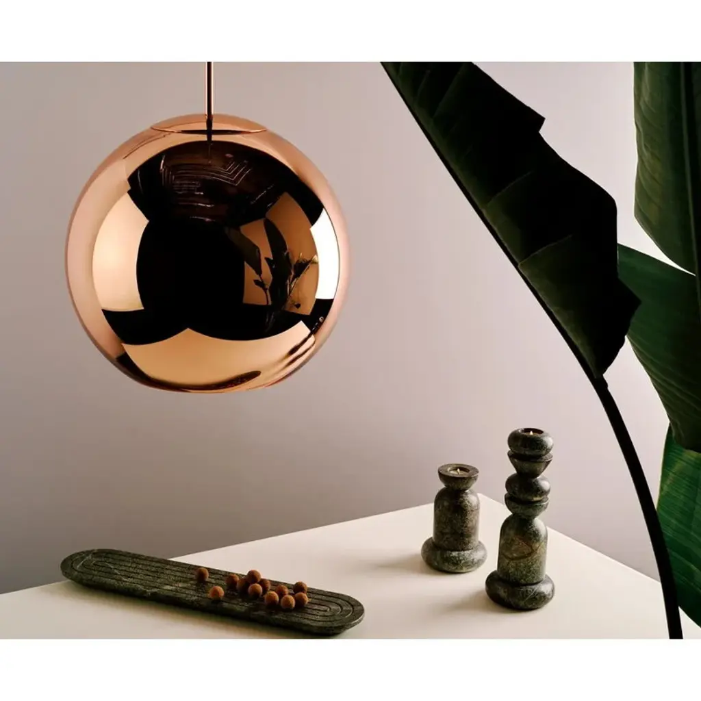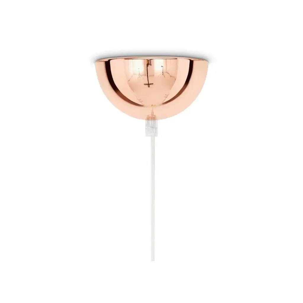 Designed by Tom Dixon, the Copper pendant is characterized by a highly reflective surface that looks stunning for example in the living room or above a dining table. The Copper lamp is made of polycarbonate with an internal copper coating that gives the shade its characteristic mirror finish and warm light. The round, sculptural Copper pendant reflects its surroundings attractively, and it suits both domestic and public environments. This lamp has an integrated, dimmable LED module that is energy-efficient and has a long life expectancy. The module is fully serviceable, and replacement components are available if needed.
