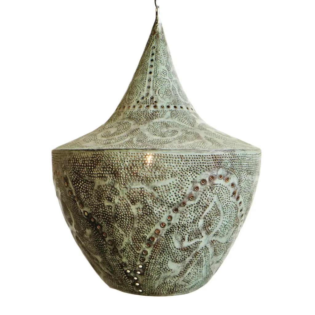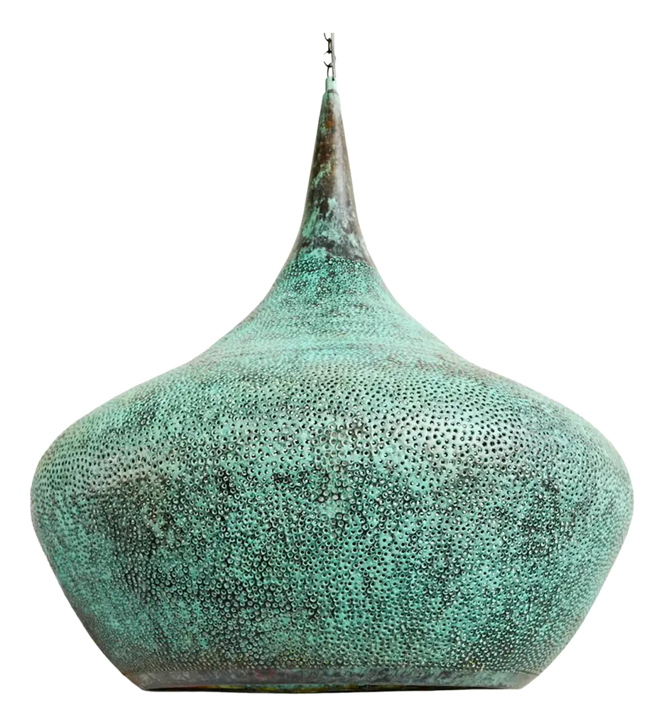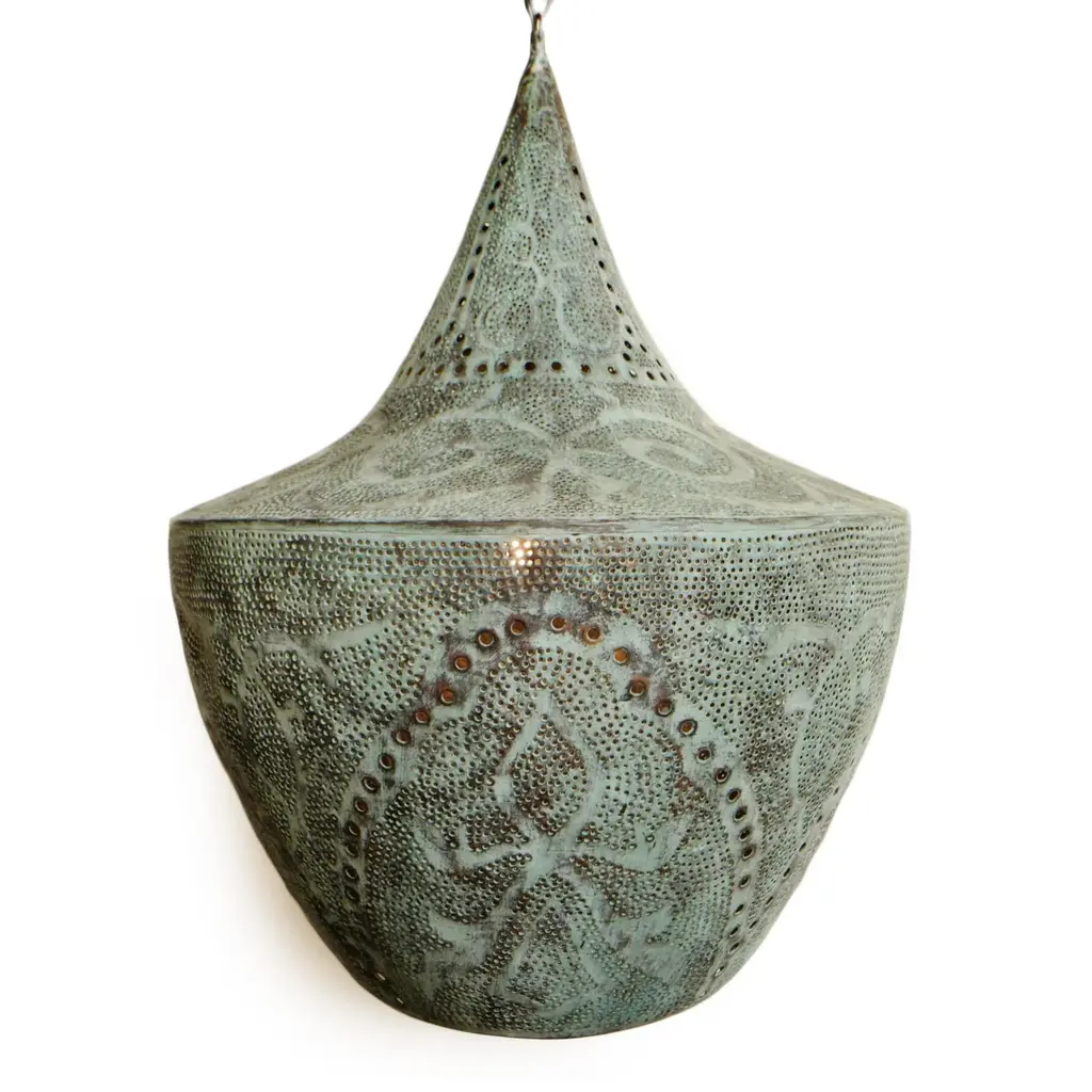 Beautiful verdigris handmade copper lantern with perforated decorative design that emanates intricate light patterns. Open bottom allows for direct light downwards as well. Includes 3' of verdigris finished chain and ceiling plate. 100 watt max. Each lantern will vary in finish, natural imperfections, and handmade differences. Each sold individually.