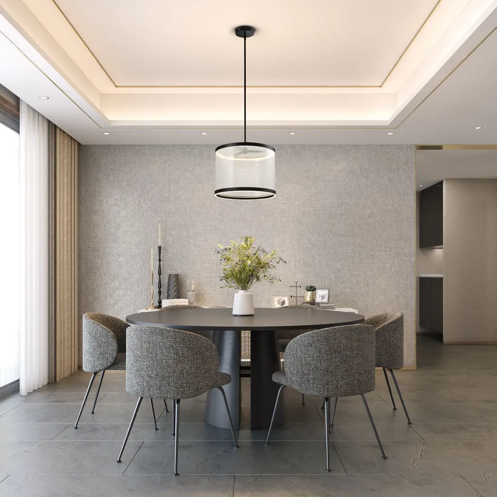 The Cora collection chandelier enchants with its modern elegance, showcasing a sleek black metal frame paired with a silver organza hardback shade. This LED chandelier exudes a soft yet striking glow, illuminating through its top and bottom rings to create a warm ambiance. Equipped with a versatile 5CCT switch, it offers customizable lighting to suit any mood or setting. This design seamlessly blends functionality and style, making it a refined statement piece for any interior.