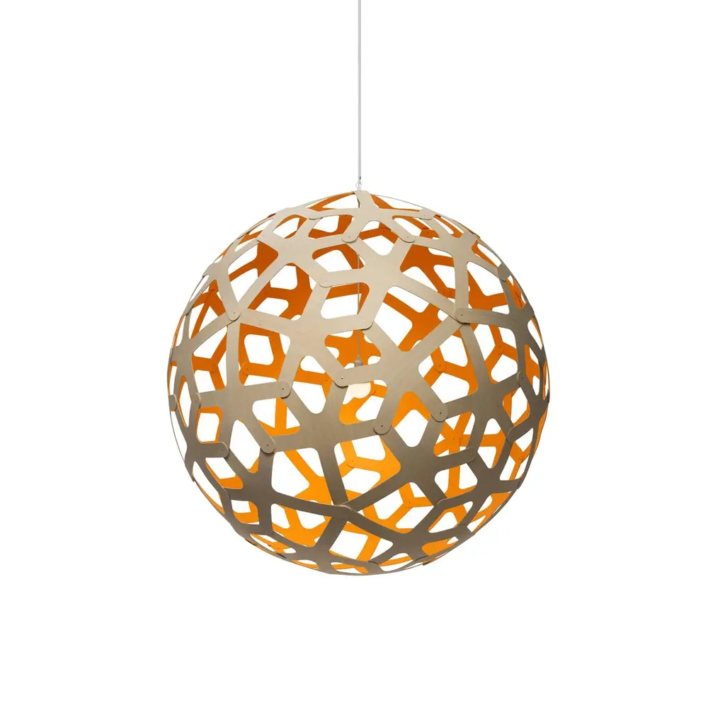 The "fingers" of the geometric polyhedron structure of this lamp are reminiscent of the coral reefs David Trubridge explores off the coast of New Zealand. A love for earth drove the construction, flatpacked to reduce freight and packing resources. Identical pieces make home assembly a snap. The celebrated designing craftsman ended up in his adopted home after he, his wife and their two sons sold everything and set off on a yacht for a world adventure. It culminated in 1985 when they decided to remain there. While an artist-in-residence at Hawkes Bay Polytechnic (now EIT), he built a house and suddenly found himself with further commissions. Before realizing homes, lamps and furniture, David left Newcastle University in 1972 with a degree in Naval architecture. His work has appeared in countless museums, including the Victoria & Albert and the Pompidou Centre. That barely scratches the surface of his fascinating story and work ethos.