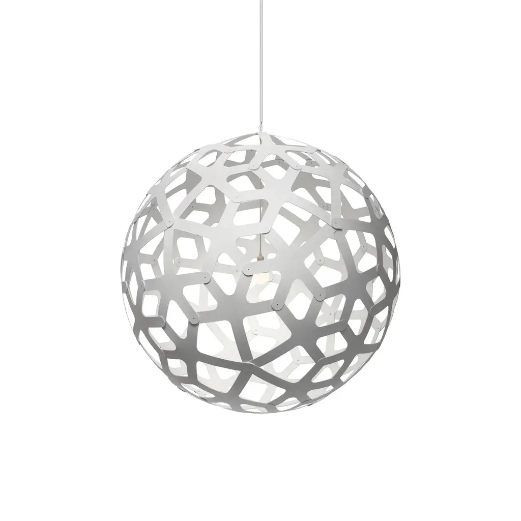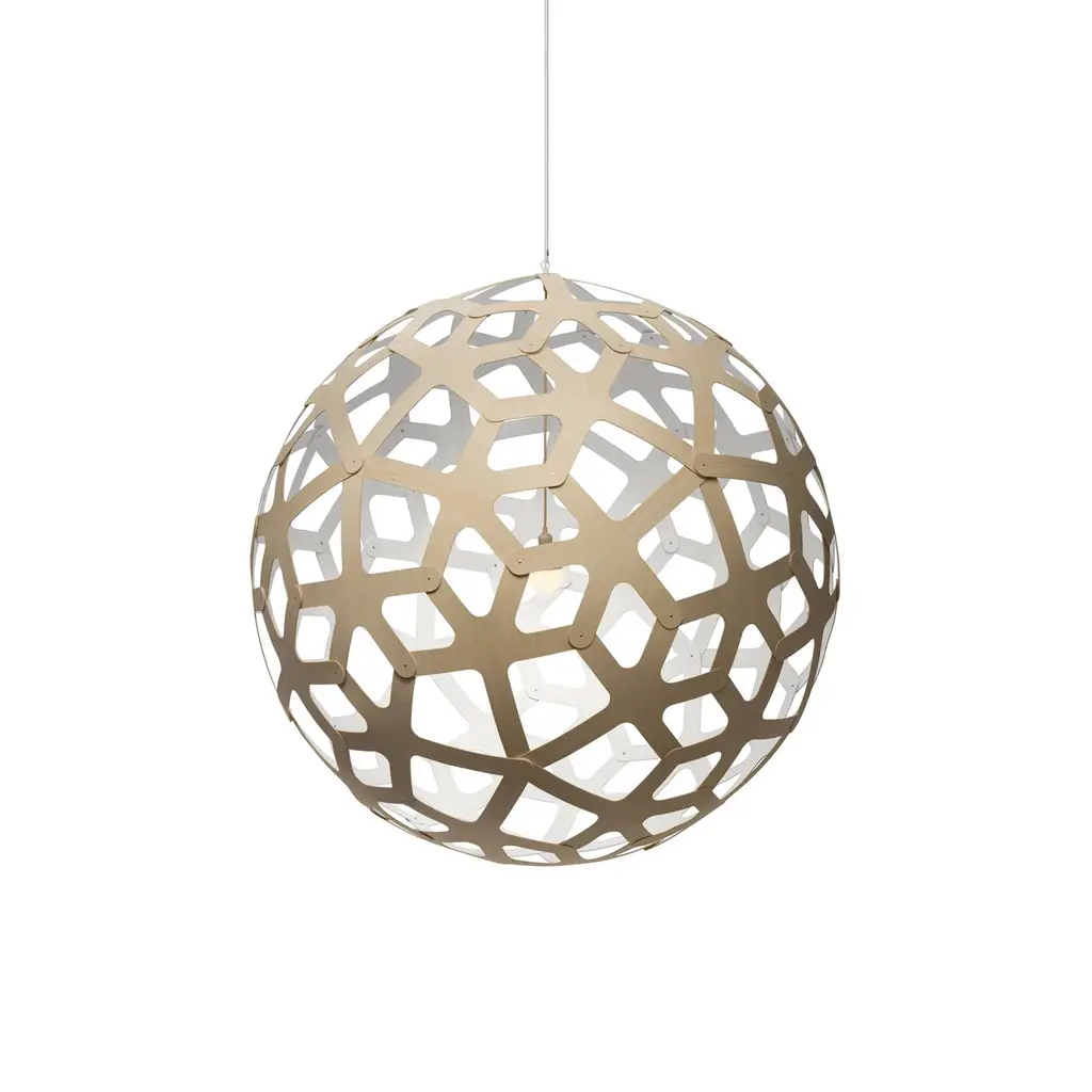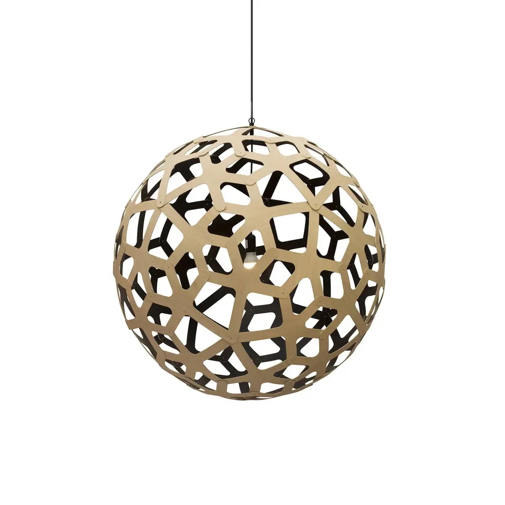 The "fingers" of the geometric polyhedron structure of this lamp are reminiscent of the coral reefs David Trubridge explores off the coast of New Zealand. A love for earth drove the construction, flatpacked to reduce freight and packing resources. Identical pieces make home assembly a snap. The celebrated designing craftsman ended up in his adopted home after he, his wife and their two sons sold everything and set off on a yacht for a world adventure. It culminated in 1985 when they decided to remain there. While an artist-in-residence at Hawkes Bay Polytechnic (now EIT), he built a house and suddenly found himself with further commissions. Before realizing homes, lamps and furniture, David left Newcastle University in 1972 with a degree in Naval architecture. His work has appeared in countless museums, including the Victoria & Albert and the Pompidou Centre. That barely scratches the surface of his fascinating story and work ethos.