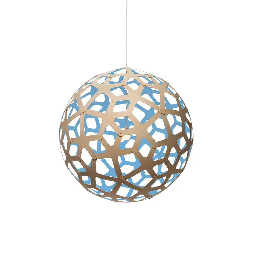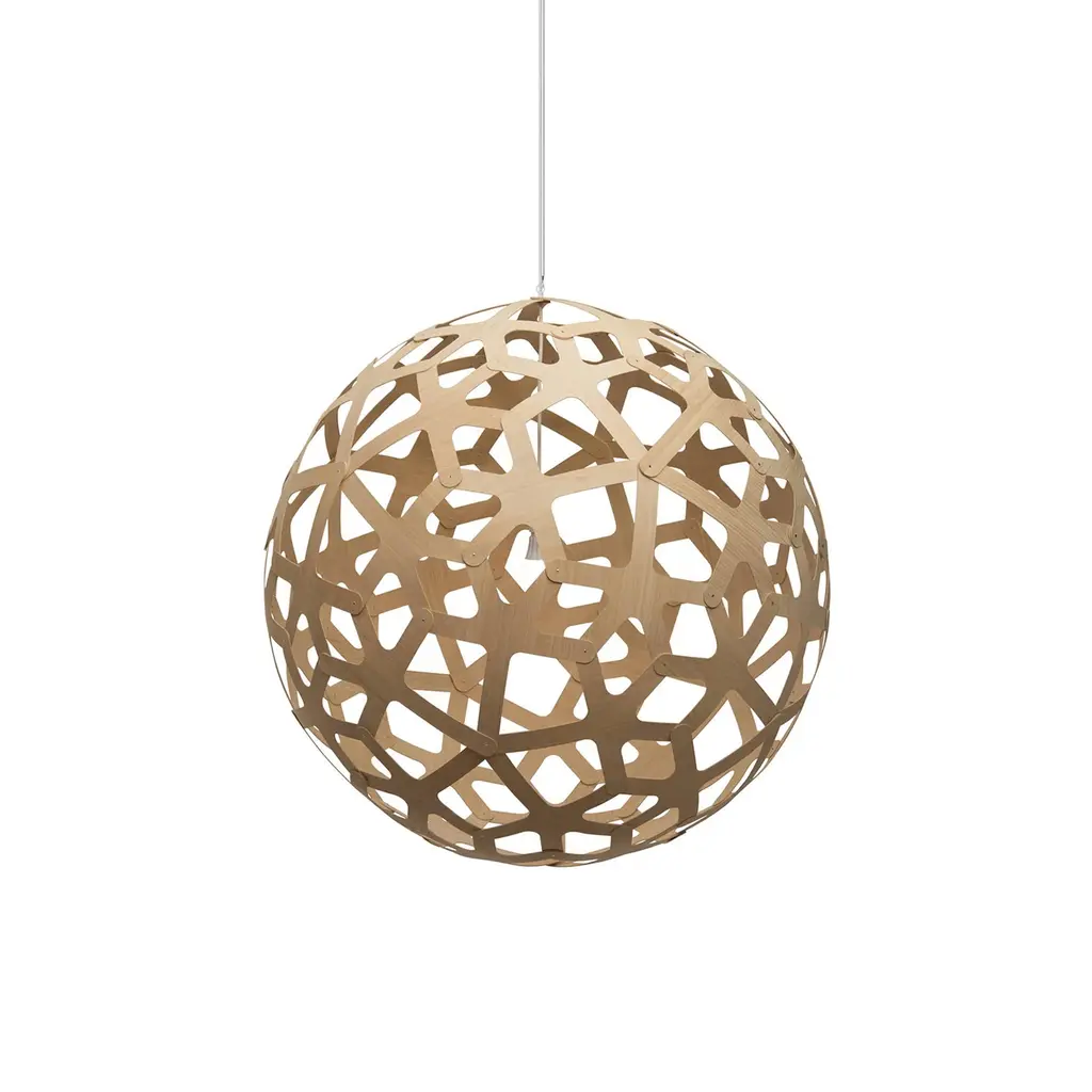The "fingers" of the geometric polyhedron structure of this lamp are reminiscent of the coral reefs David Trubridge explores off the coast of New Zealand. A love for earth drove the construction, flatpacked to reduce freight and packing resources. Identical pieces make home assembly a snap. The celebrated designing craftsman ended up in his adopted home after he, his wife and their two sons sold everything and set off on a yacht for a world adventure. It culminated in 1985 when they decided to remain there. While an artist-in-residence at Hawkes Bay Polytechnic (now EIT), he built a house and suddenly found himself with further commissions. Before realizing homes, lamps and furniture, David left Newcastle University in 1972 with a degree in Naval architecture. His work has appeared in countless museums, including the Victoria & Albert and the Pompidou Centre. That barely scratches the surface of his fascinating story and work ethos.