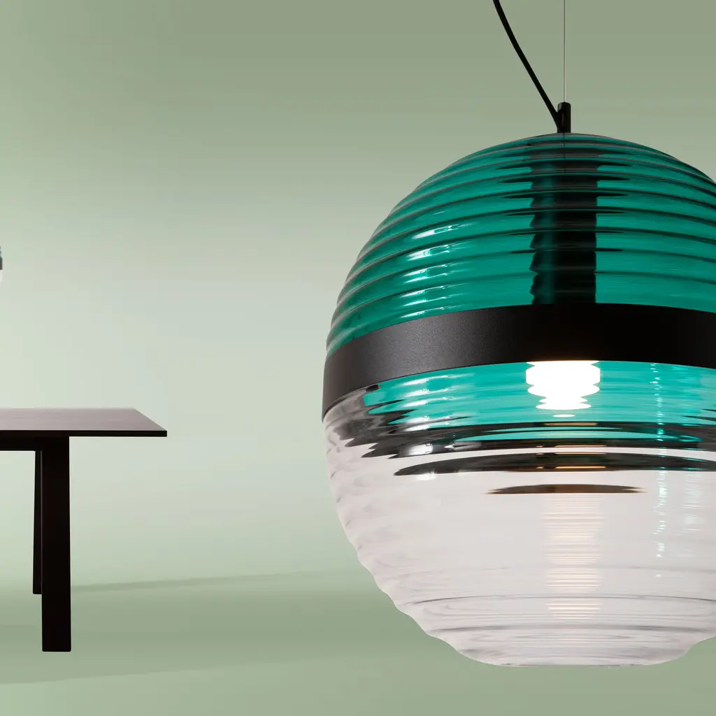 Experience the perfect balance of past and present with the Cord Pendant Light from Cappellini. Designed by Werner Aisslinger, this modern lamp features a two-tone blown glass sphere with an embossed metal ring in a matte black finish. Expertly crafted by glassmakers, the alternating colors and transparencies provide warm, enveloping light, perfect above a dining table or kitchen island. Elevate your space with this unique and elegant pendant light. Highlights
