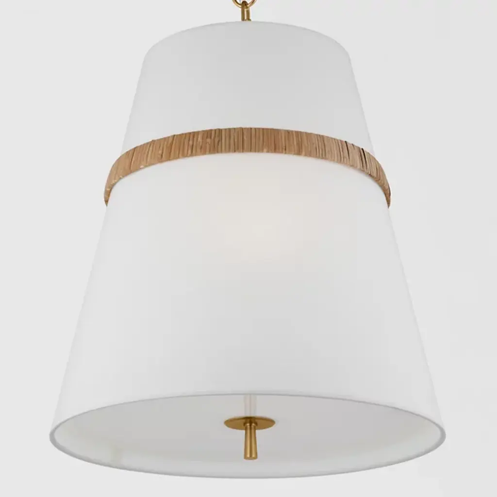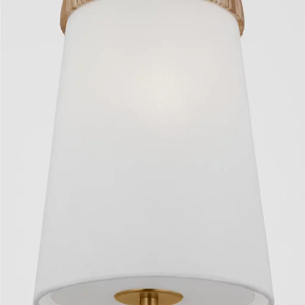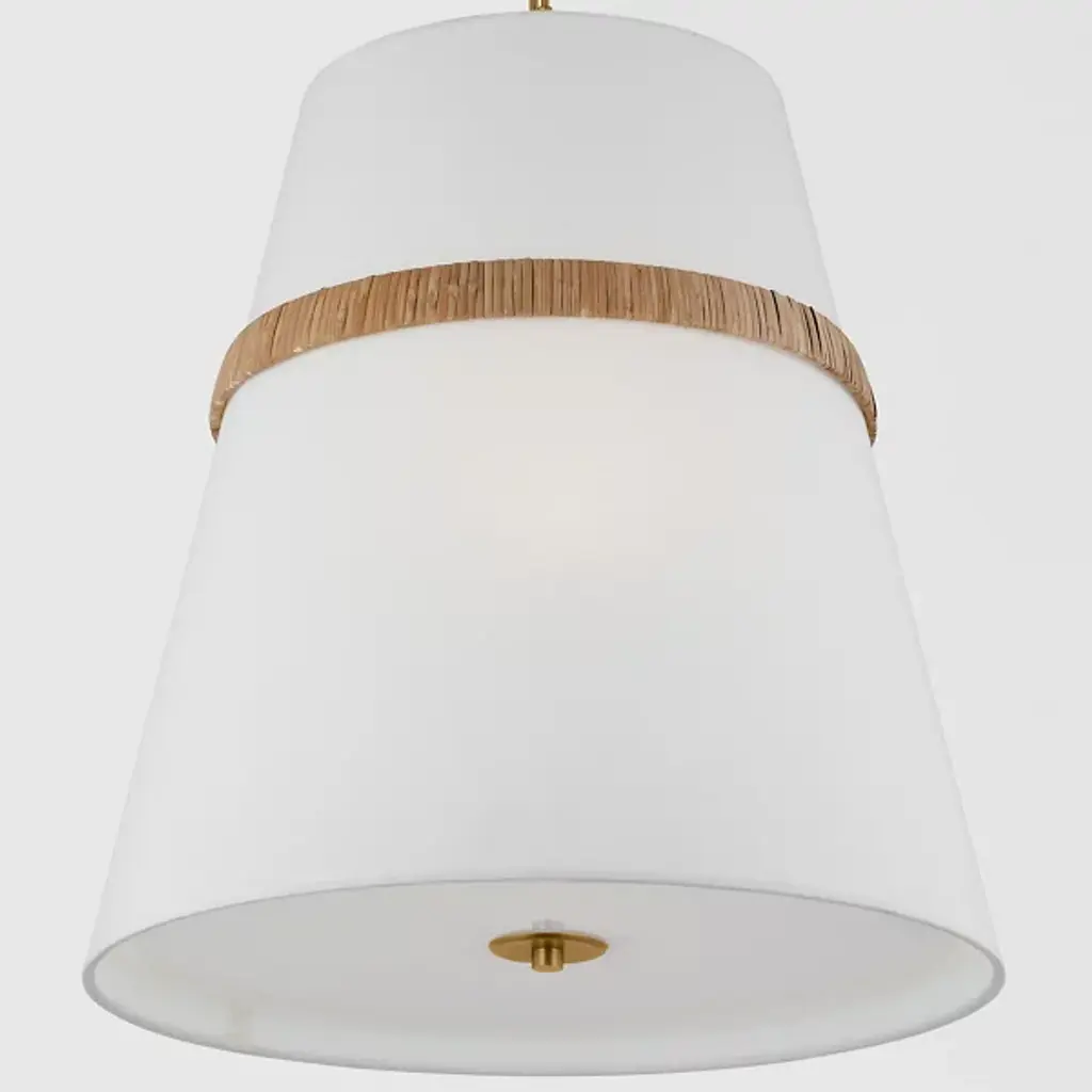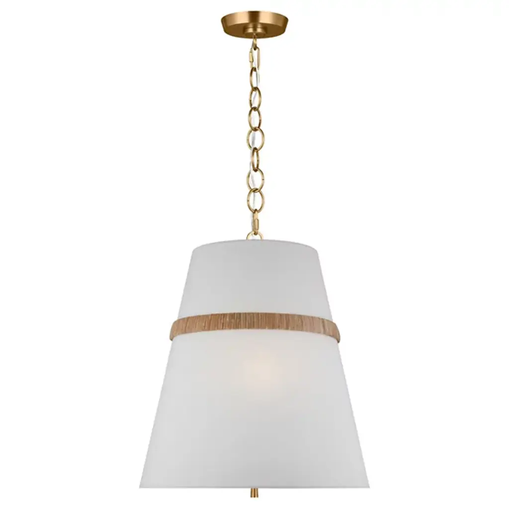 The Cordtlandt Pendant from Visual Comfort Studio is an exquisite light fixture designed by Alexa Hampton. This pendant boasts a contemporary elegance, featuring a chain of rings securely attached to a ceiling canopy. Suspended from these rings is a tapered linen shade, delicately tempering the brilliant LED illumination. The gorgeous banding surrounding the shade accentuates the pendant’s contemporary aesthetic. You can adjust the brightness level with ease using a separately sold ELV dimmer.