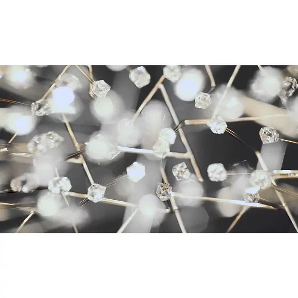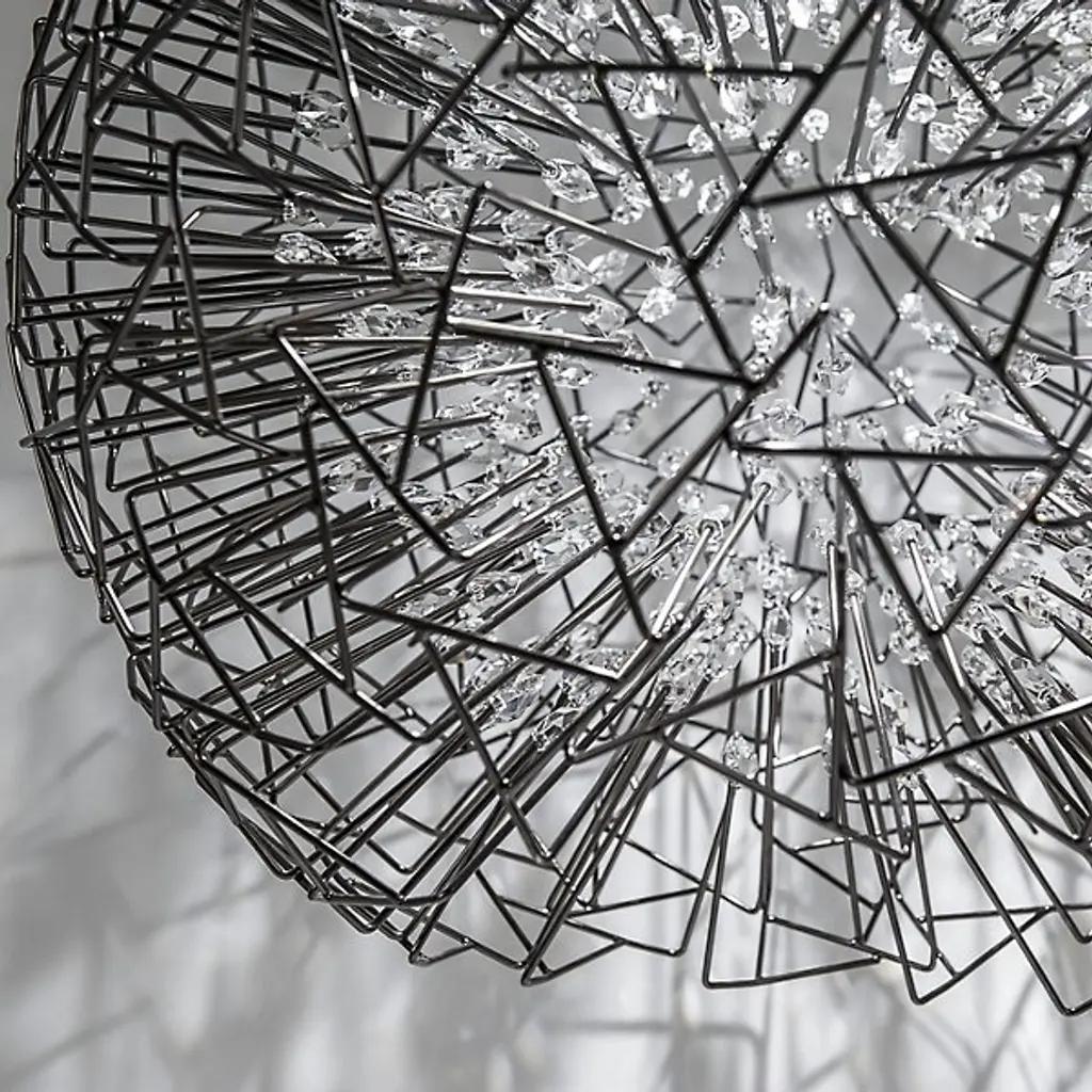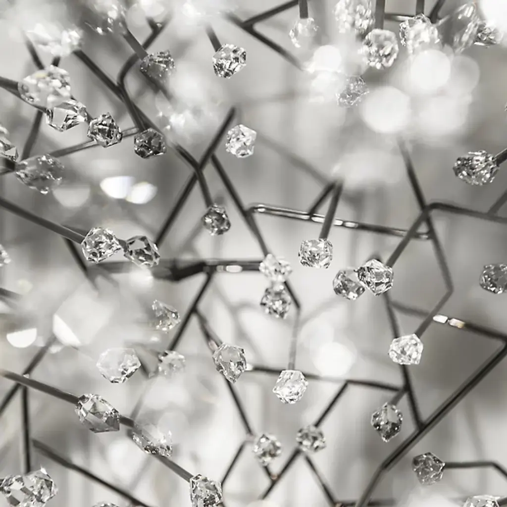 The Terzani Core LED Pendant is quite dazzling at its center, focusing a beam of LED light through a mass of crystal beads that are held steadily within a geometric metal frame. The angular rods of iron create a natural barrier between the outer structure and the precious core, creating dynamic patterns of light around the fixture once lit. The open frame allows a lot of light to flood through, performing functional needs above a dining room table with the benefit of casting a unique type of diffused light.