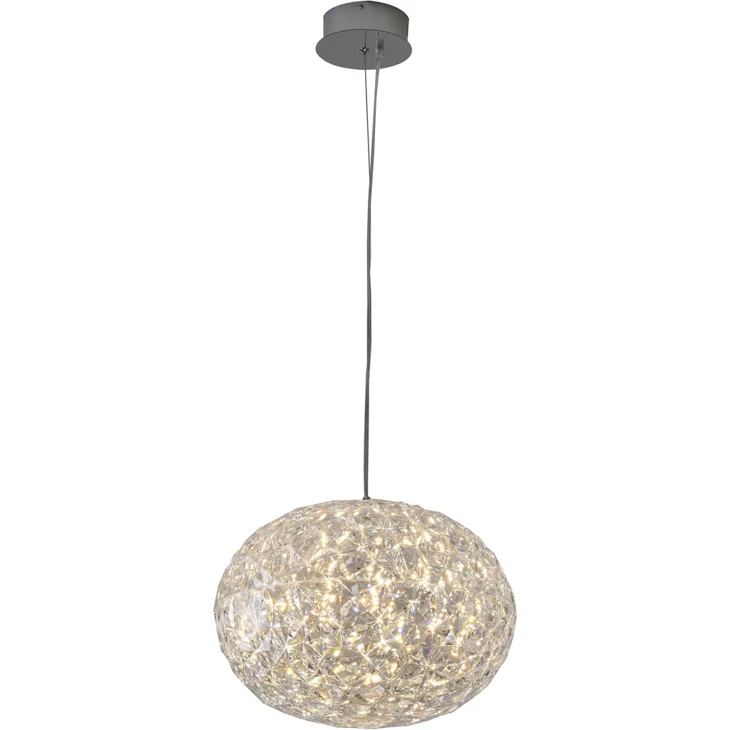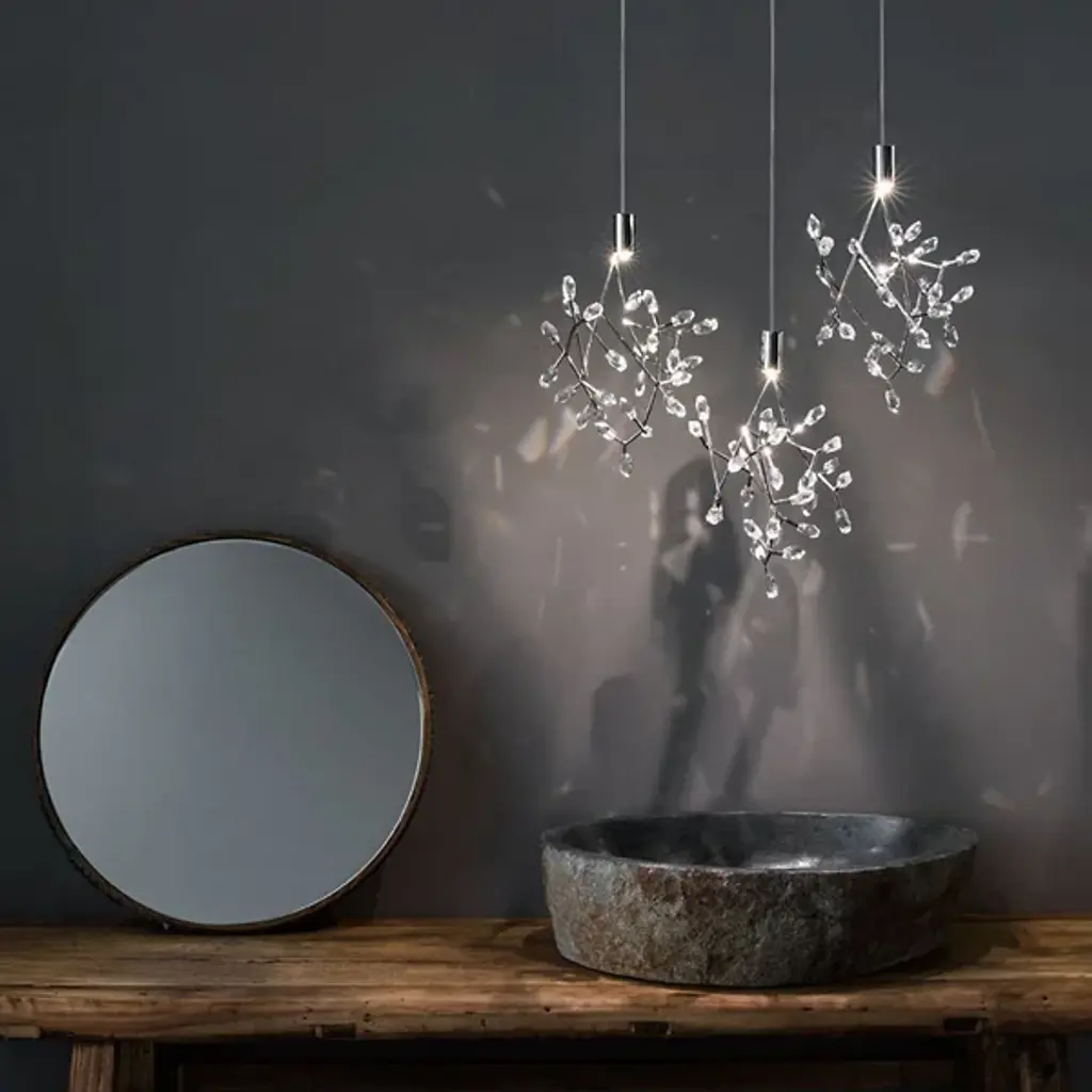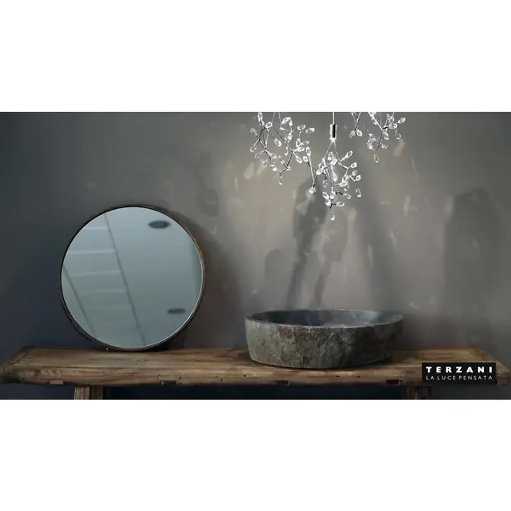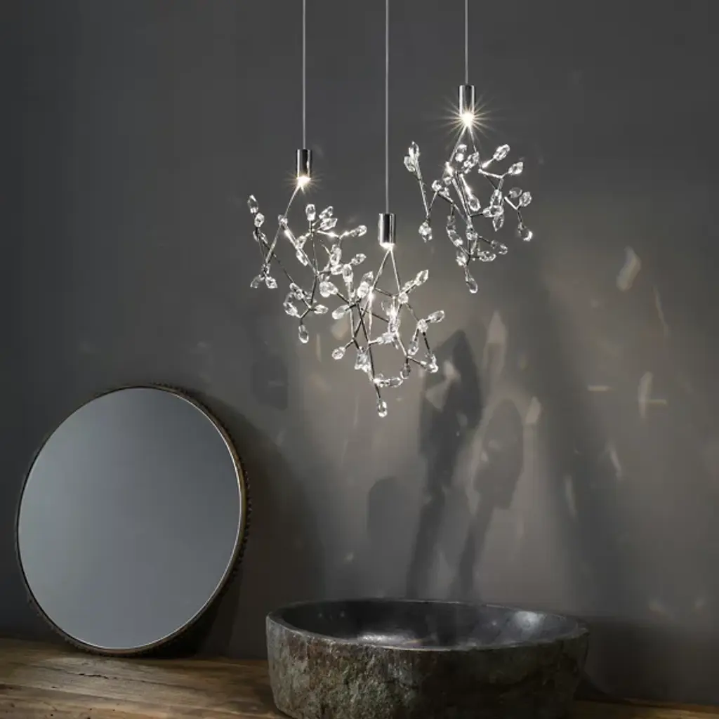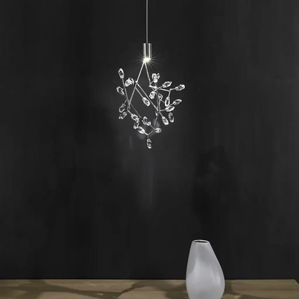 A little eruption of light for luxurious spaces. The Core Small LED Pendant by Terzani features a seemingly random constellation of faceted Crystals connected by delicate Brass arms. A sharp beam of LED light is focused downward, breaking apart as it travels through the already shimmering crystals. The result is a magical, prismatic play of light across the walls, ceiling and downward onto whatever surface the pendant hangs above. The visual delicacy of this pendant, especially when paired with its dramatic light show, makes it a stunning choice for installation in a row or cluster over a glamorous dining table or kitchen island.