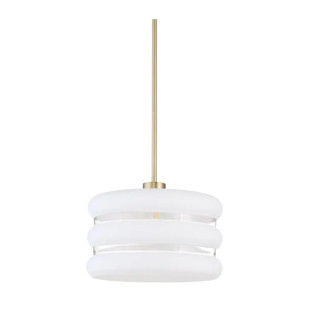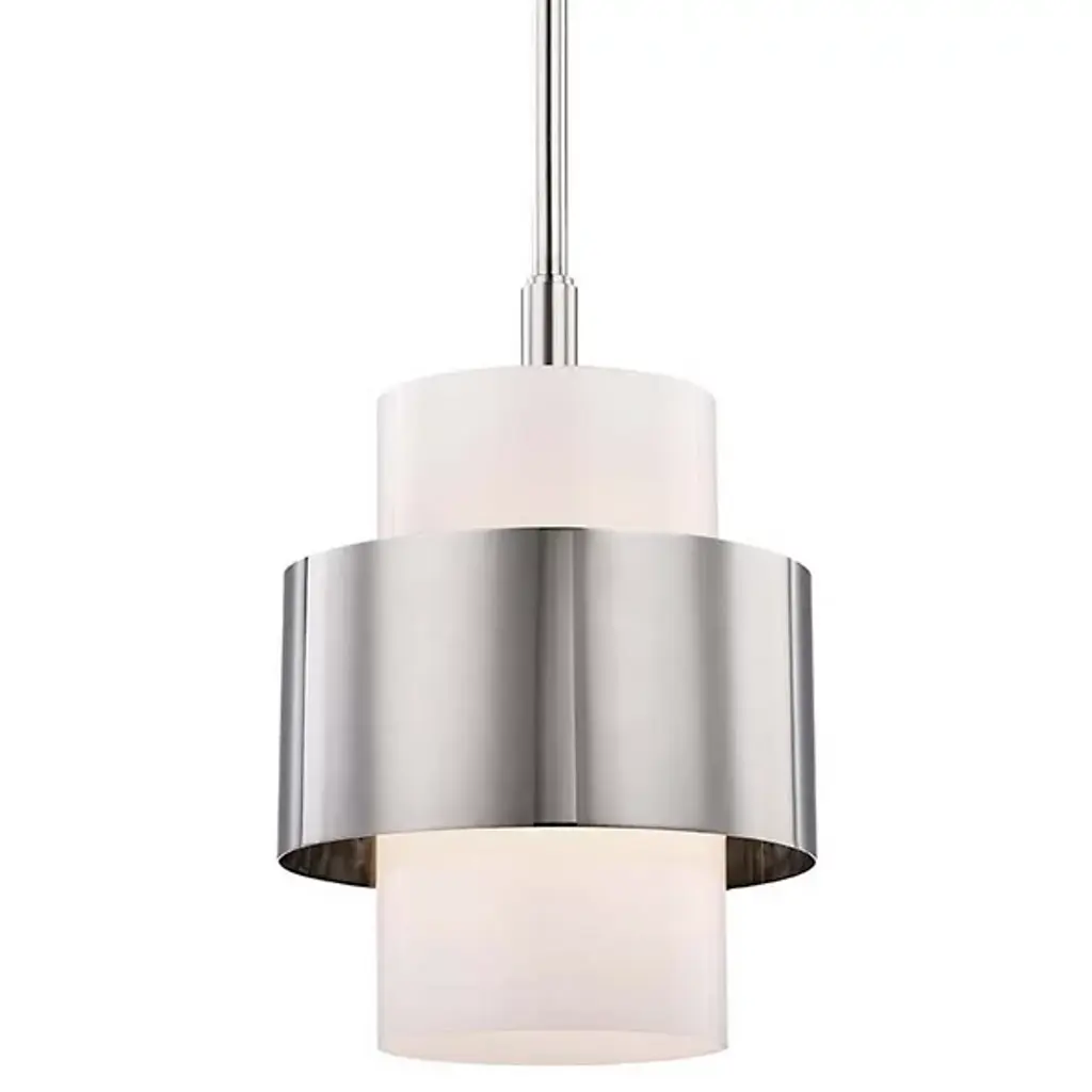 Clean, curvy and contemporary. Ensconced in a round, open canopy made of Metal, the Corinth Pendant by Hudson Valley Lighting adds plenty of style and light to the entryway, dining space or in multiples above a kitchen island. Crafted of Opal Shiny Glass, an inner cylindrical shade rests below the canopy by a few inches, diffusing an even ray of light from within. The offset Metal band offers a sleek contrast to the center shade and creates a minimalist design perfect for any modern or contemporary home. An incandescent bulb fixed to an E26 medium base powers the piece, casting a soft, white glow on its surroundings.