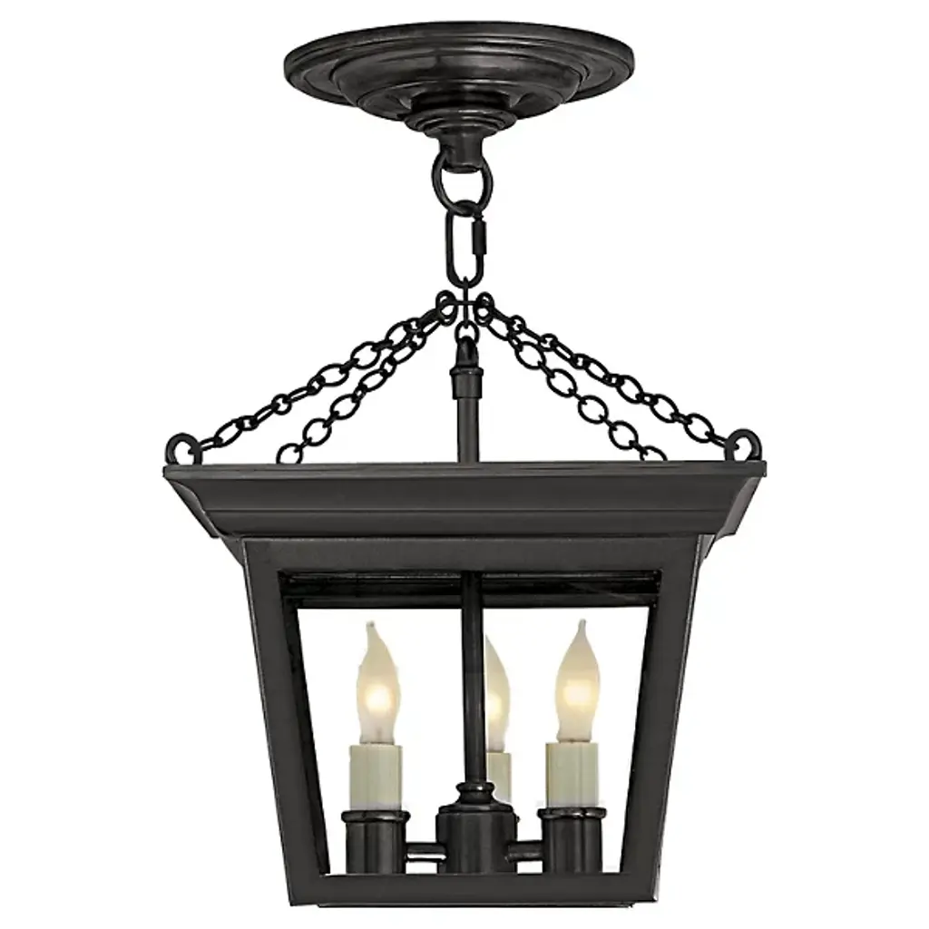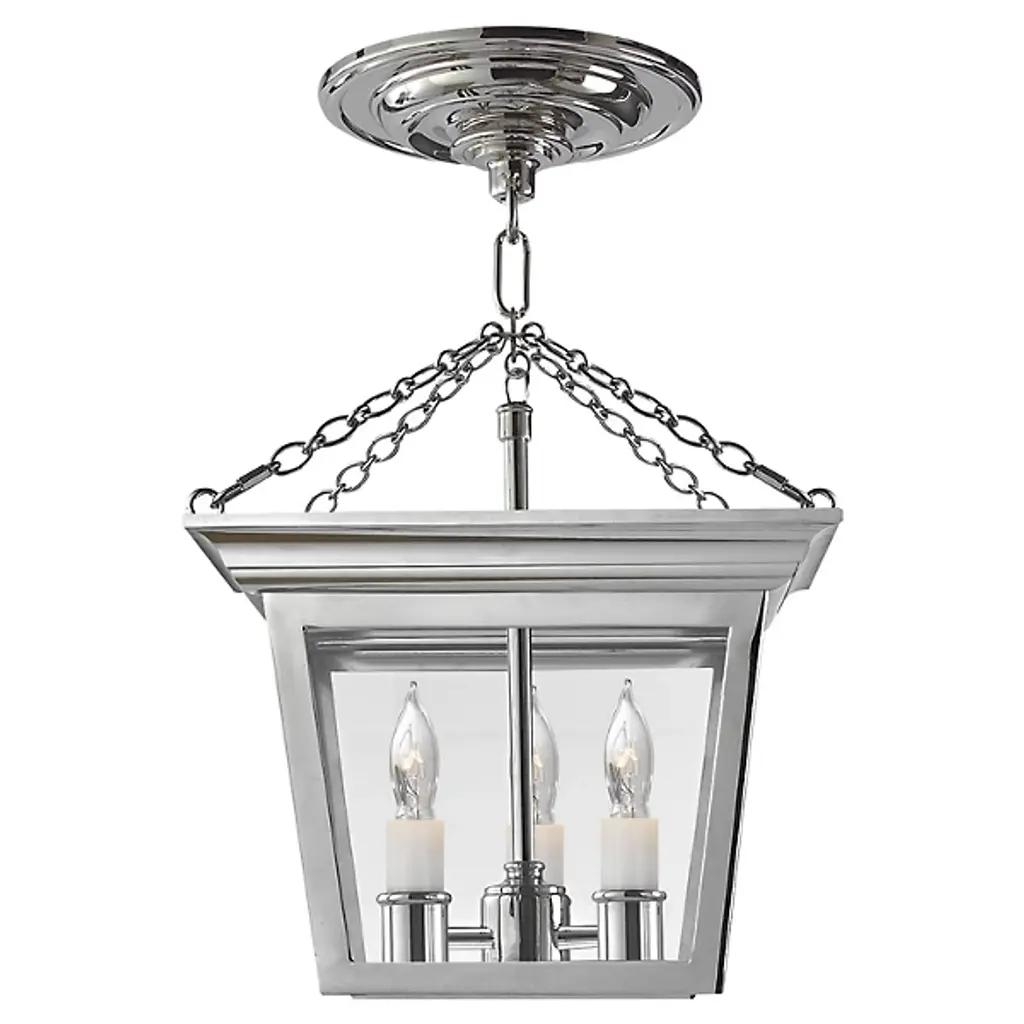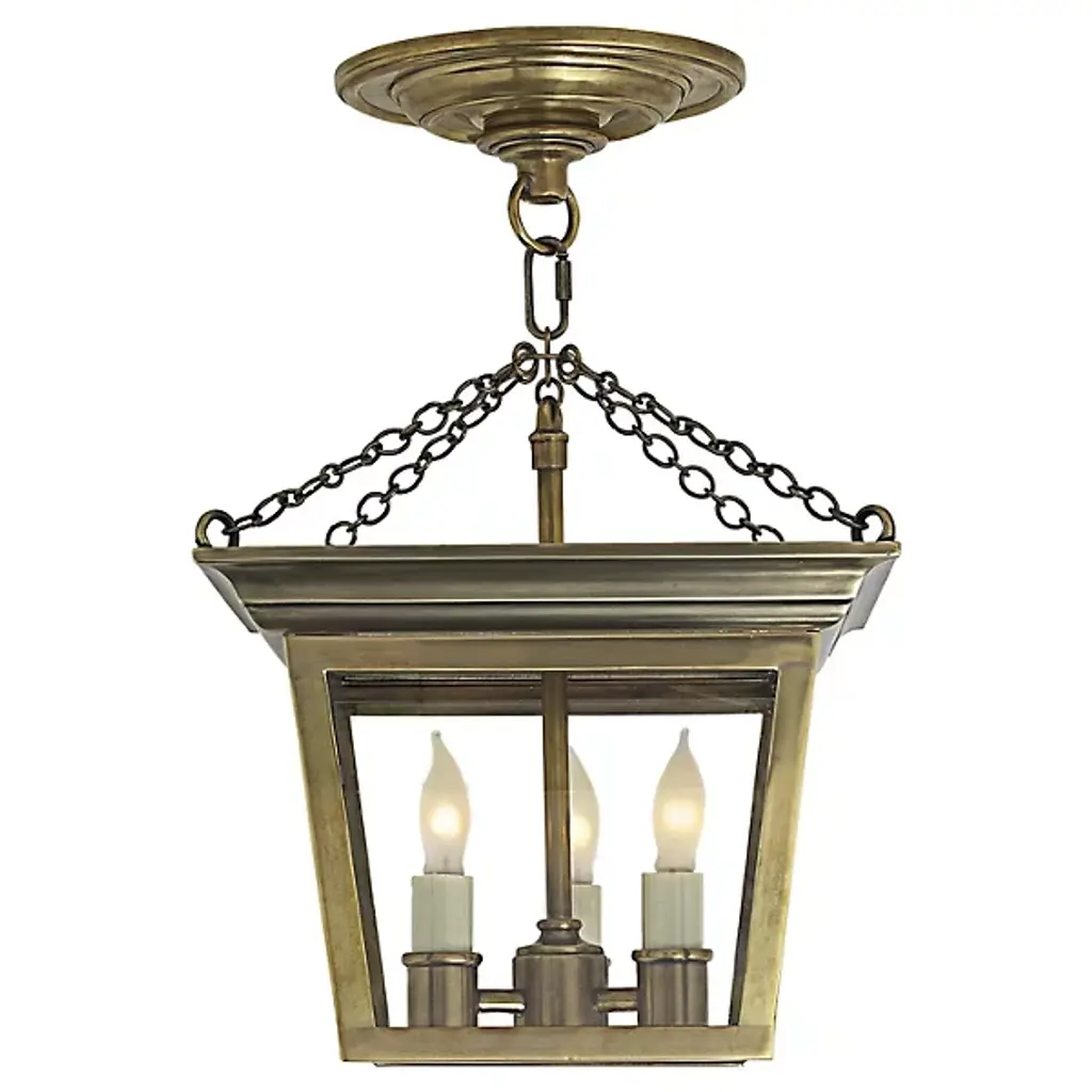 A charming lantern-inspired fixture for both indoor and outdoor settings. The Cornice Semi-Flushmount by Visual Comfort Signature, formerly known as Visual Comfort, features a traditional silhouette complete with decorative framework (and chain accents), tapered Clear glass panels, and an internal candelabra. When lit, these decorative elements blend beautifully, creating a warm ambiance that will make your house feel more like a home.