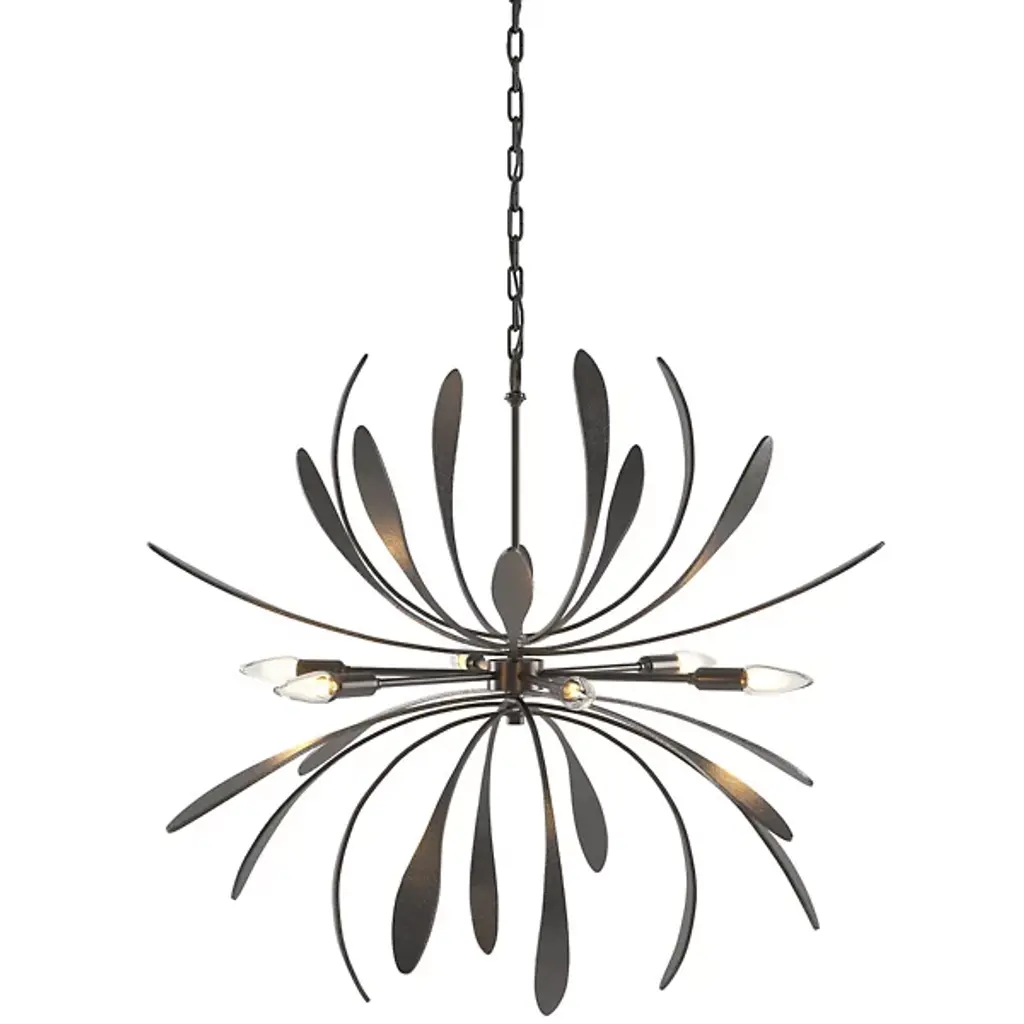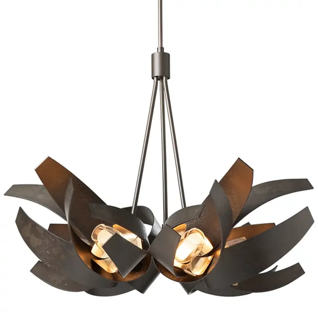 Raw, robust, and romantic. The Corona Brass Accent Pendant by Hubbardton Forge evokes natural beauty through its handcrafted steel framework and delicate brass embellishments. A series of slender downrods suspend the piece, with a cluster of flared steel panels forming petal-like forms around an inner light source. A flowering brass element creates the base for each glass shade, elegantly reflecting its light and adding a beautiful balance to the textural outer steel around it.