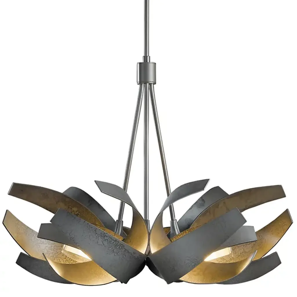 Raw, robust, and romantic. The Corona Brass Accent Pendant by Hubbardton Forge evokes natural beauty through its handcrafted steel framework and delicate brass embellishments. A series of slender downrods suspend the piece, with a cluster of flared steel panels forming petal-like forms around an inner light source. A flowering brass element creates the base for each glass shade, elegantly reflecting its light and adding a beautiful balance to the textural outer steel around it.