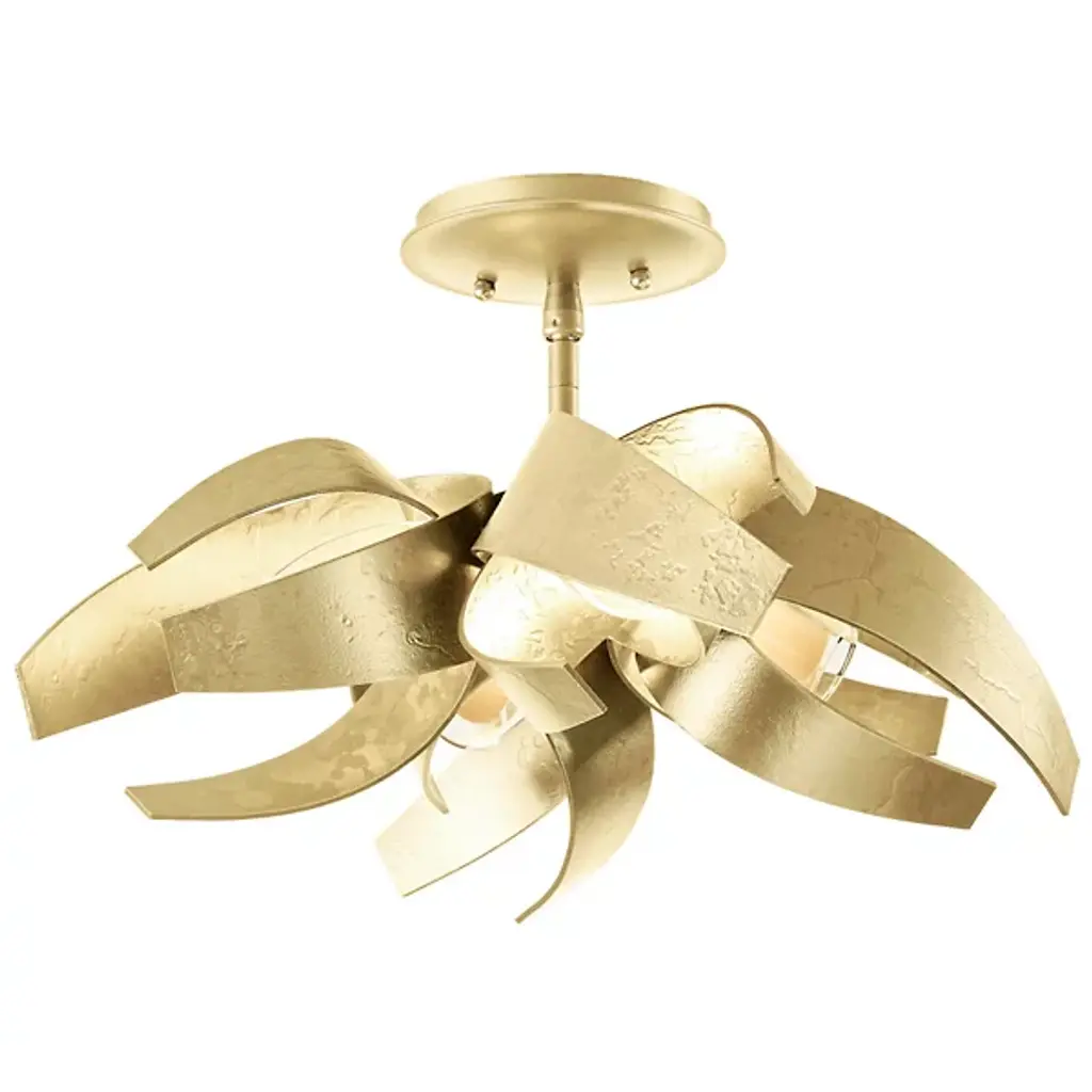 The Hubbardton Forge Corona Semi-Flushmount adds some real flair to the space with its hand forged wrought iron bands all taking their individual twists and turns. Nestled inside are glass shades containing the light source, the illumination piercing through the openings in the iron. Unique and dynamic, this piece is sure to brighten your space with more than just illumination.