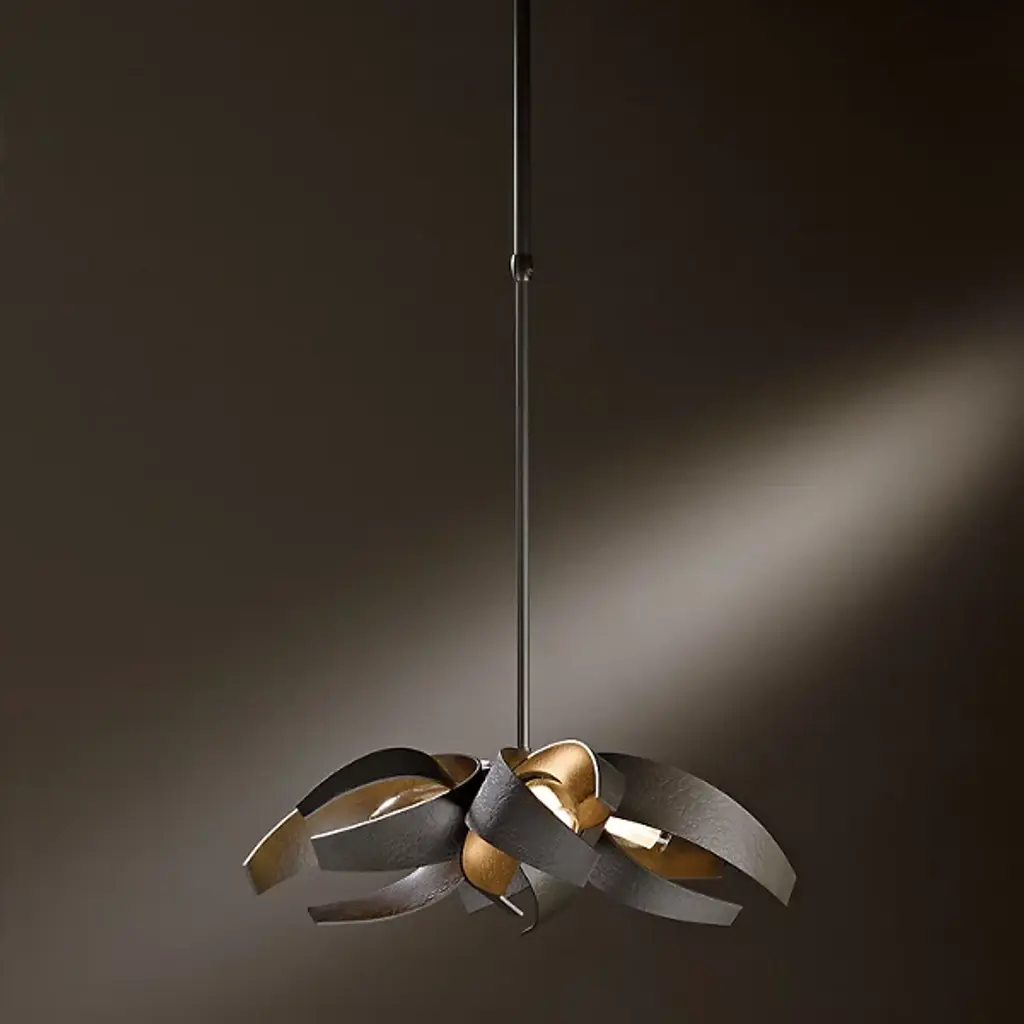 The Hubbardton Forge Corona Small Pendant will add some real flare to your living space with its dynamic curves and unique shape. Named after the aura of plasma that surrounds celestial bodies, the illumination peaks through the hand crafted iron, surrounding your living space in a wash of light. The illumination is diffused through glass shades with a frosted interior, which remain tucked in between the curved iron pieces.