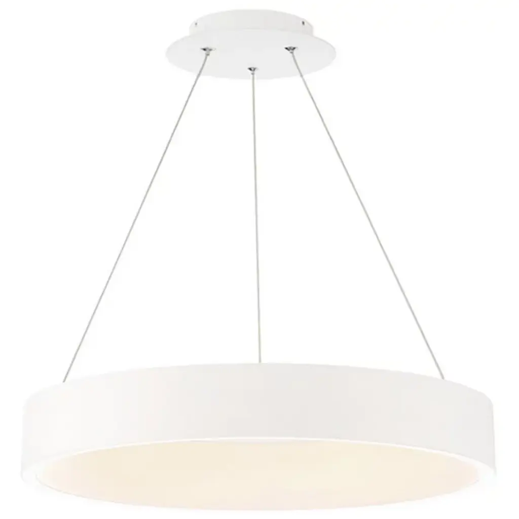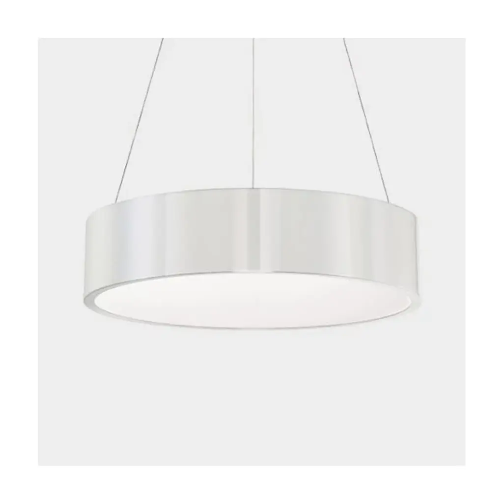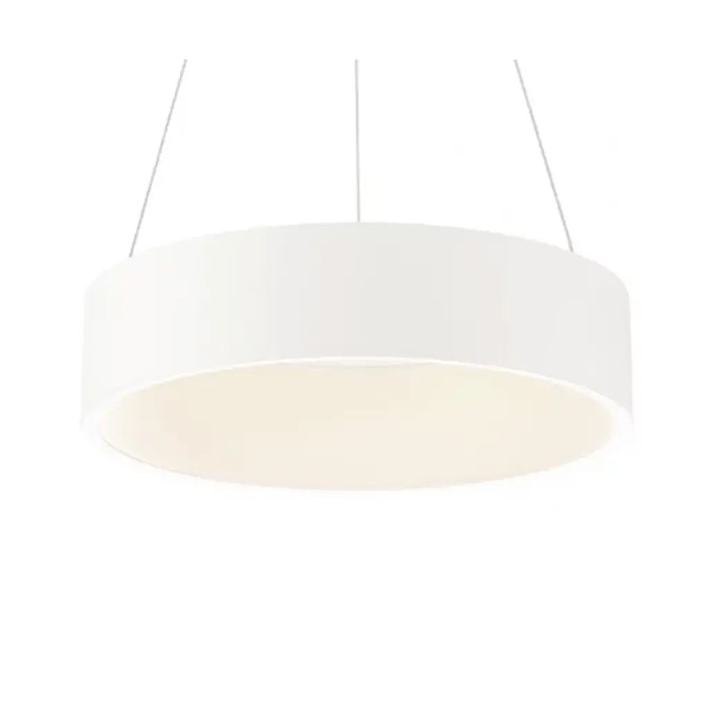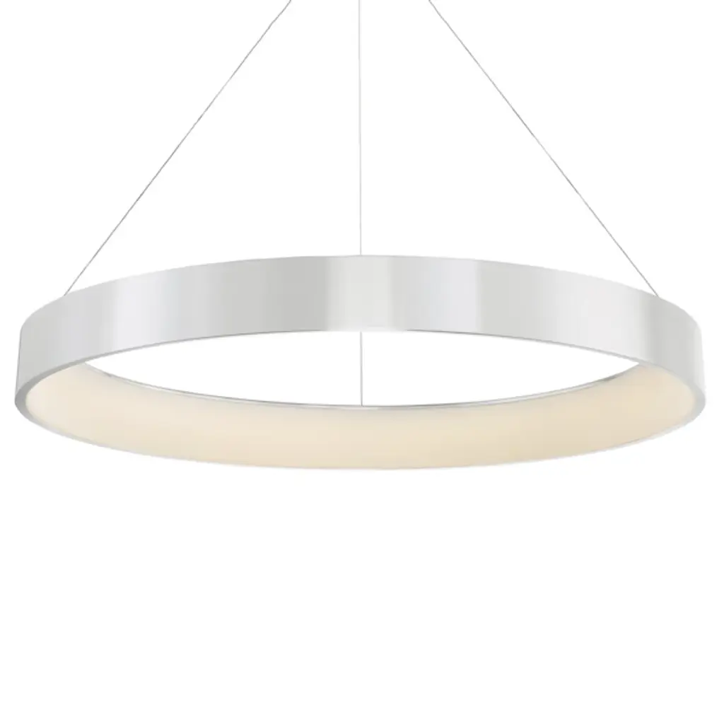 The Corso LED Pendant by dweLED provides minimalist contemporary lighting fit for residential and commercial settings. Its sleek, haloed form consists of a spun Metal body whose interior is lined with a Frosted Acrylic diffuser and high powered LEDs. Three near-invisible cables provide both power and support, giving the fixture a pleasant free-floating aesthetic.