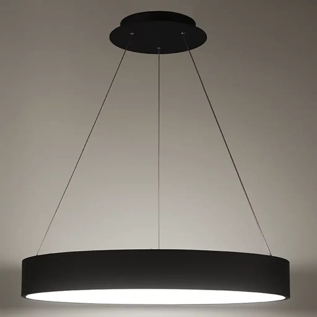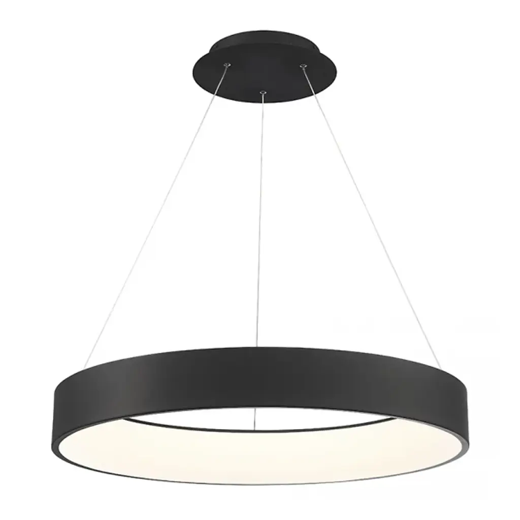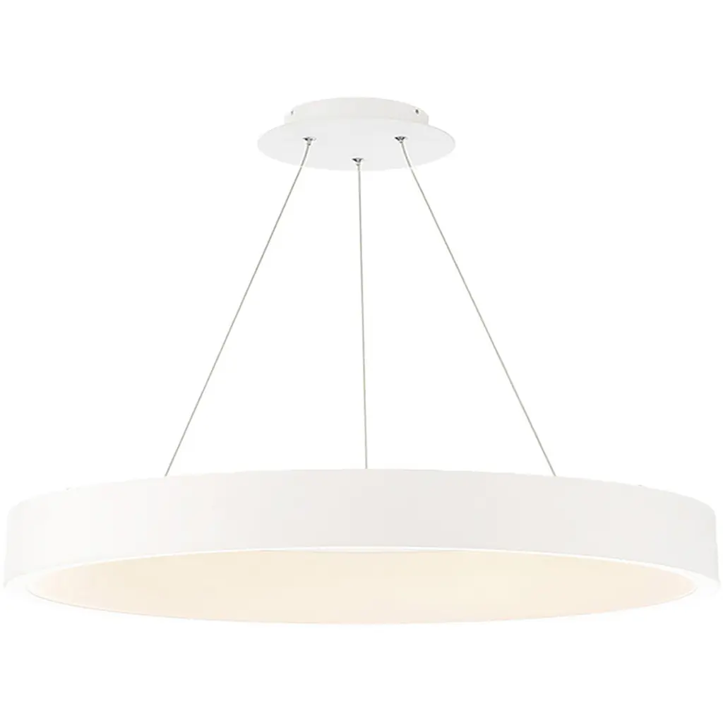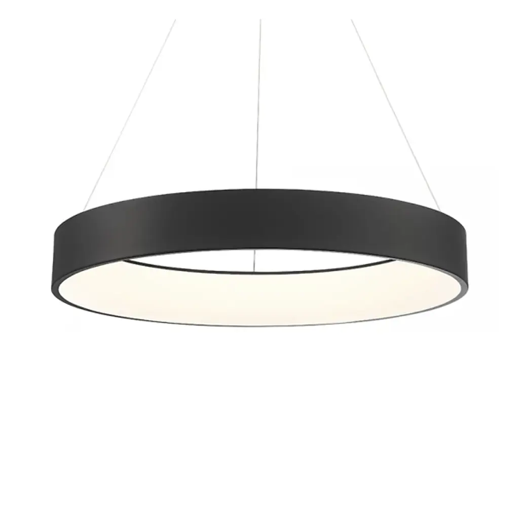 The Corso LED Pendant by dweLED provides minimalist contemporary lighting fit for residential and commercial settings. Its sleek, haloed form consists of a spun Metal body whose interior is lined with a Frosted Acrylic diffuser and high powered LEDs. Three near-invisible cables provide both power and support, giving the fixture a pleasant free-floating aesthetic.